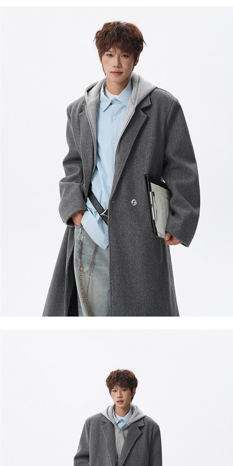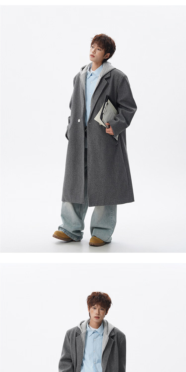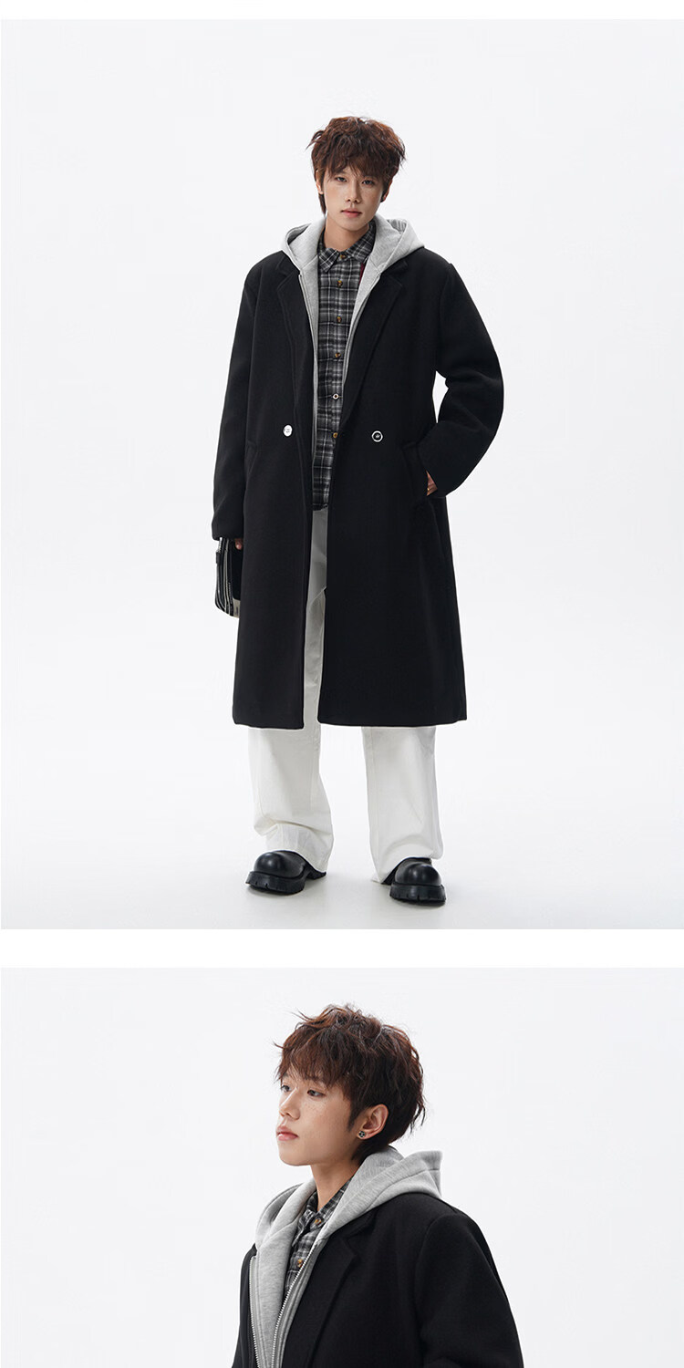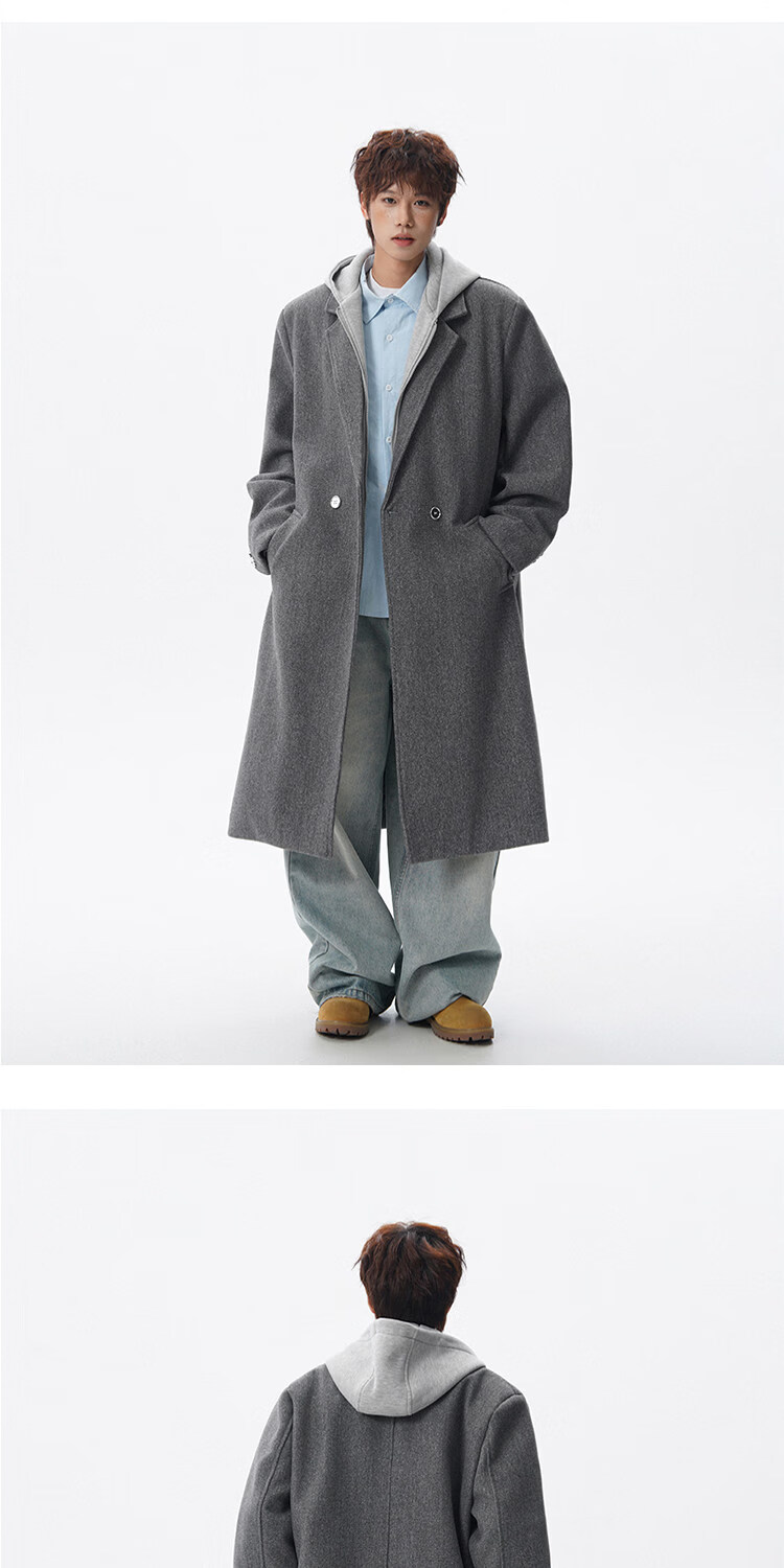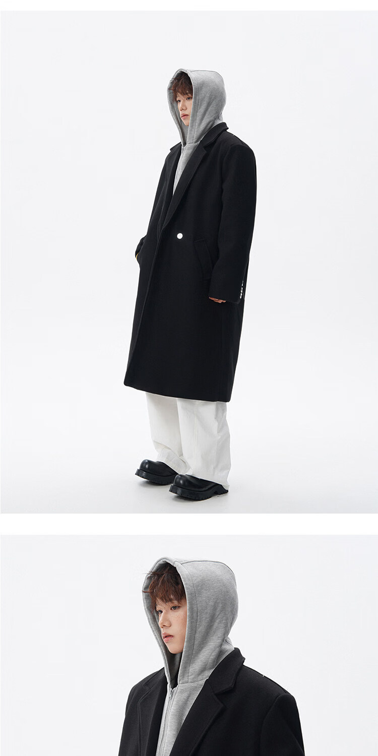 NEW OR MODE假两件高级感毛呢大衣男士冬季新款可拆卸连帽中长款过膝加棉外套 黑色夹棉 M 【建议90-110斤】