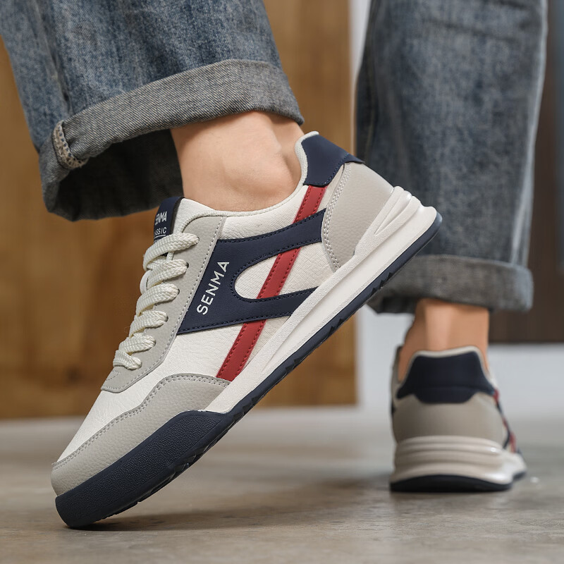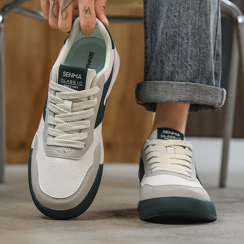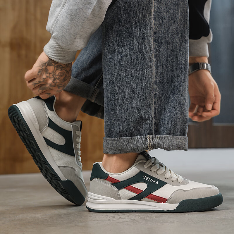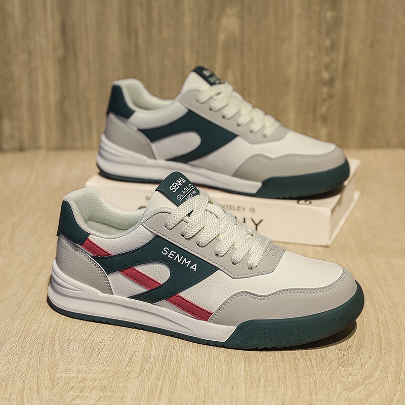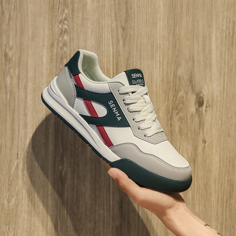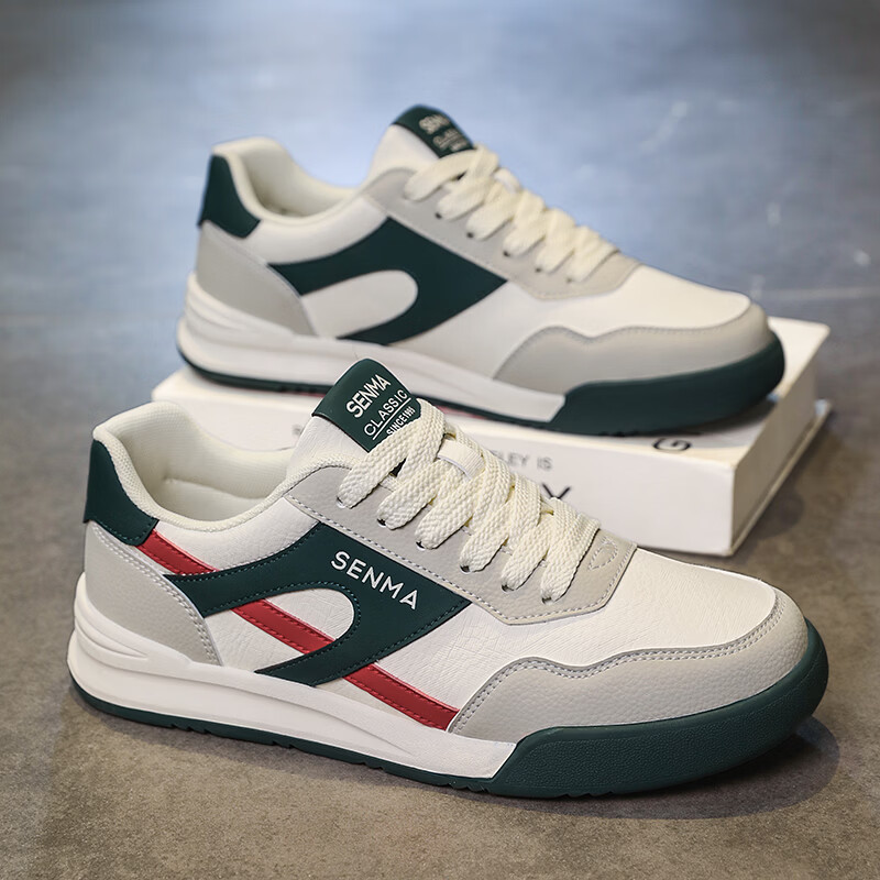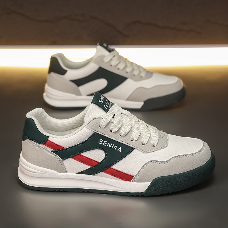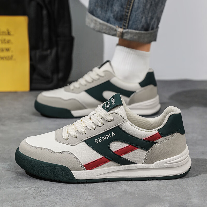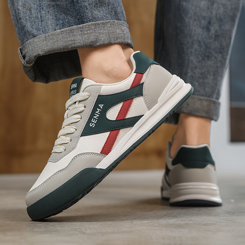 森馬男鞋春季2026新款防滑防臭软底休闲板鞋男士韩版百搭皮面运动潮鞋 米绿红【基础款】 39 标准码数/现货秒发