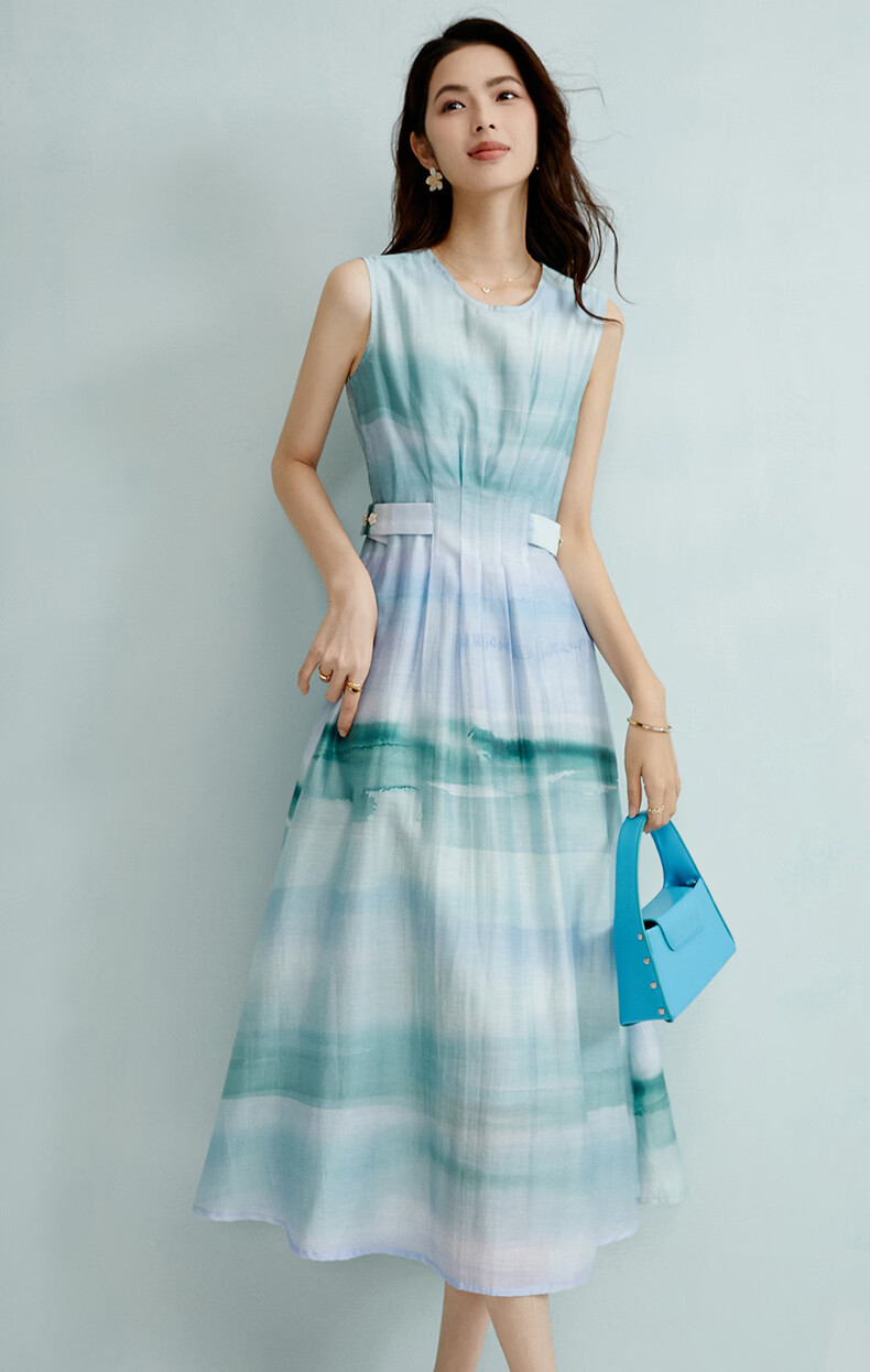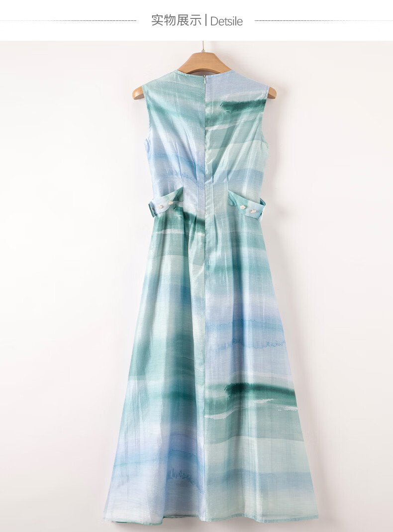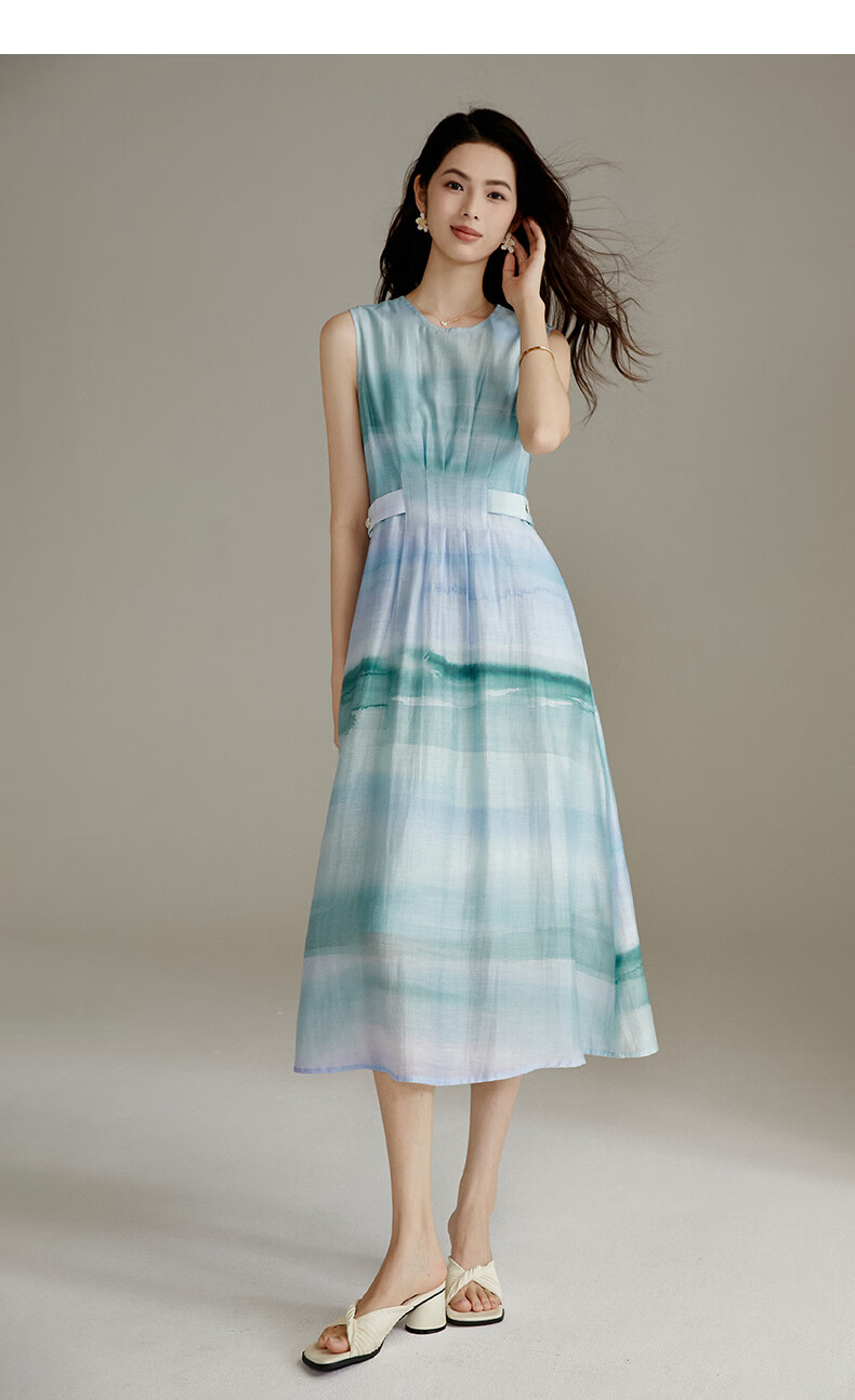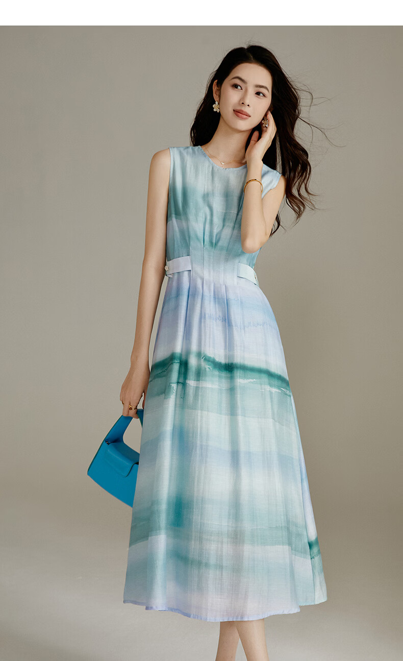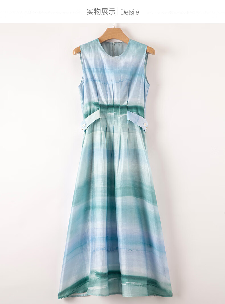 晚白2026年春夏款时尚晕染高腰长裙亲肤柔滑莱赛尔无袖连衣裙 蓝绿色 S