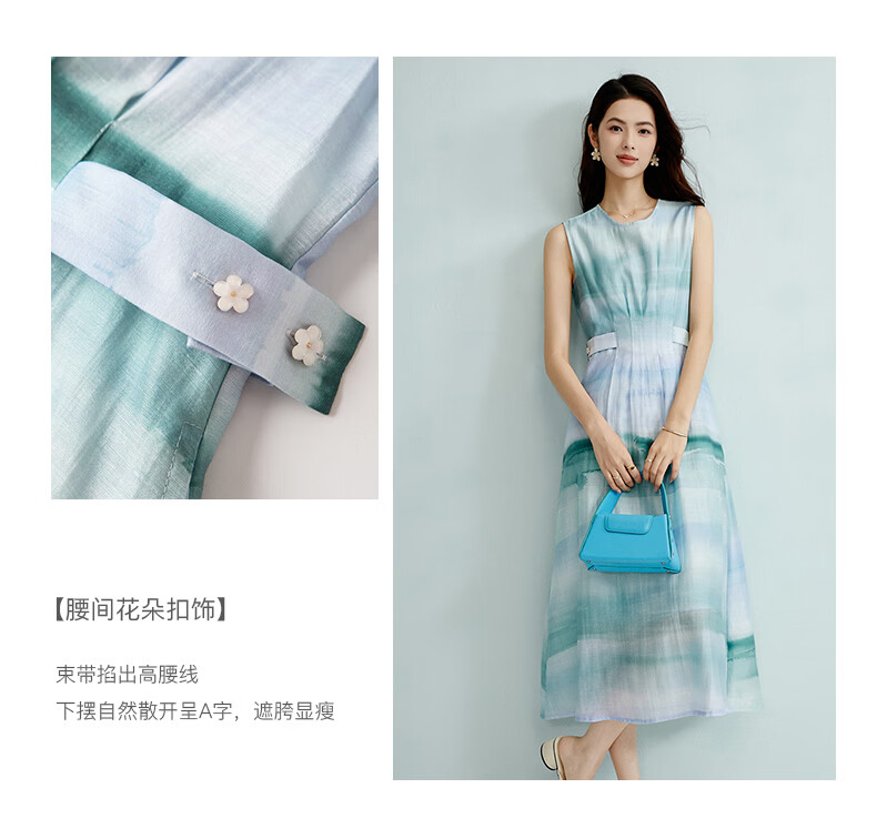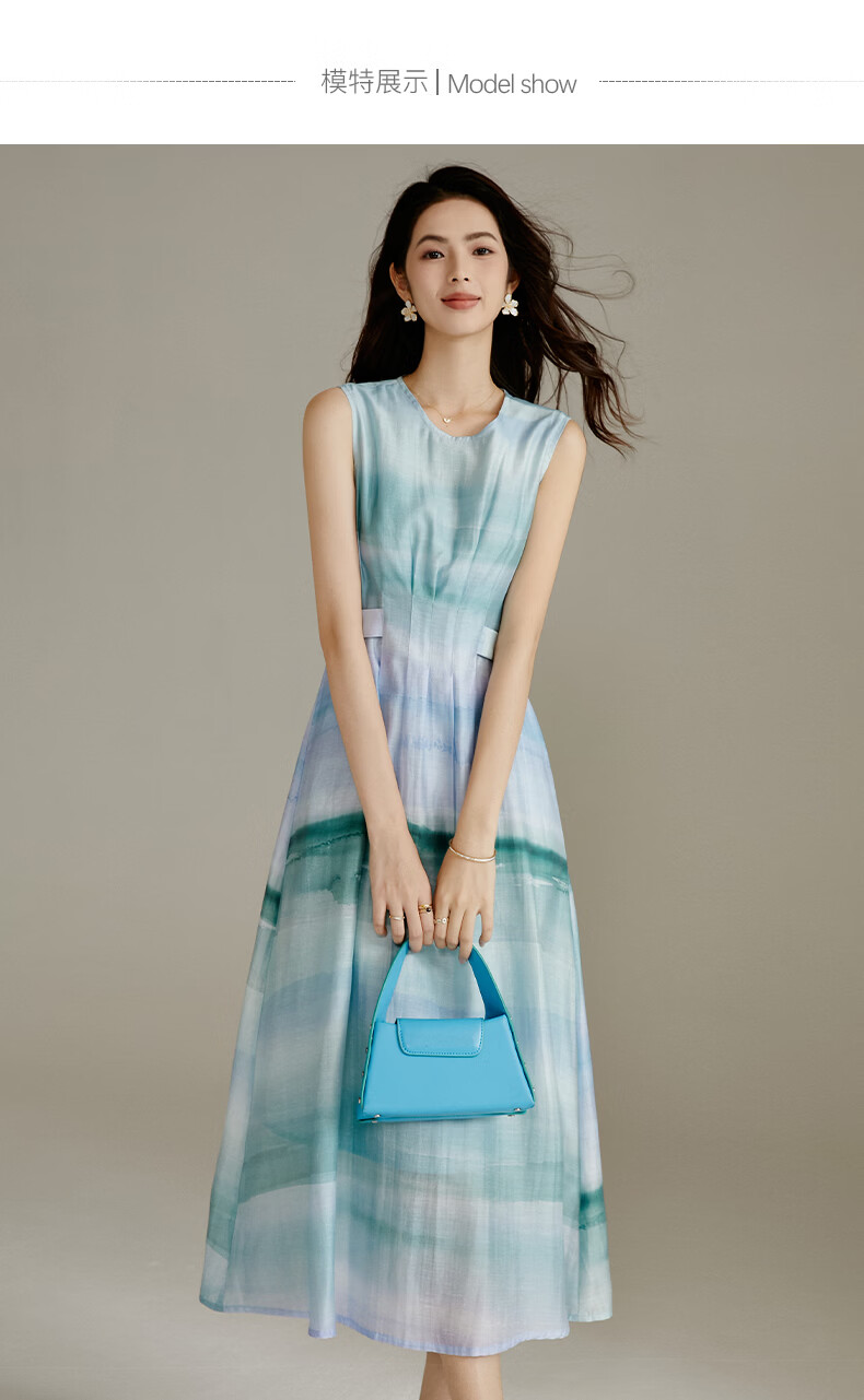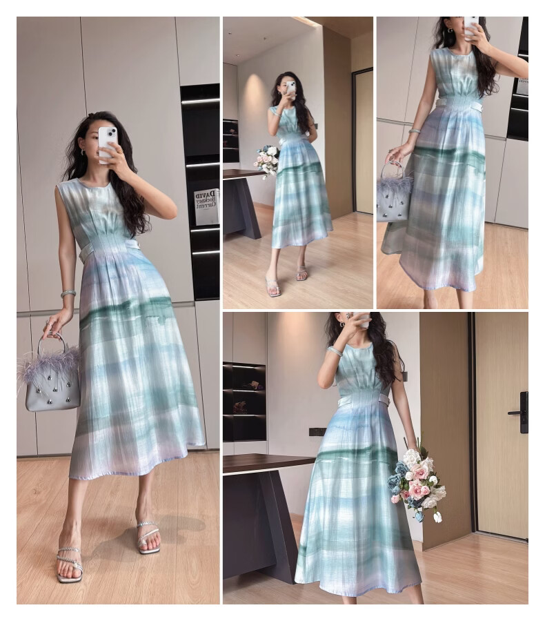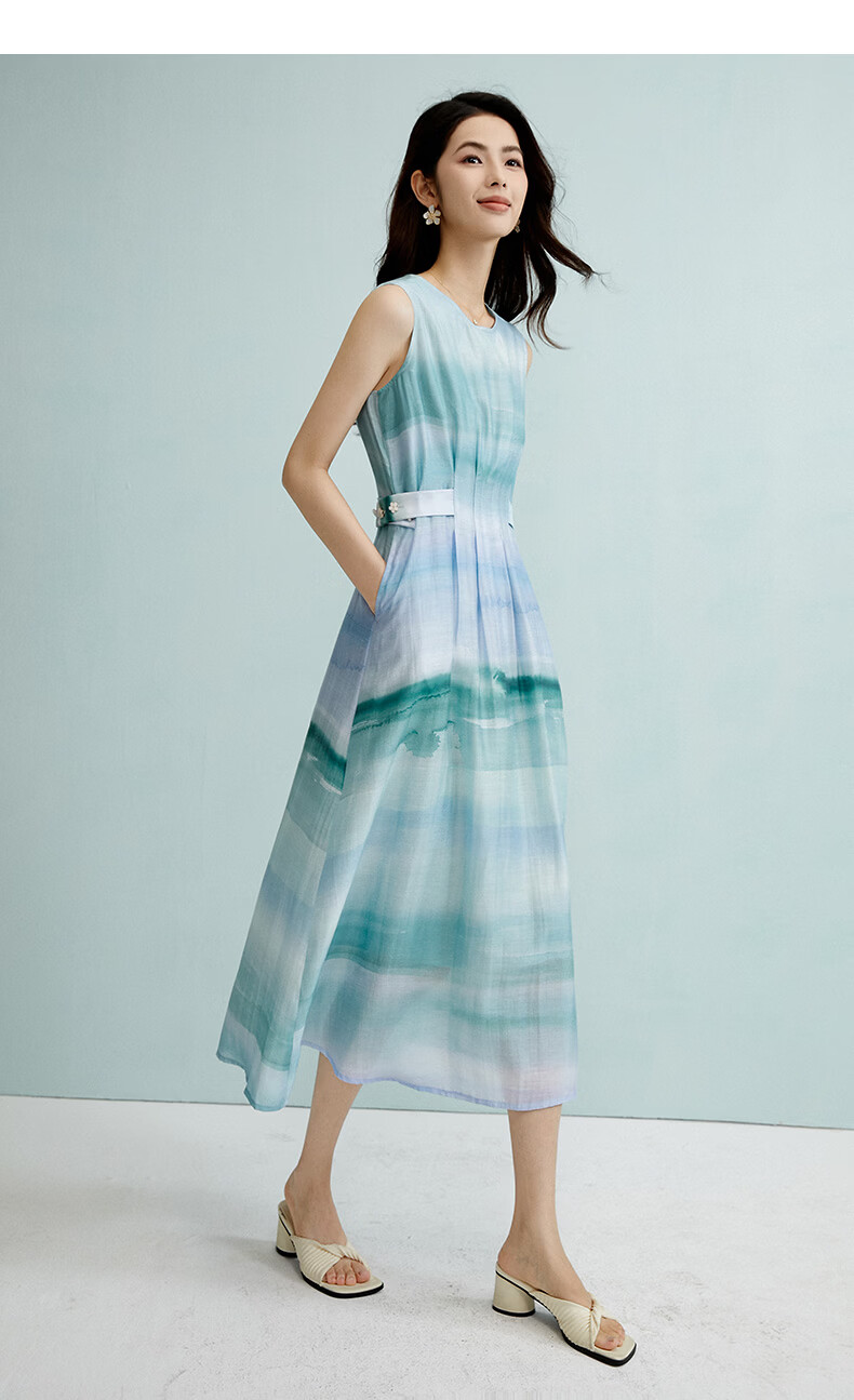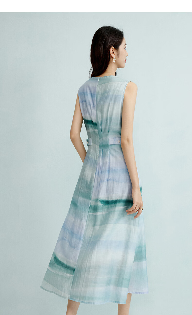 晚白2026年春夏款时尚晕染高腰长裙亲肤柔滑莱赛尔无袖连衣裙 蓝绿色 S