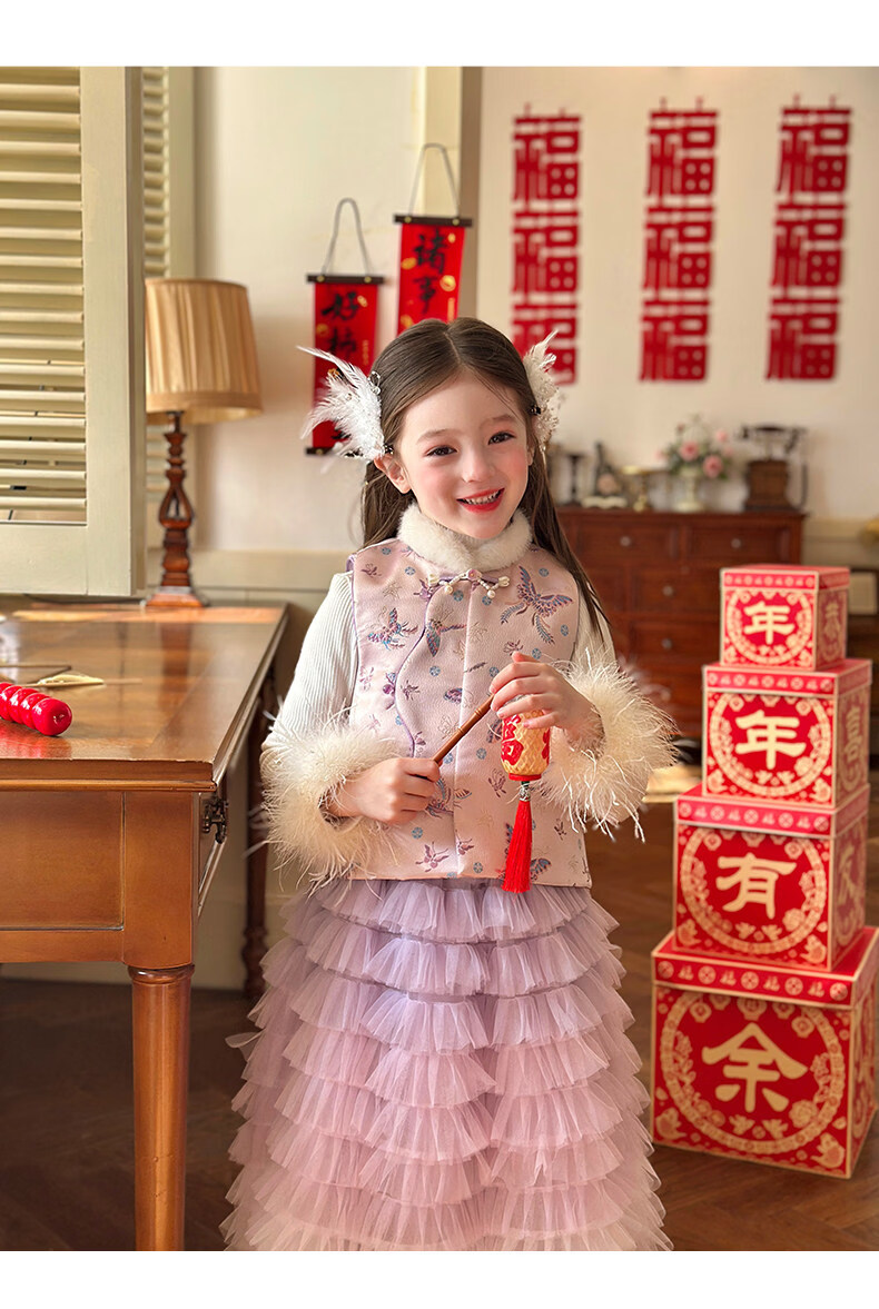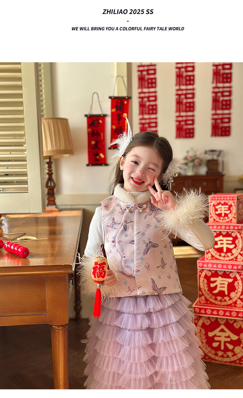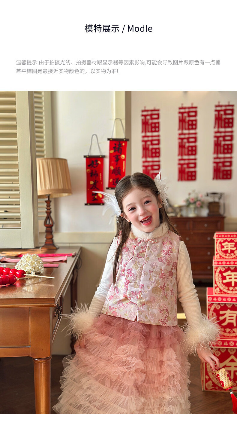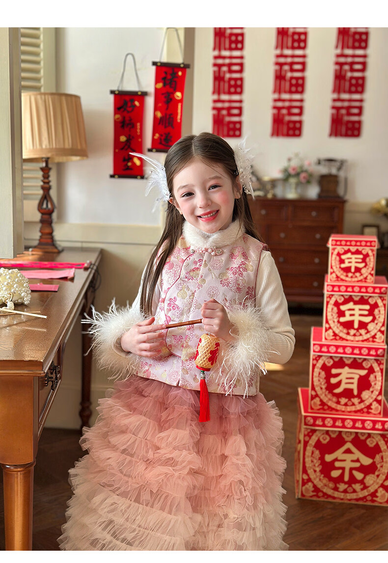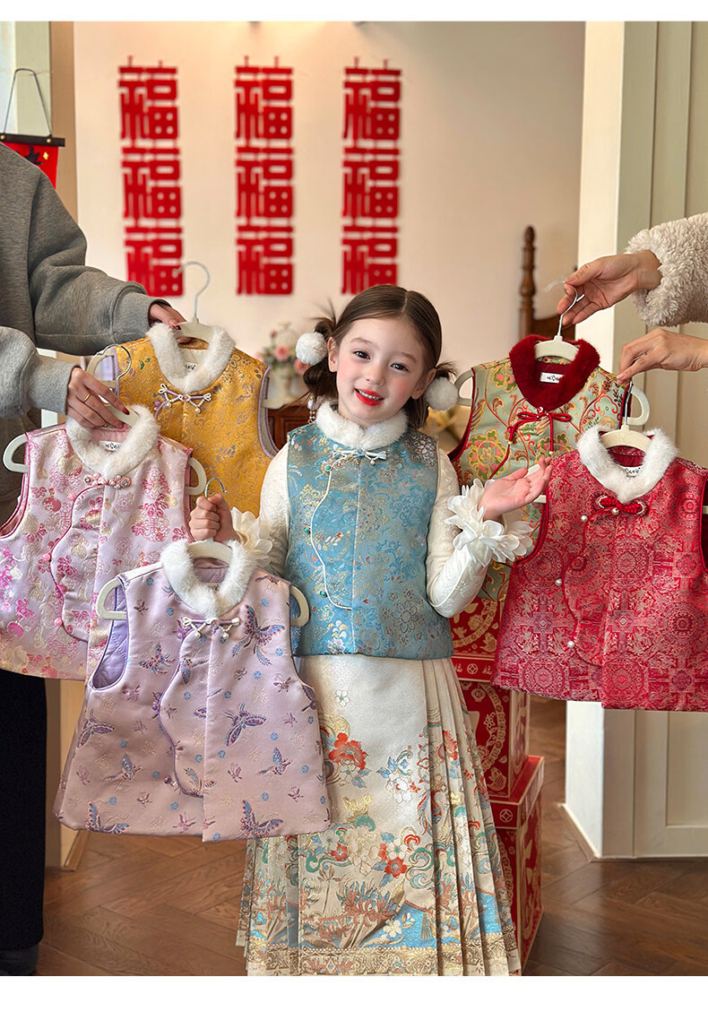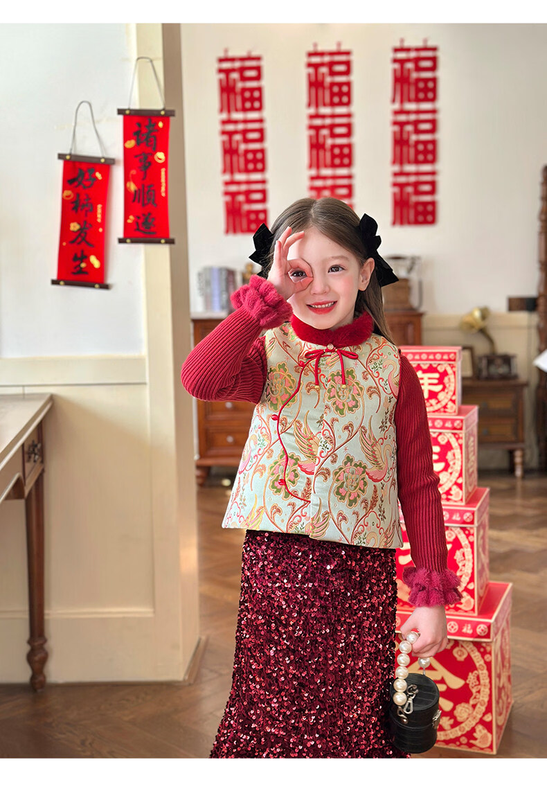 栀了成长记女童装新年国风毛绒立领马甲2025冬季撞色夹棉唐装上衣 红色 马甲 100
