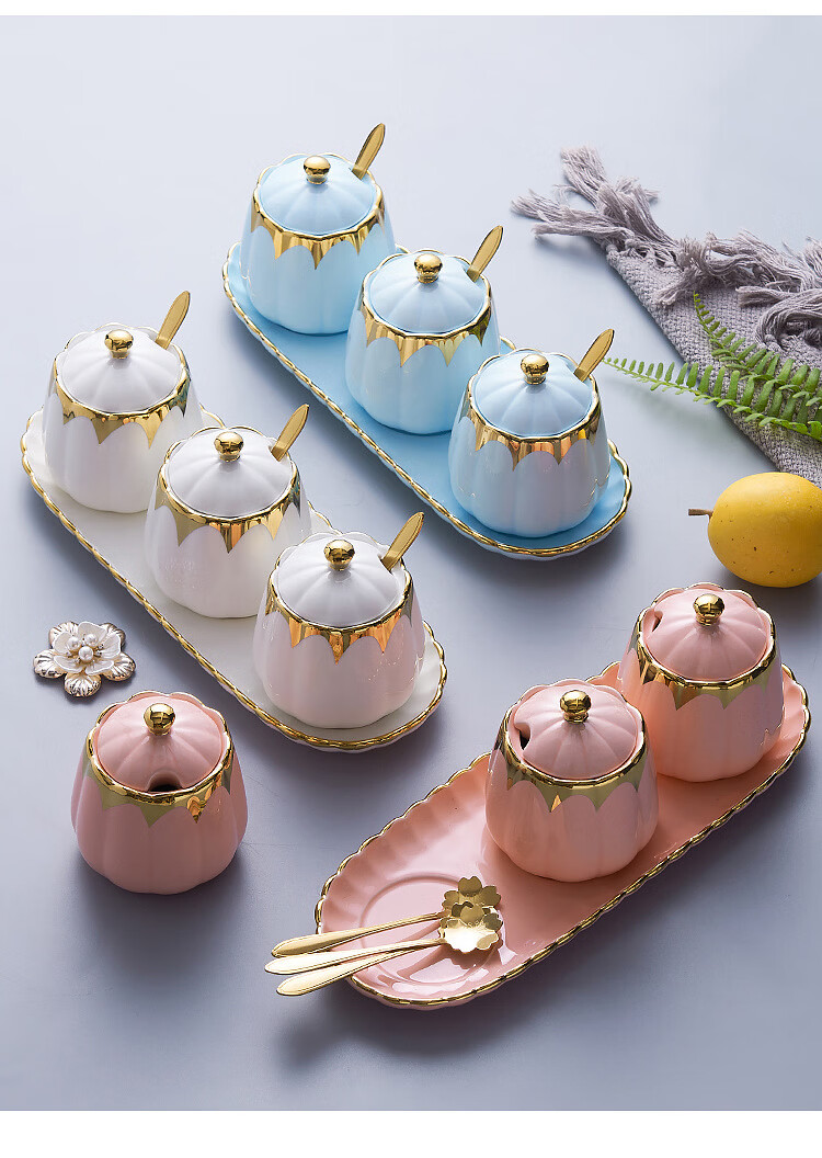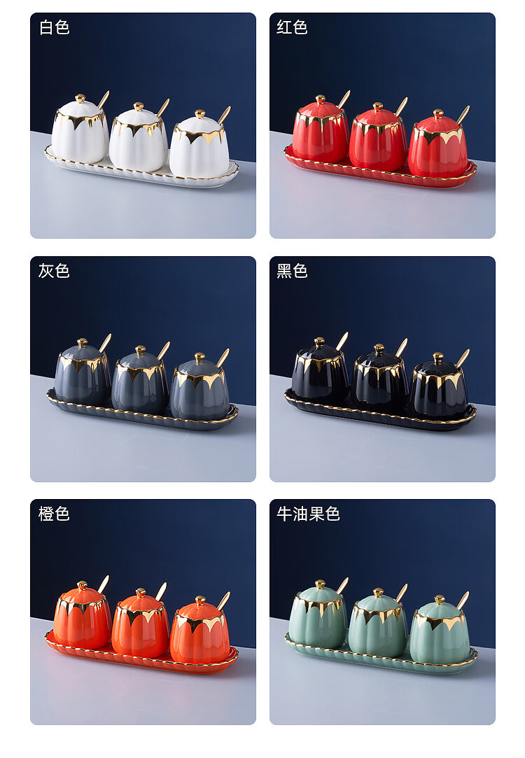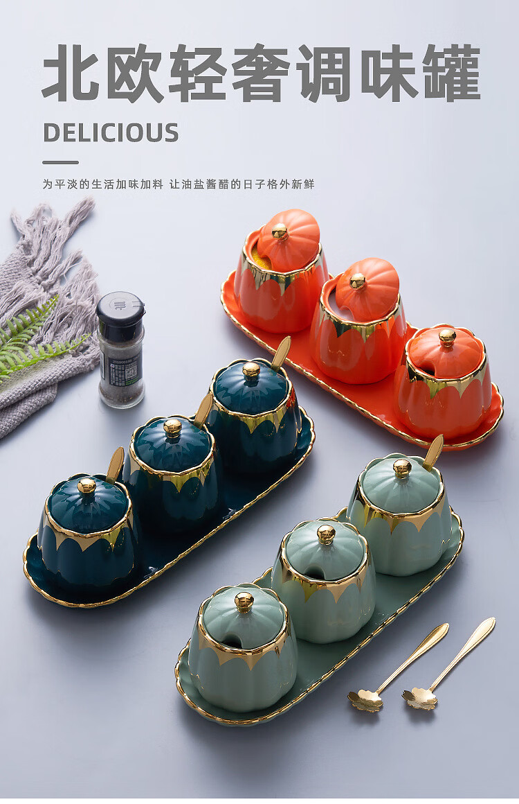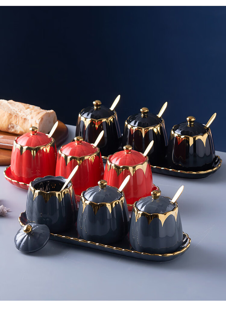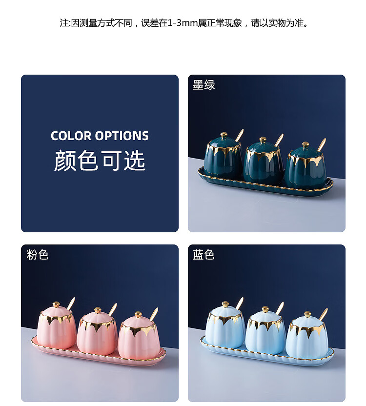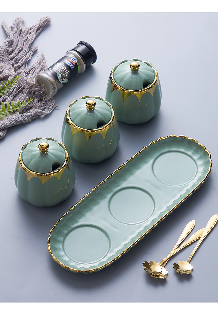 MMOTRO日本品牌陶瓷调料罐家用调味罐组合套装调料收纳佐料盐罐厨房用品 墨绿色 3罐+托盘+3勺