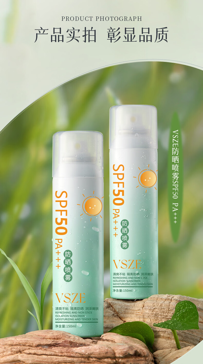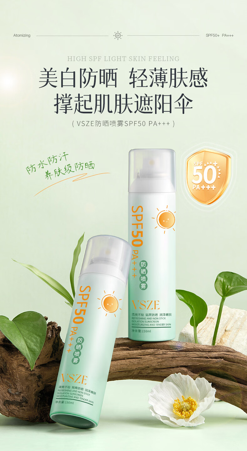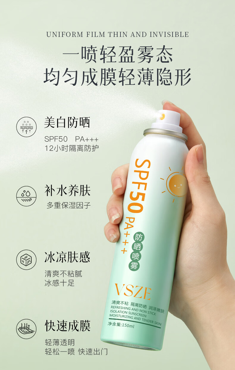 VSZE防晒喷雾霜男女士军训专用高倍美白防水防汗持久防紫外线SPF50+ 【青色新升级】军训高倍防晒喷雾150ml*2瓶