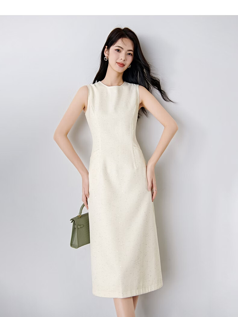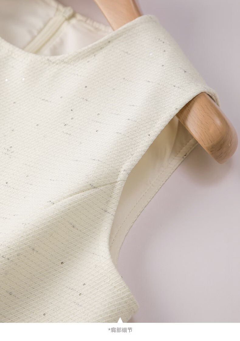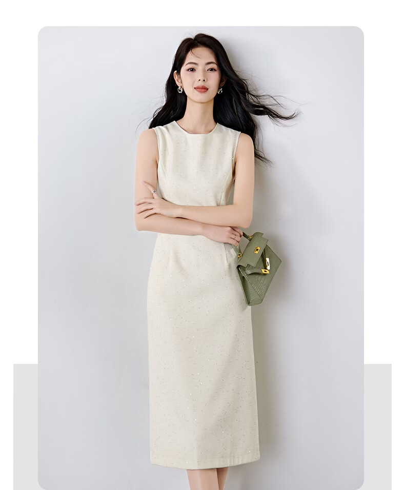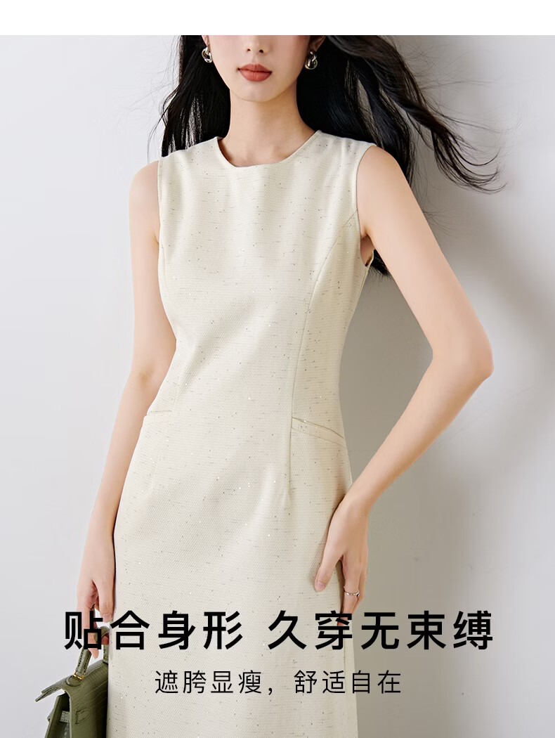 晚白【新品】2026春款正式场合穿搭时尚亮片裙子气质高级感无袖连衣裙 杏色 S
