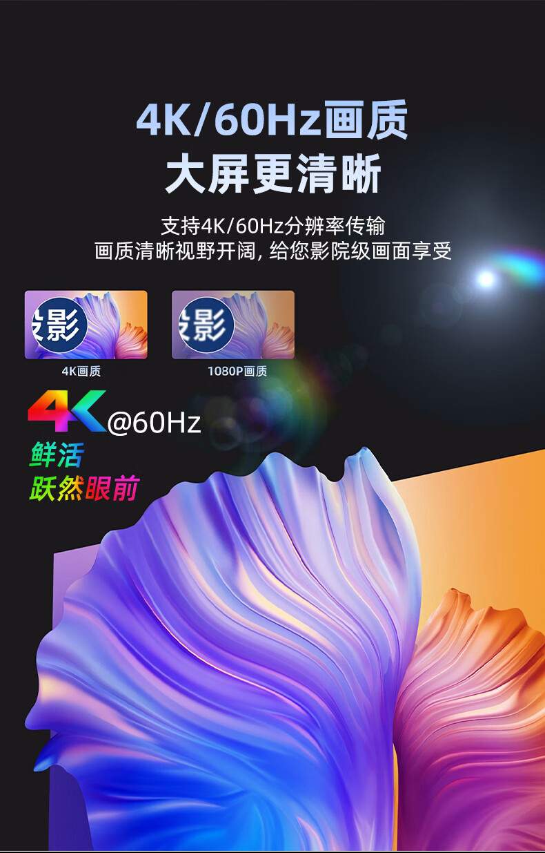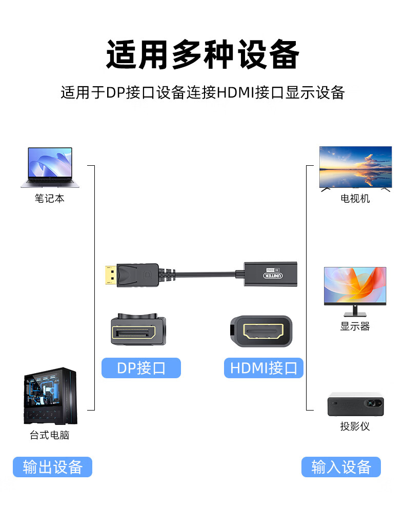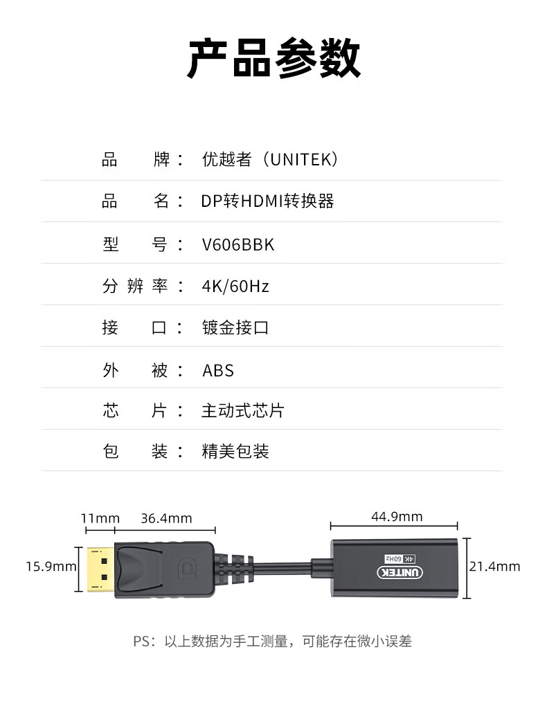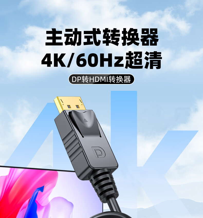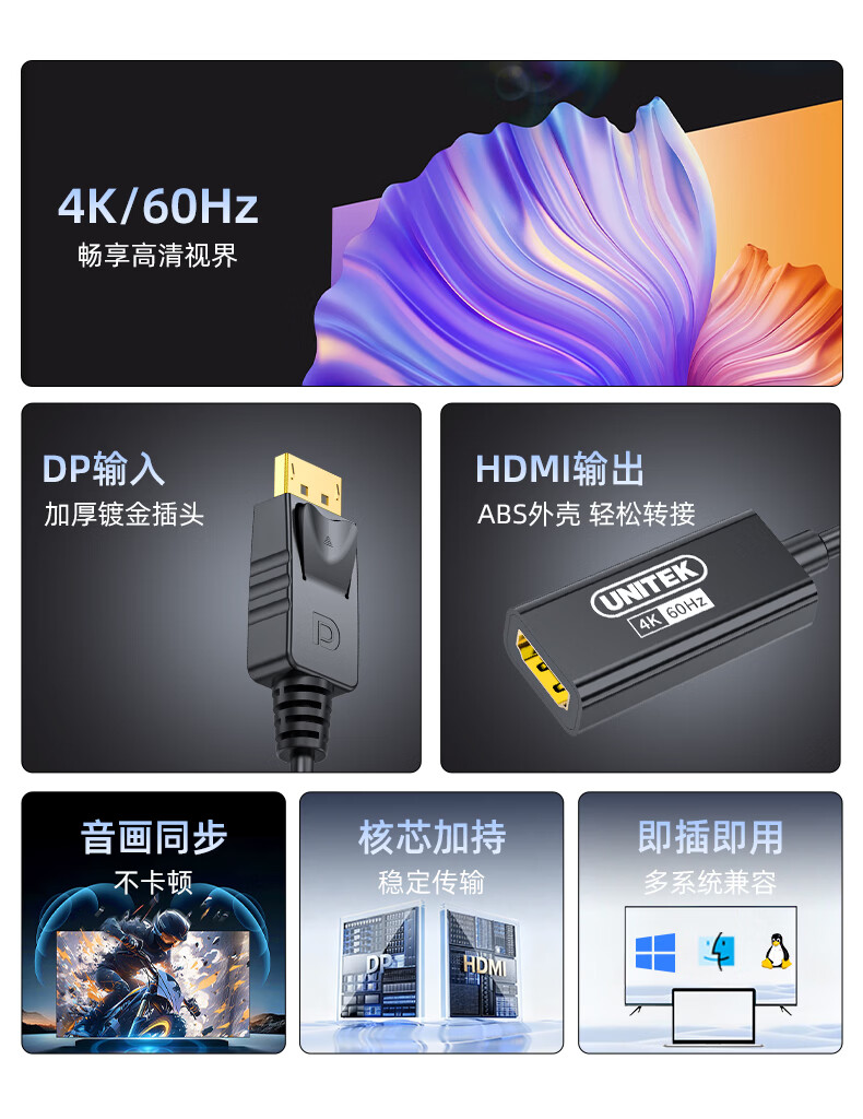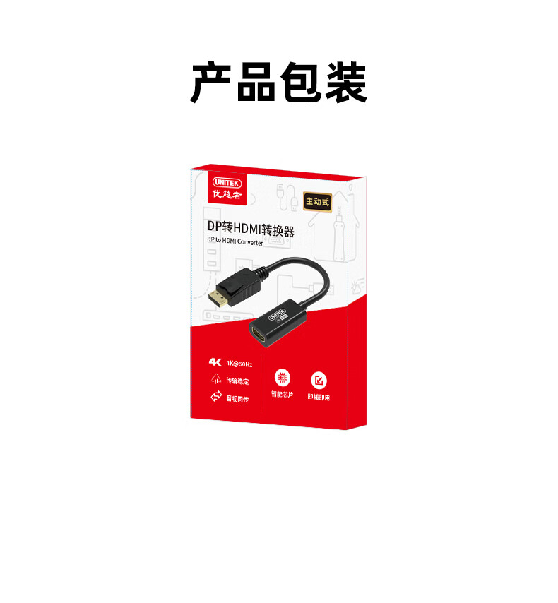 优越者DP转接HDMI转换器主动式4K/60Hz高清视频转接头电脑显卡DP接口DisplayPort转HDMI公对母转换插头