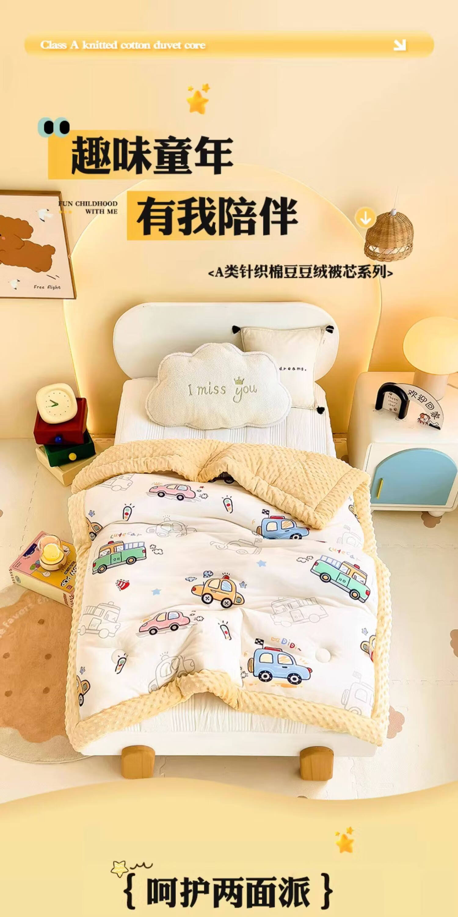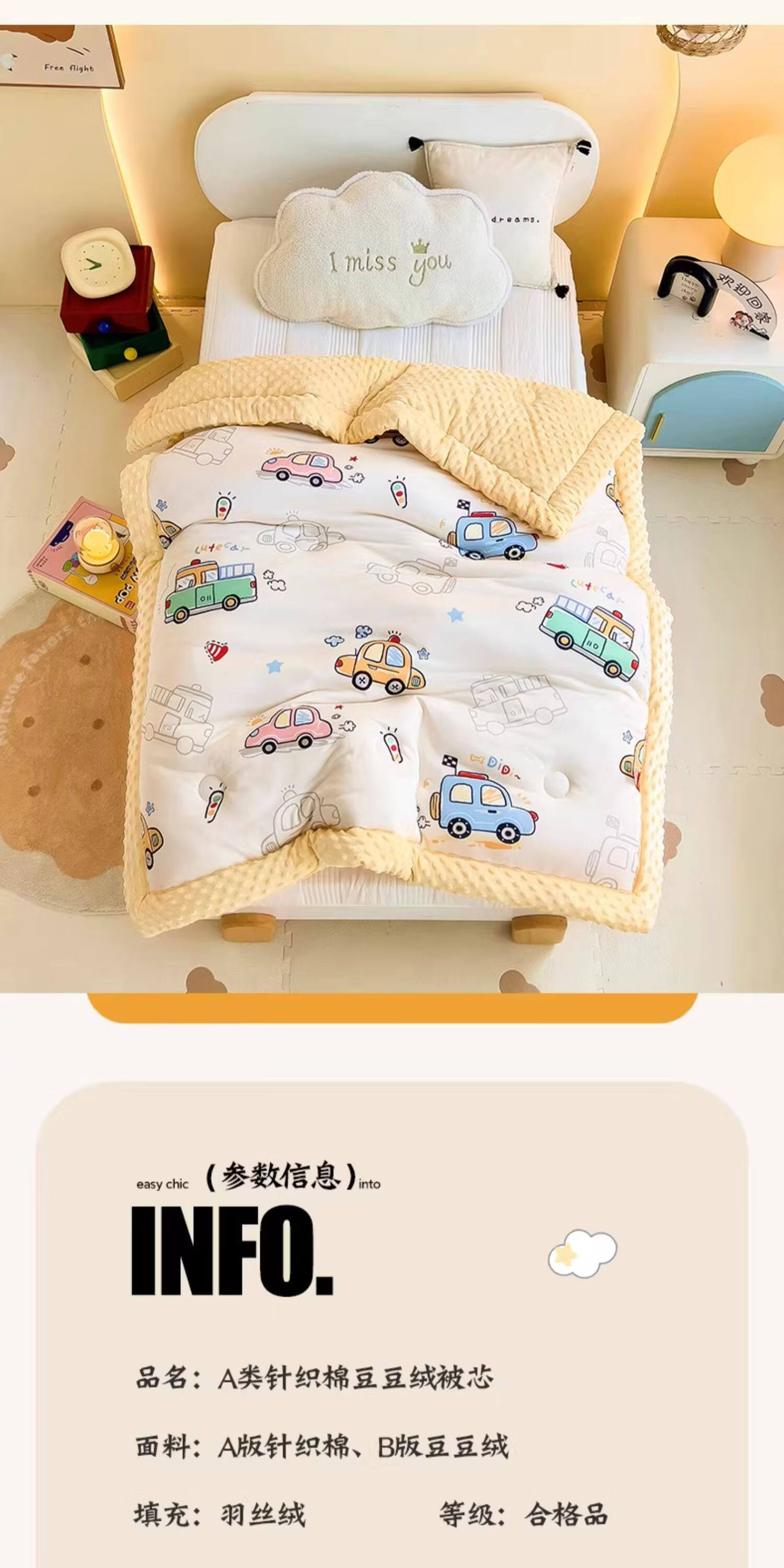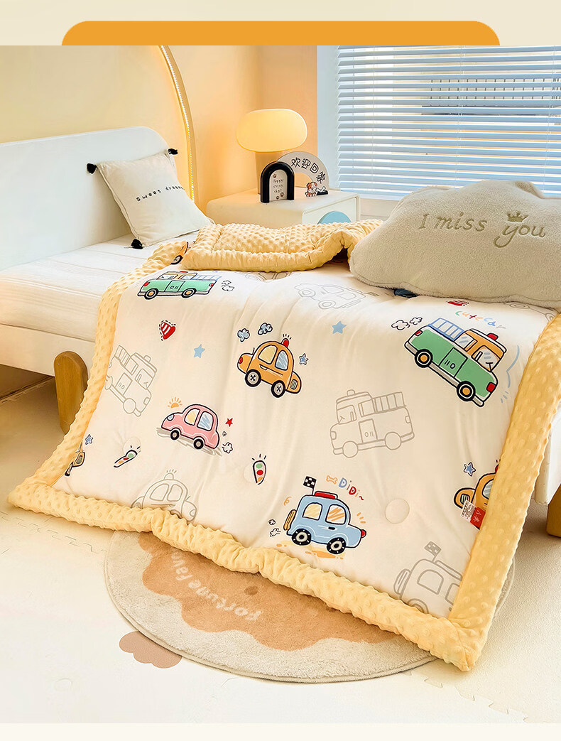 阿尔皮纳袋鼠A类儿童豆豆绒被子冬季加厚针织棉冬被芯单人幼儿园空调四季被芯 开心车队【A类母婴级针织豆豆绒被子】 100*120cm约1.5斤春秋被(适合0-3岁)