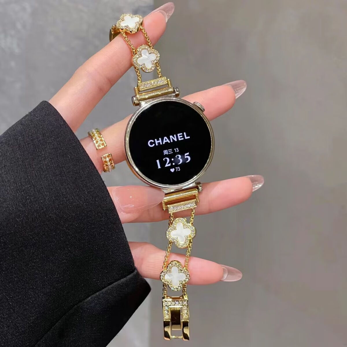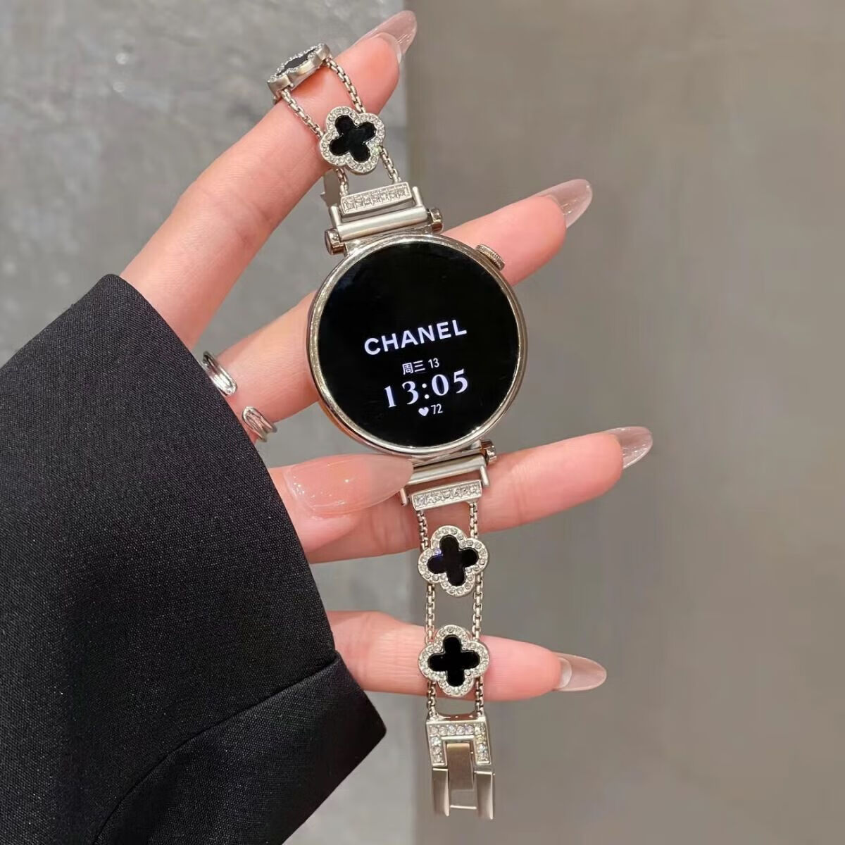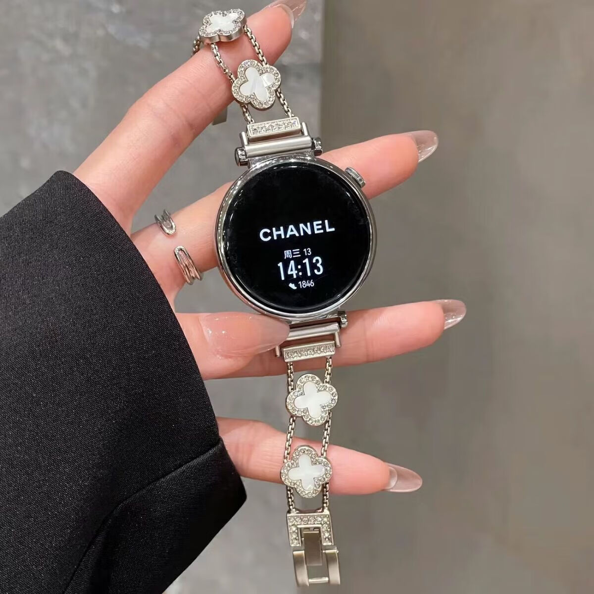 适用华为watch5手表带新款gt6细款四叶草链条感女款表带 四叶草-黑黑【表带】 华为Watch5 46mm