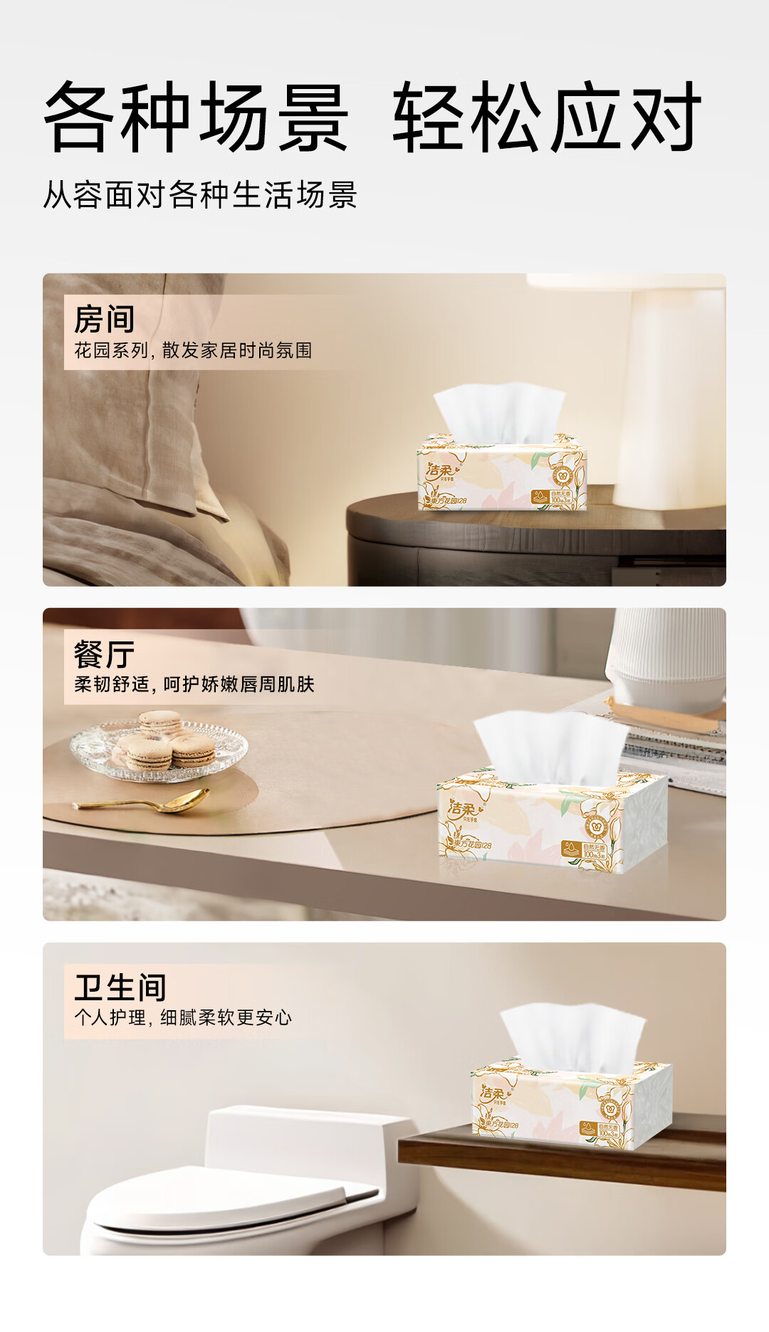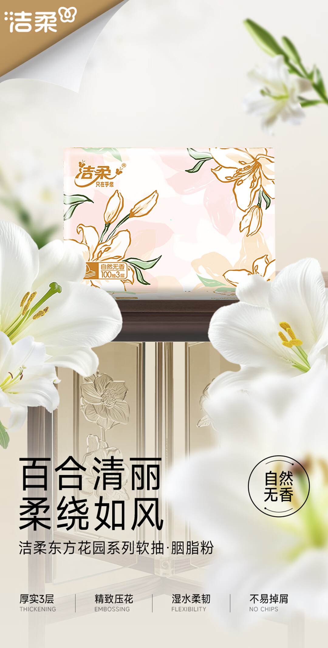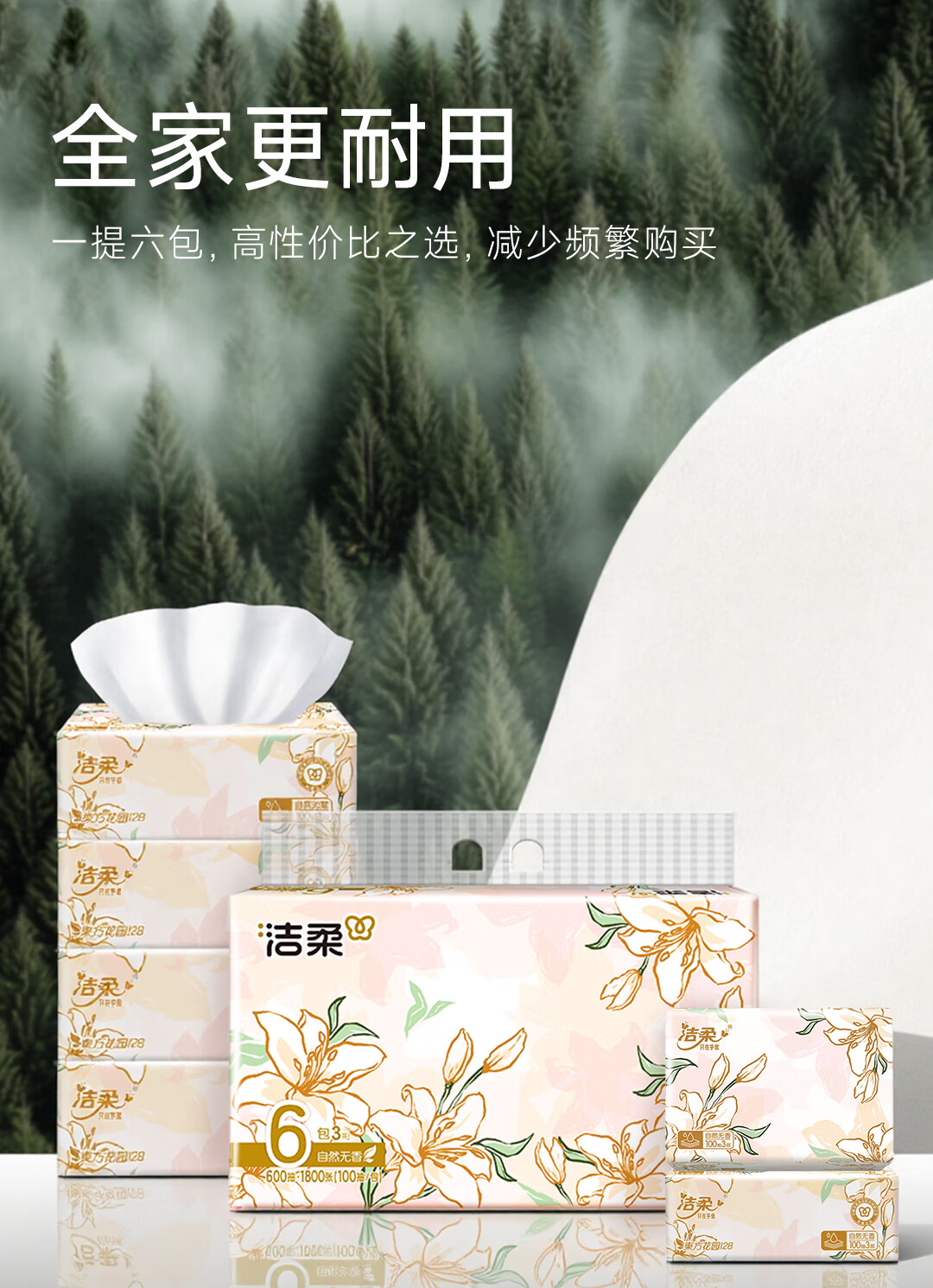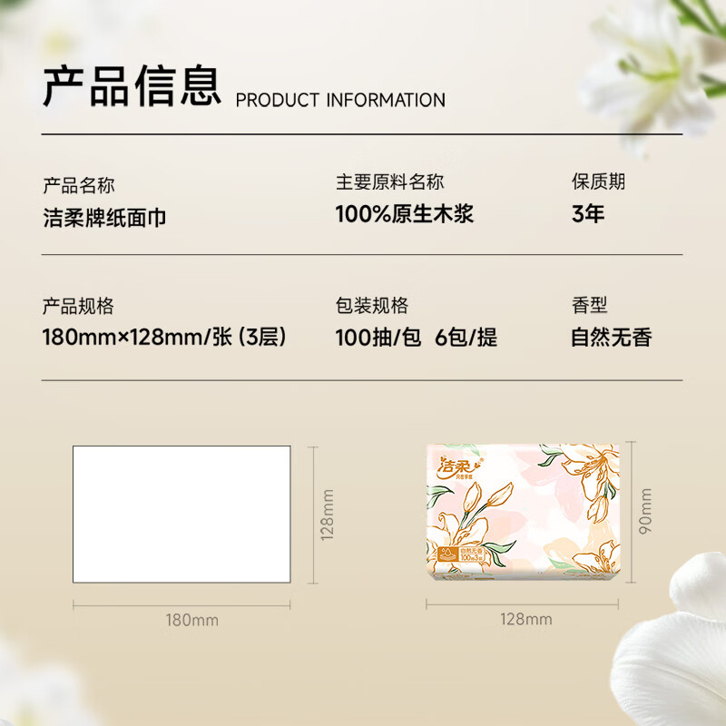 洁柔抽纸 繁花系列3层100抽*6包 可湿水面巾纸 柔韧不易掉屑 提装纸巾
