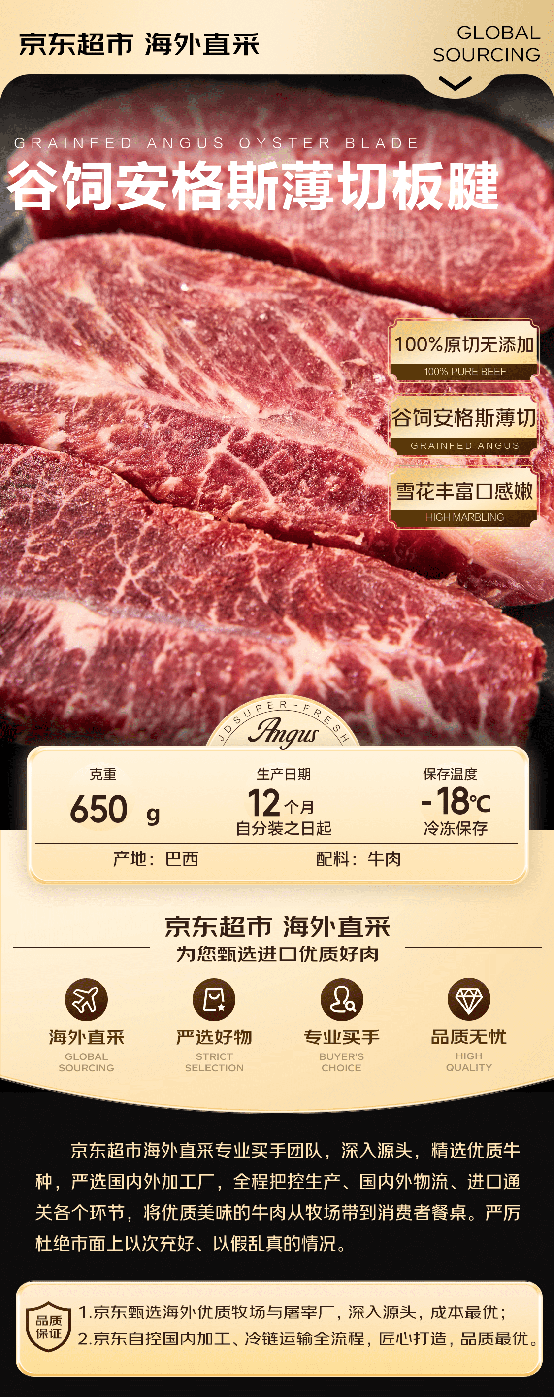 京东超市 原切谷饲安格斯板腱牛排650g(约10小块) 京东自营进口牛肉