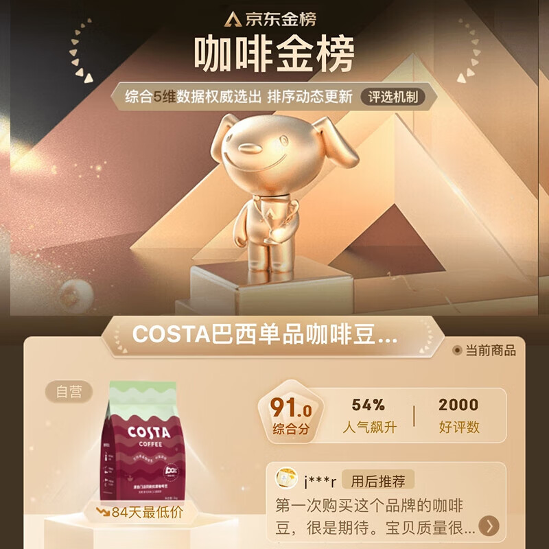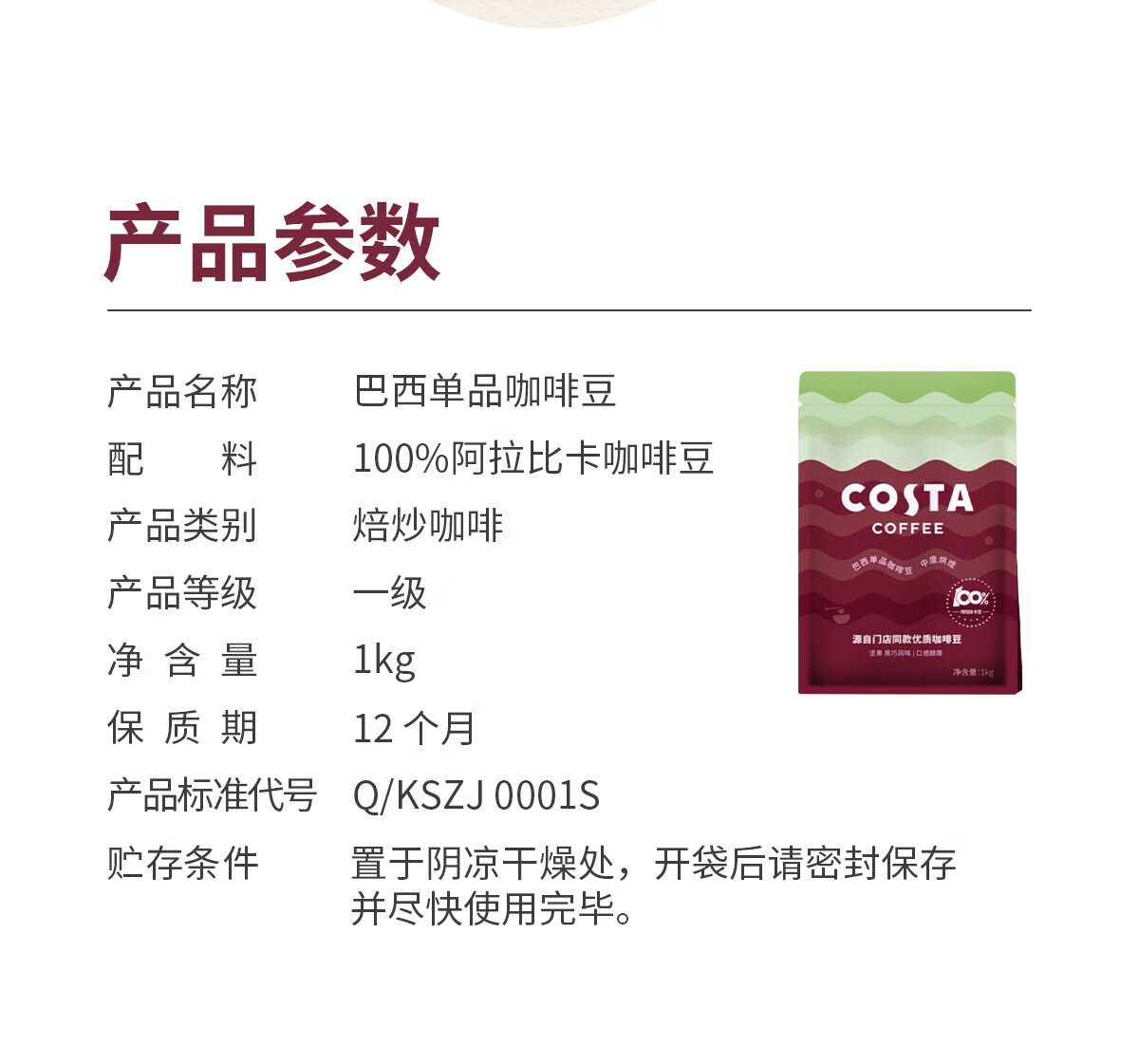 COSTA巴西单一产地咖啡豆门店同款中烘阿拉比卡拿铁手冲黑咖啡1kg