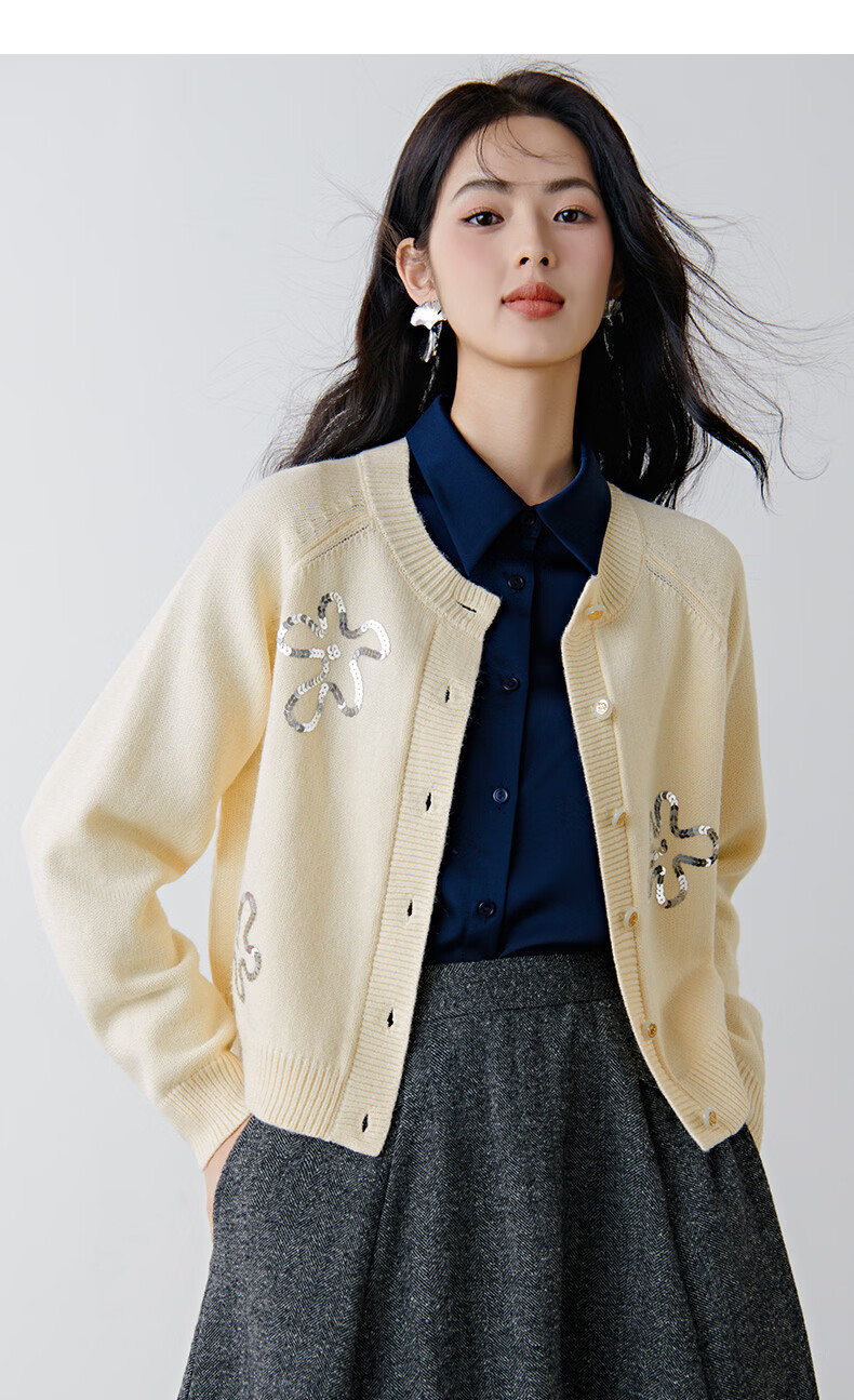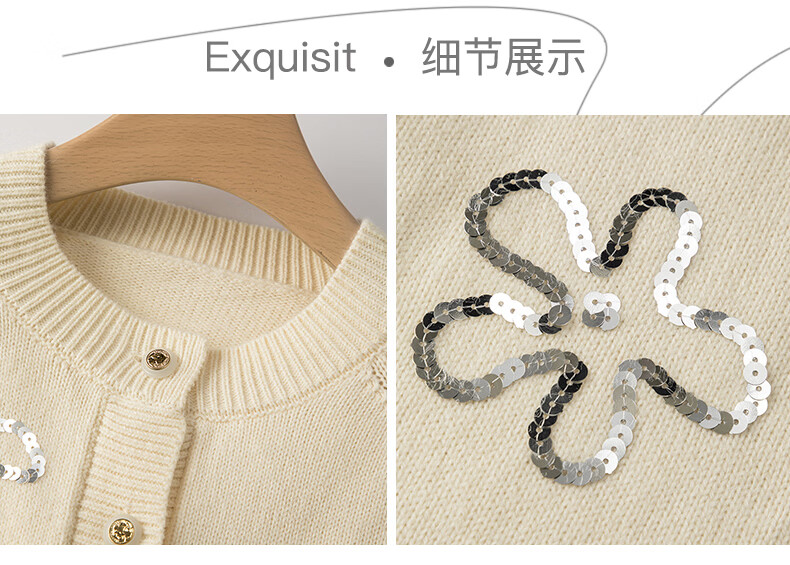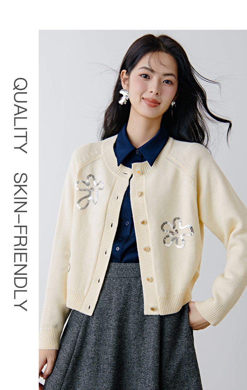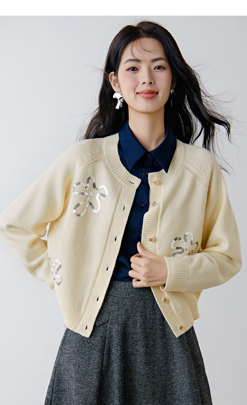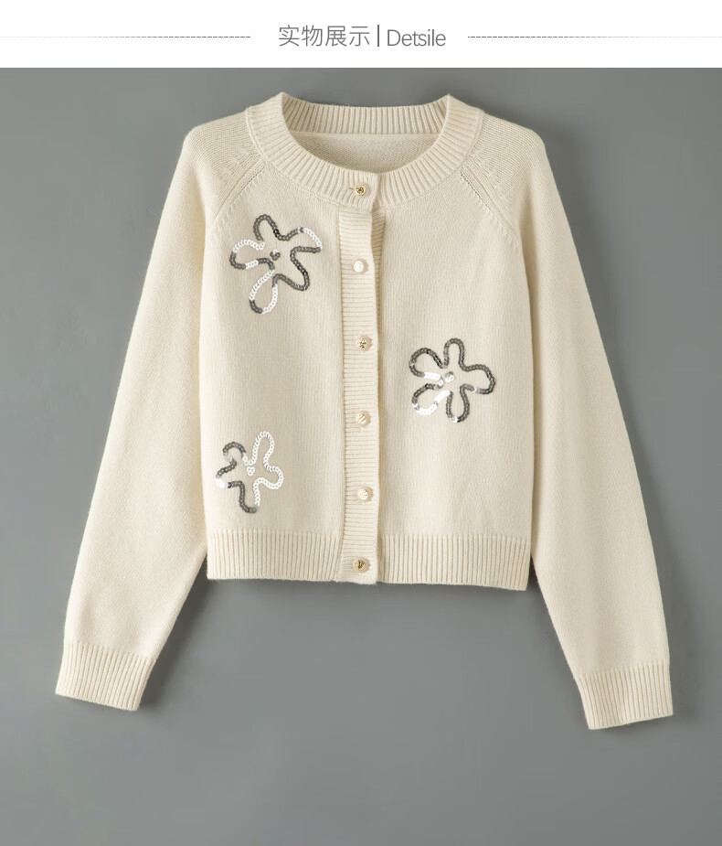 晚白【新品】2026春款时尚亮片圆领毛衣软糯亲肤宽松大码针织开衫女 米杏色 L