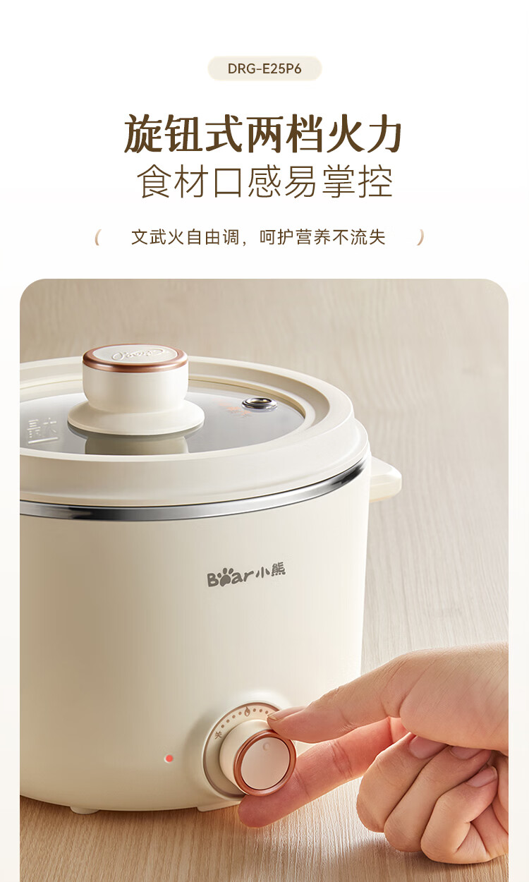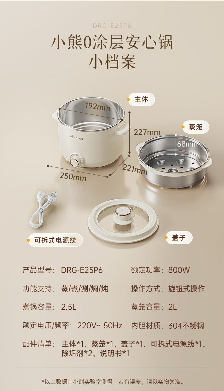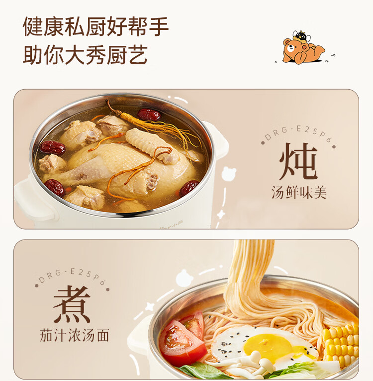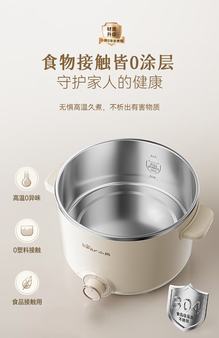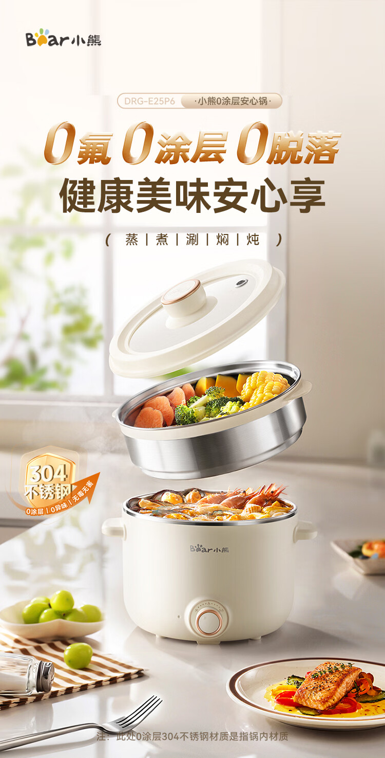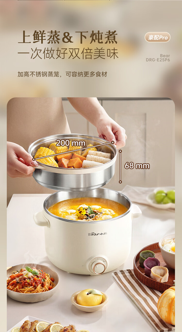 小熊(Bear)不锈钢电煮锅 宿舍小电锅 小火锅 学生泡面家用电热锅 蒸煮一体多功能锅0涂层2-3人用 E25P6配蒸笼