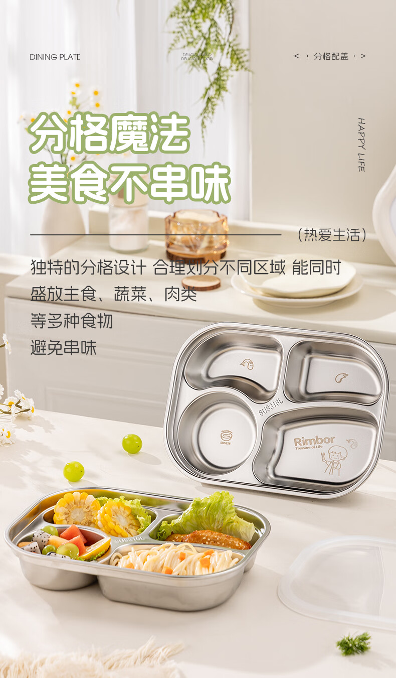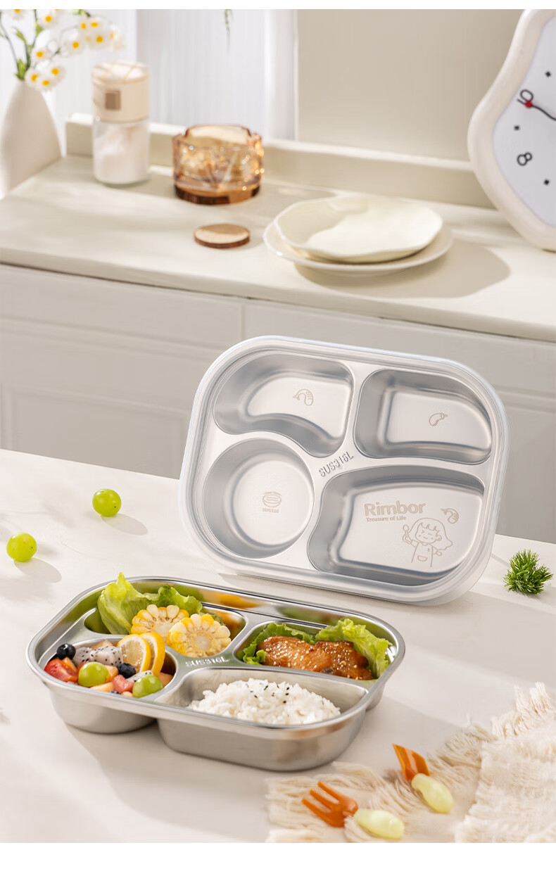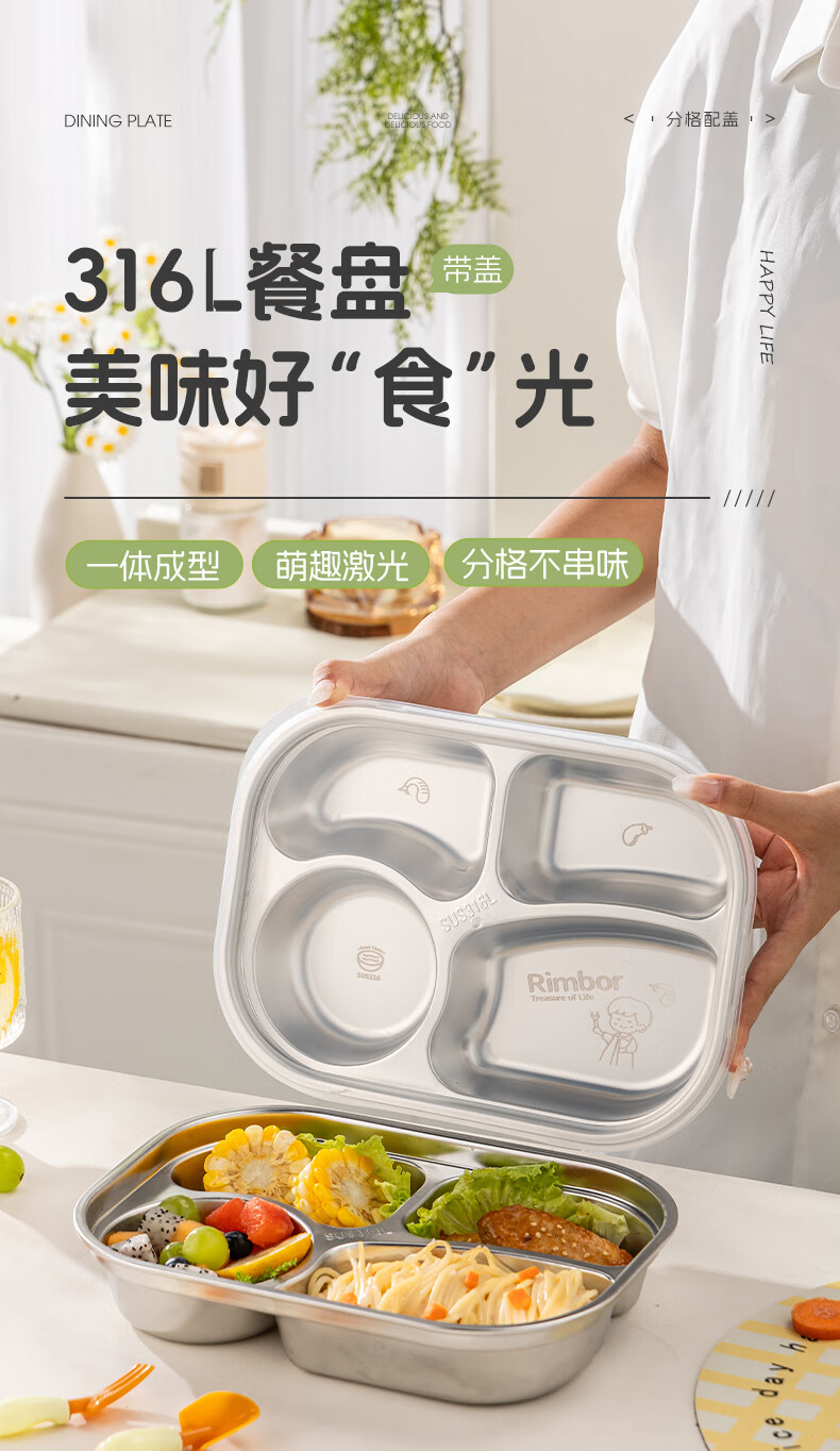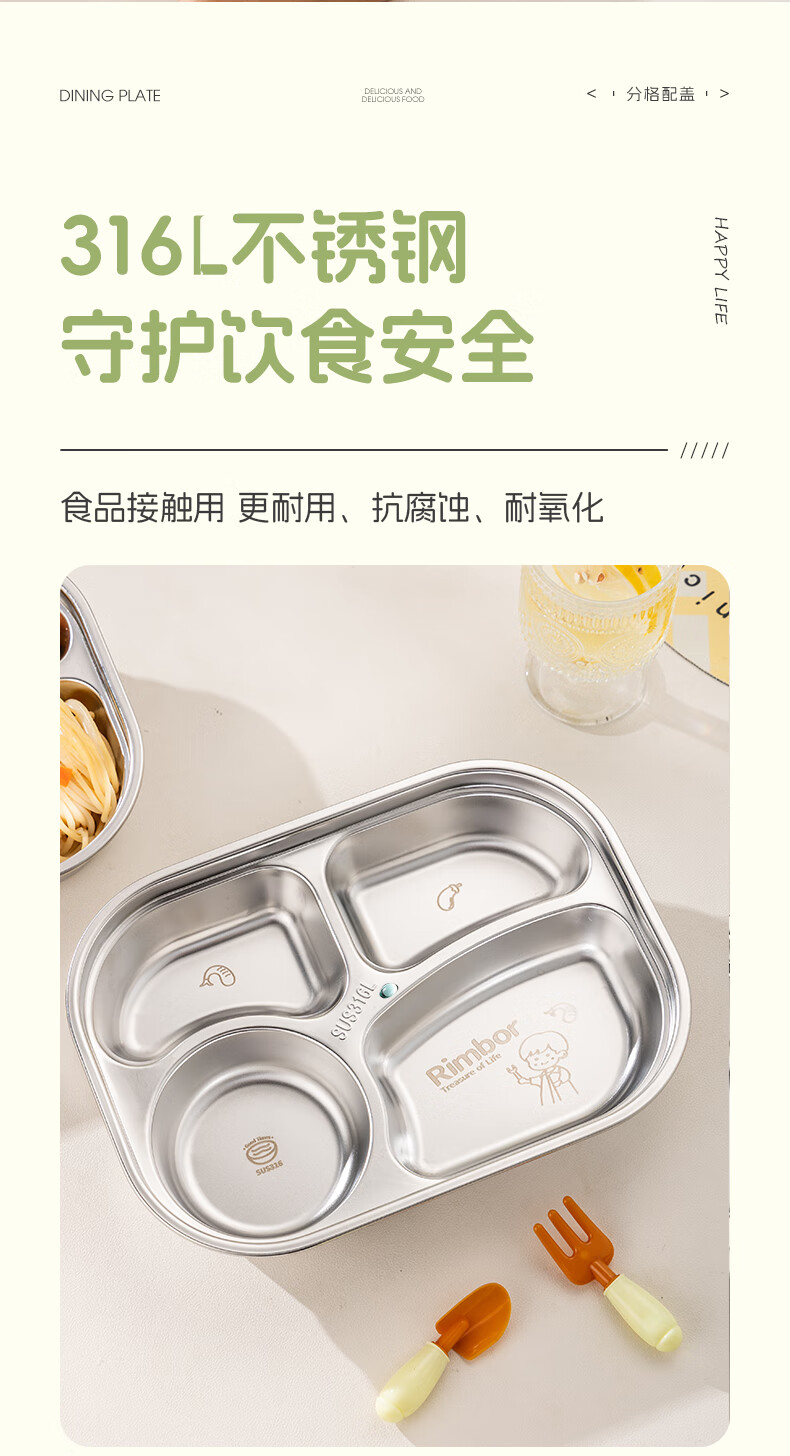 广意316L不锈钢四格餐盘学校食堂饭盘不锈钢分格餐盘加盖 316L分格餐盘四格加盖-男孩款