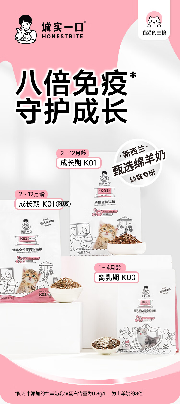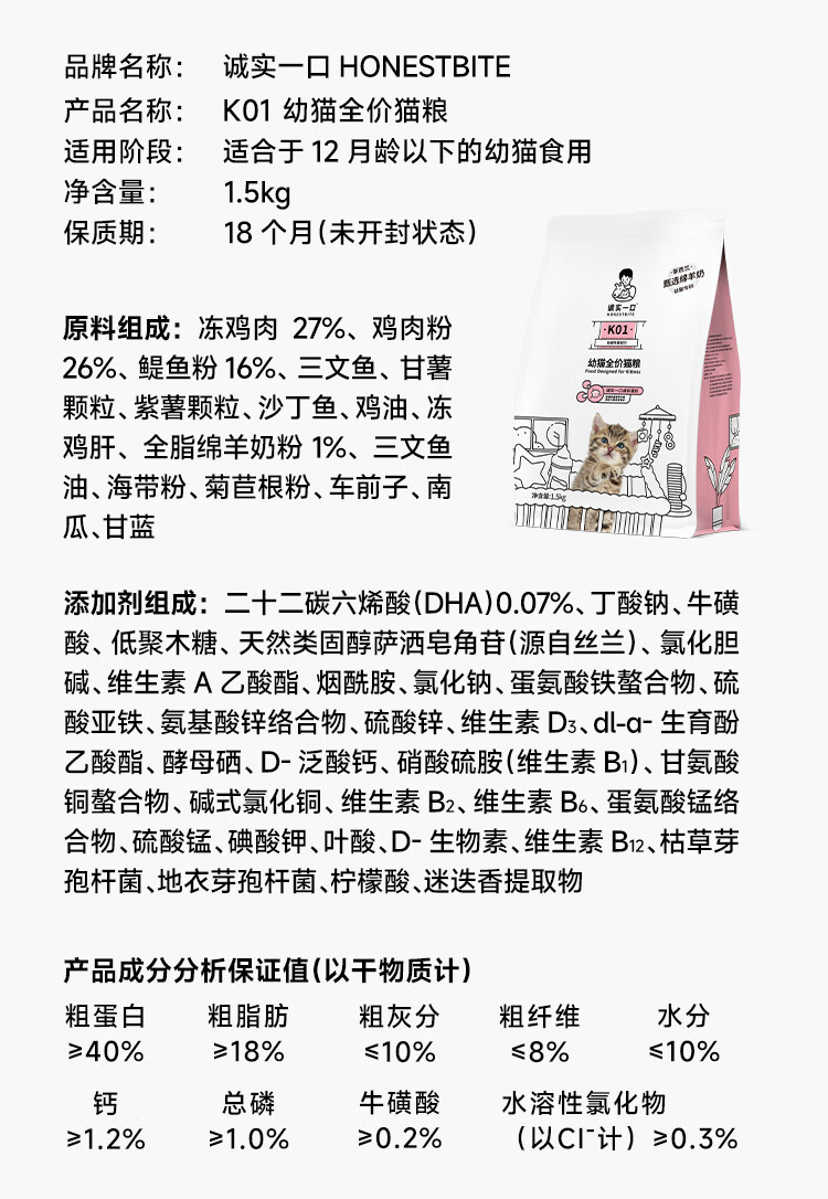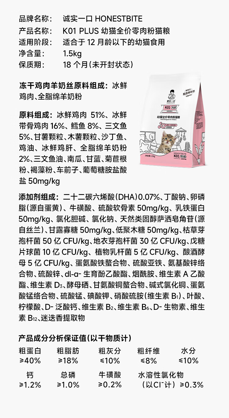 诚实一口K01全价幼猫粮升级绵羊奶配方1.5kg