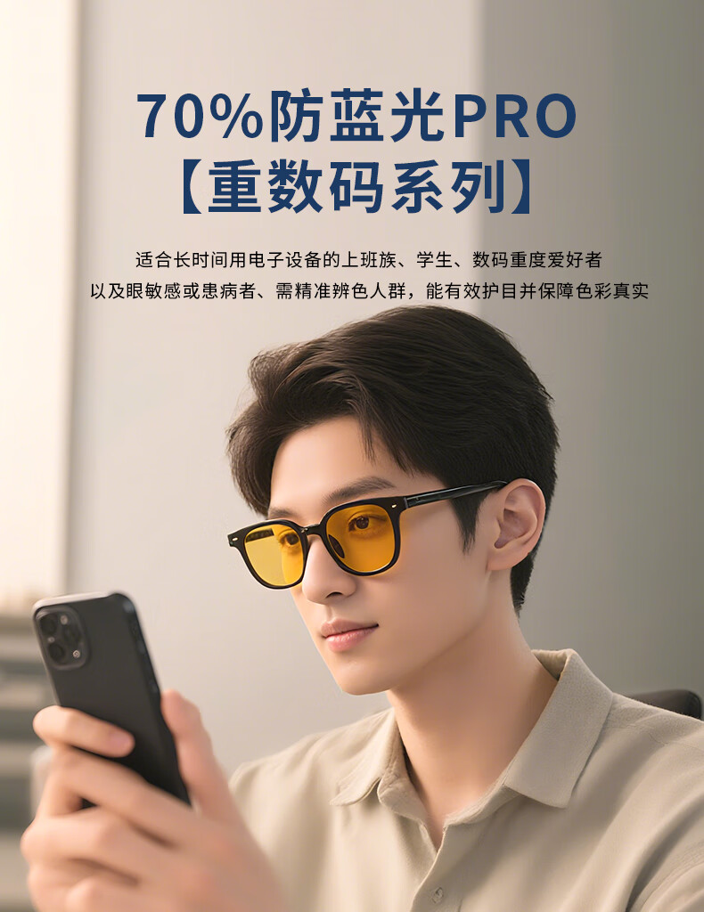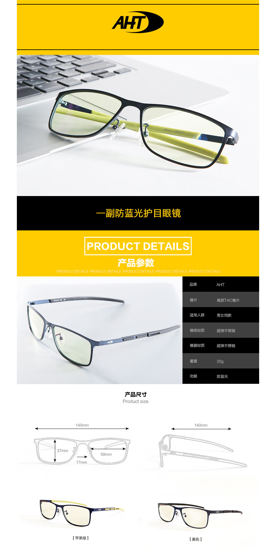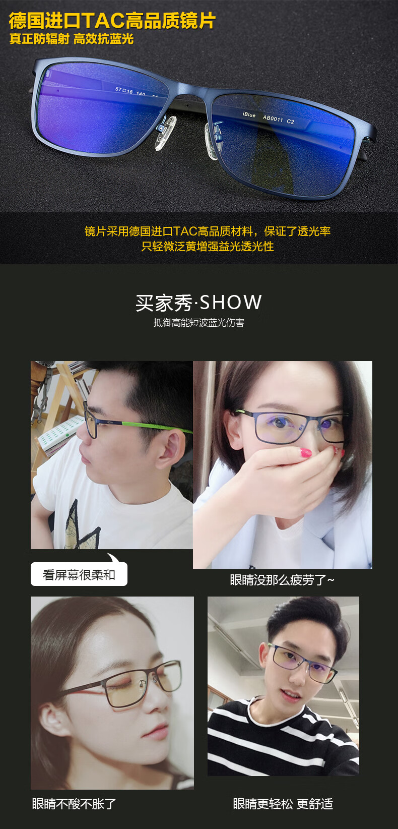 AHT防蓝光眼镜男女防辐射眼镜电脑护目镜学生平光眼镜电竞眼镜定制 AB0011-C2黑 0度【浅黄,专业防蓝光】