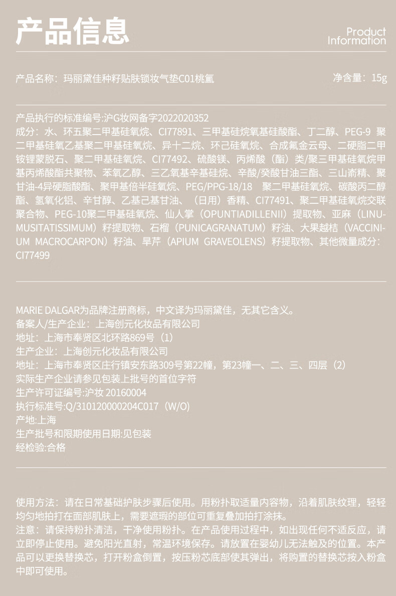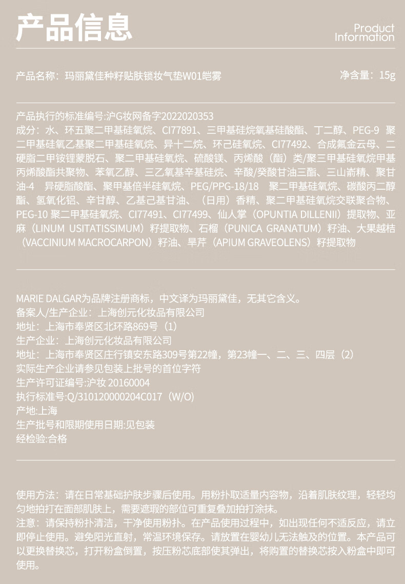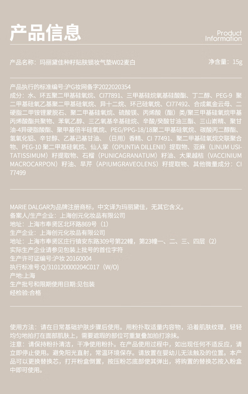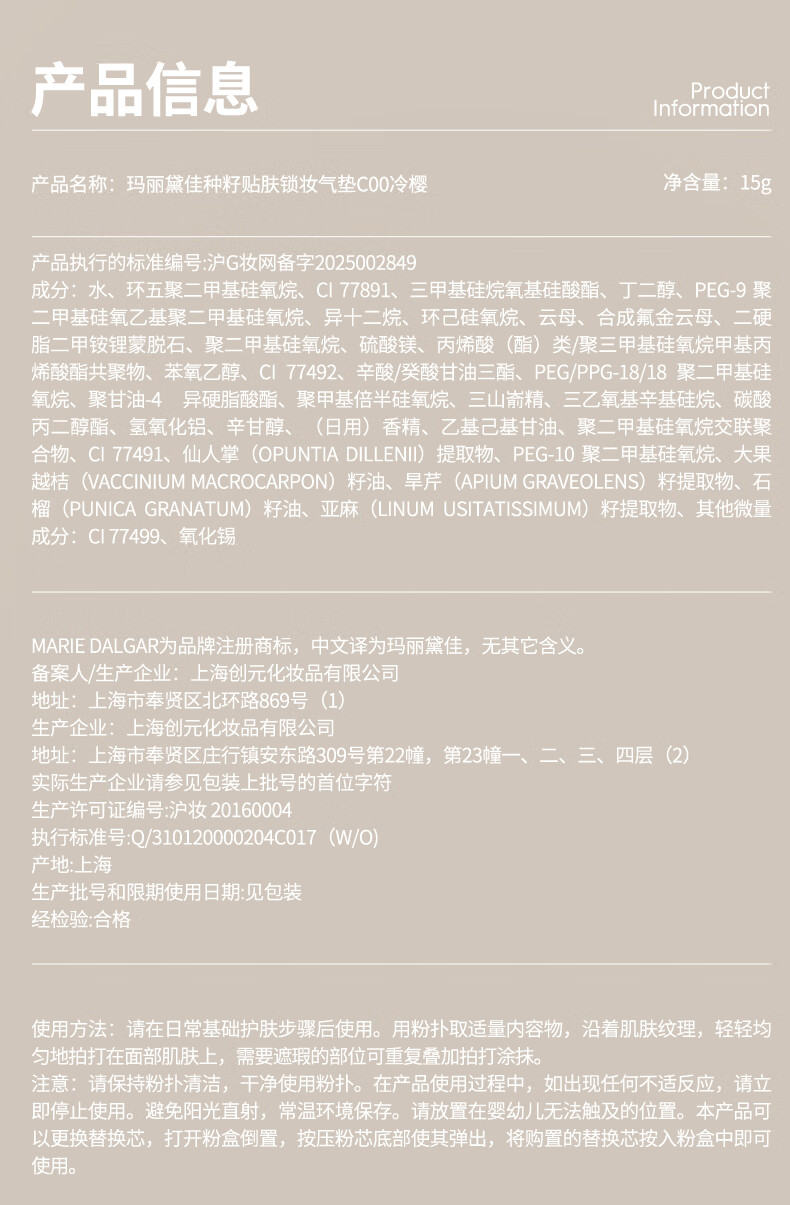 玛丽黛佳(MARIE DALGAR)妇女节礼物种籽气垫2.0锁妆持妆干皮滋润遮瑕W01皑雾