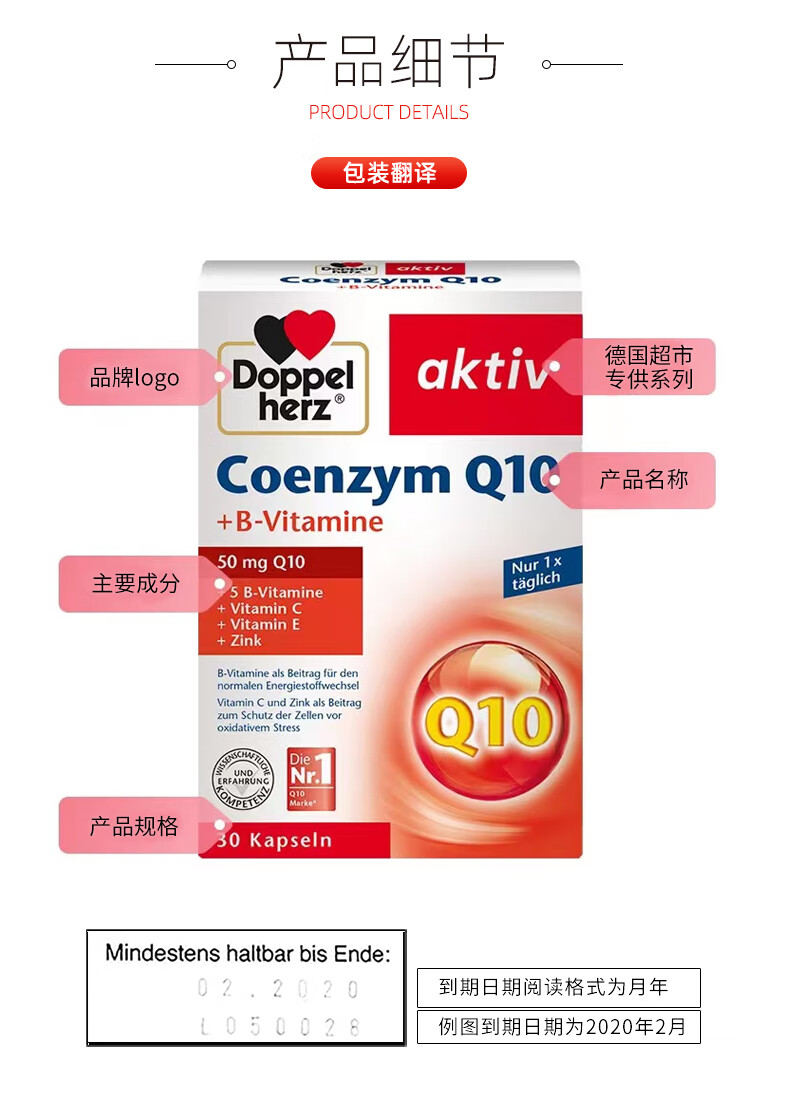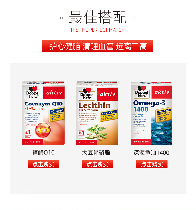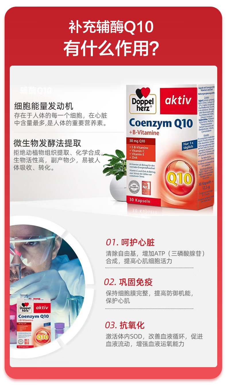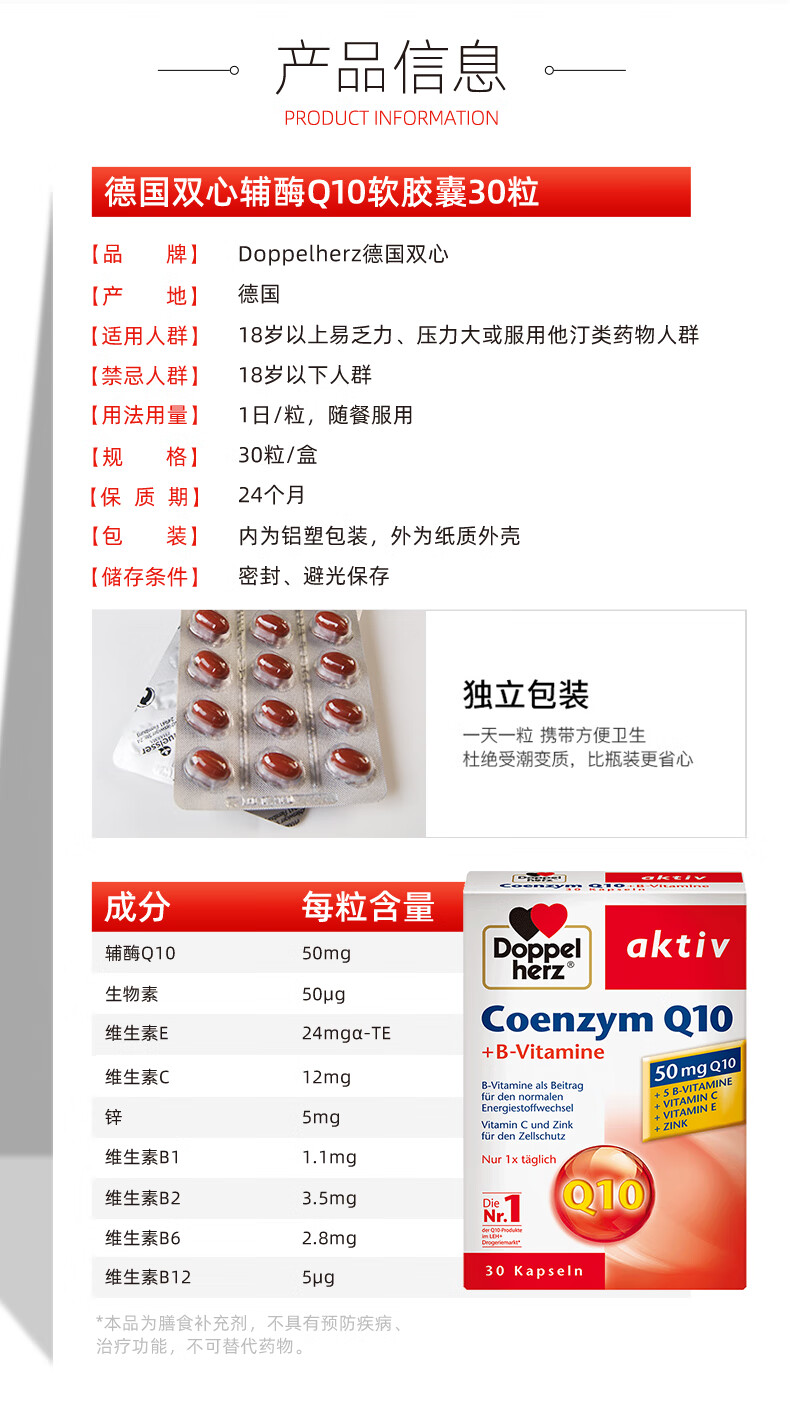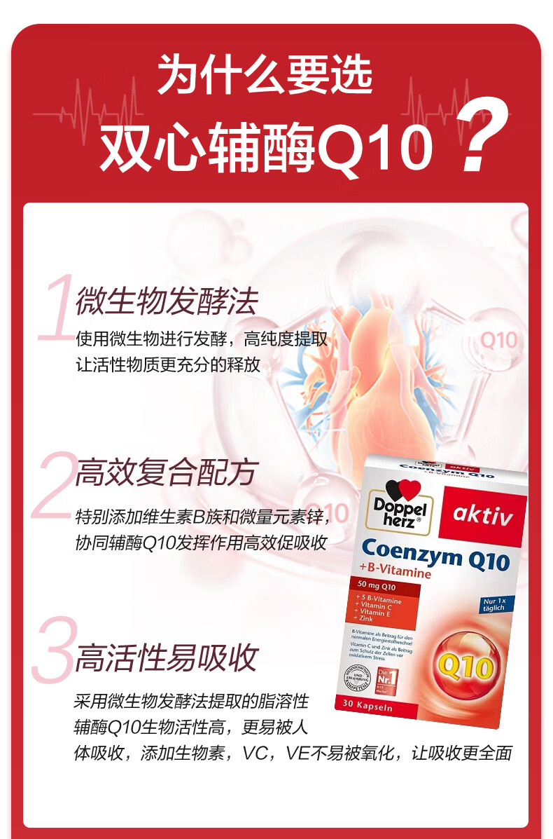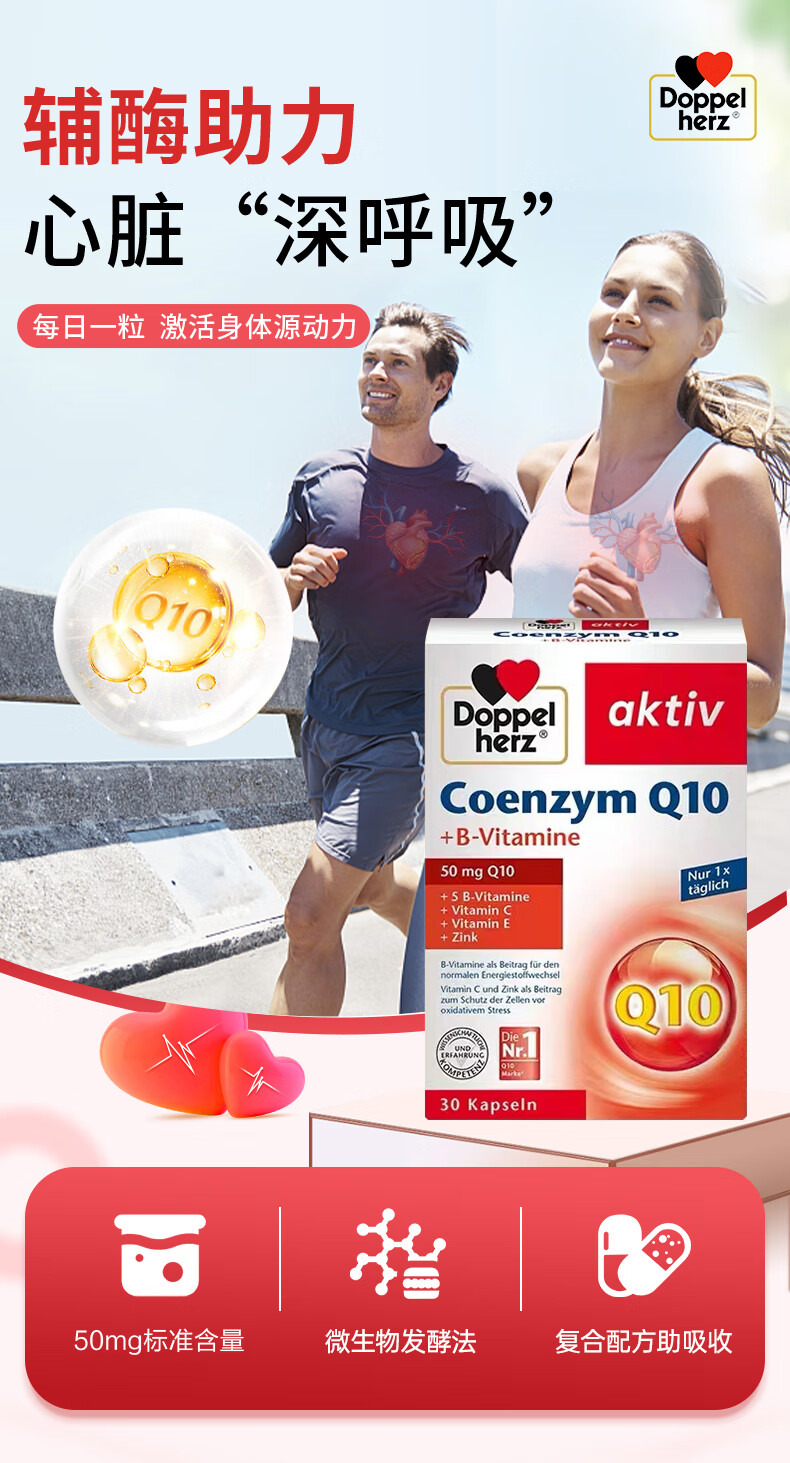 双心(Doppel herz)辅酶Q10软胶囊50mg30粒/盒+复合维生素强健心肌保护心脏心脑血管 【养心周期装】 30粒*3盒