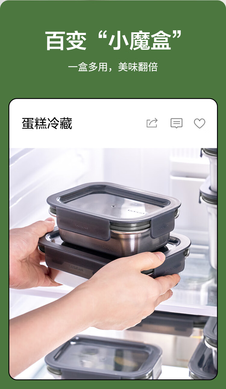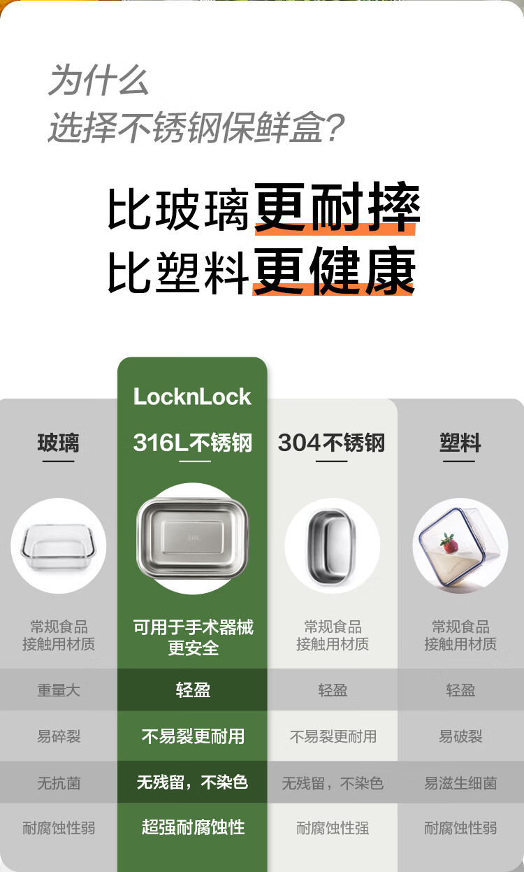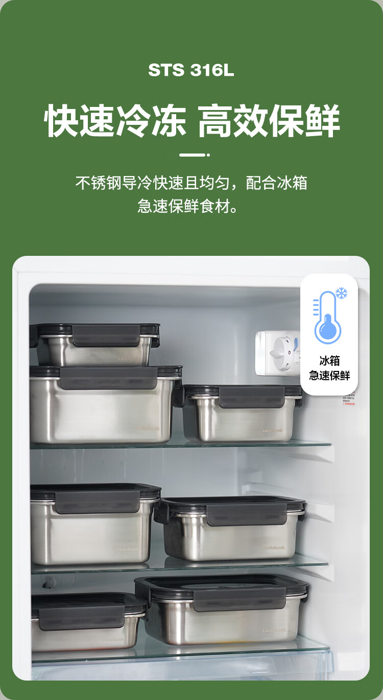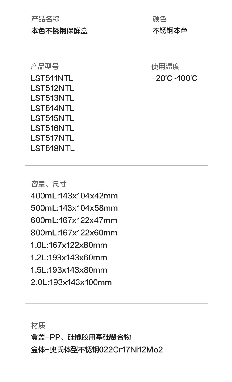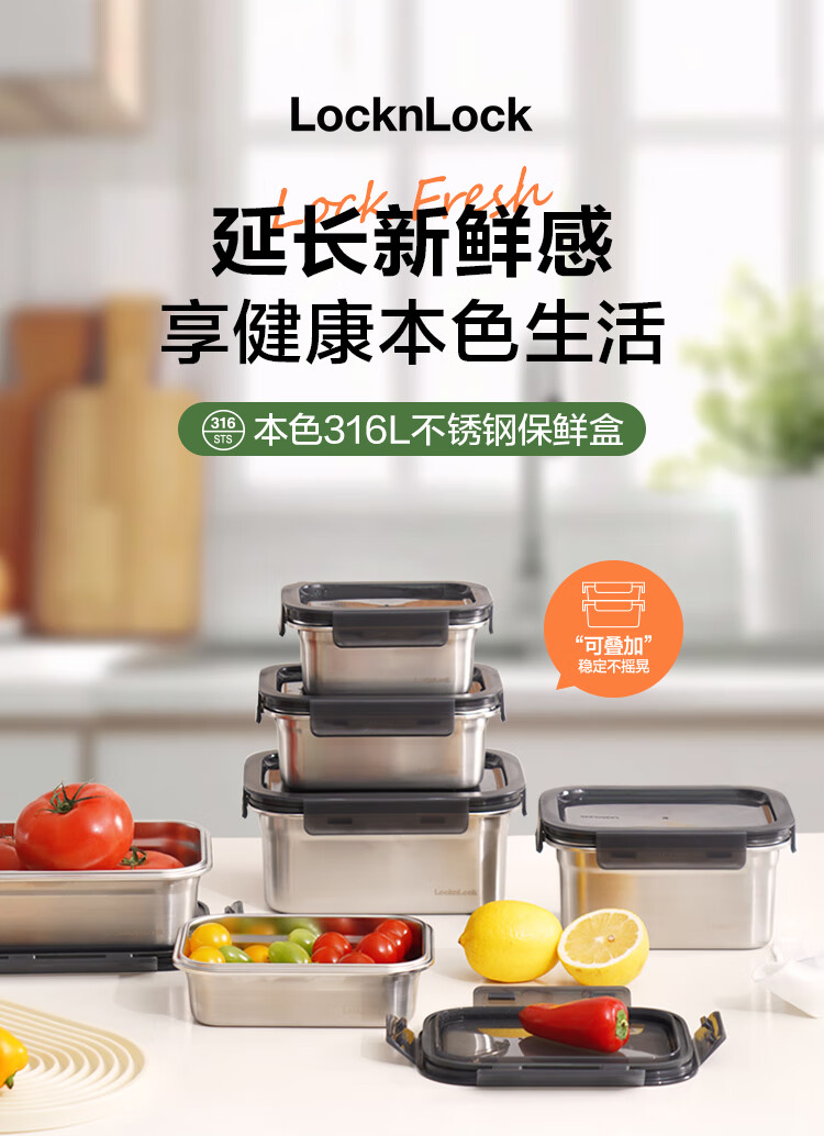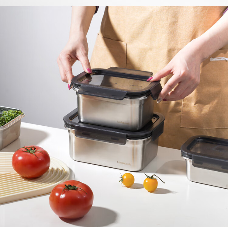 乐扣乐扣(LOCK&LOCK)本色不锈钢保鲜盒饭盒带饭密封冰箱厨房收纳水果零食餐盒500mL