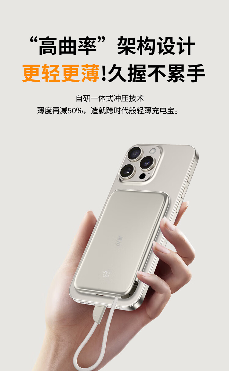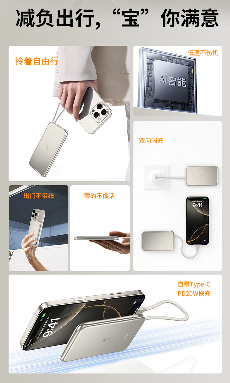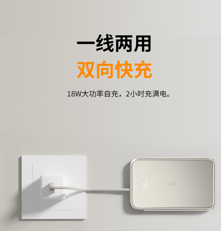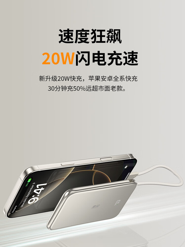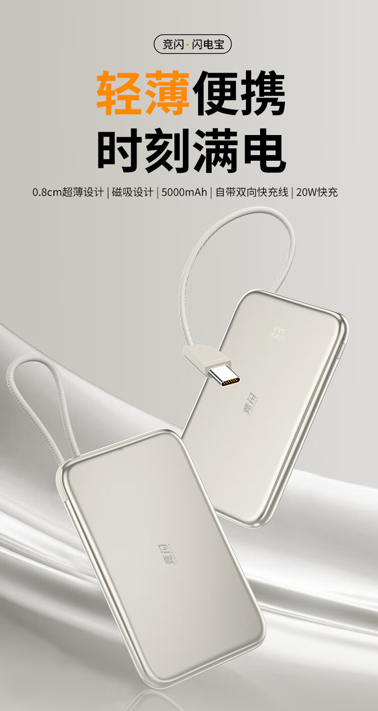 竞闪磁吸充电宝5000毫安PD20W双向双线快充超薄大容量小巧便携移动电源适用苹果16/15Pro小米华为手机 双线双向快充PD20W【磁吸超薄金】5000mAh
