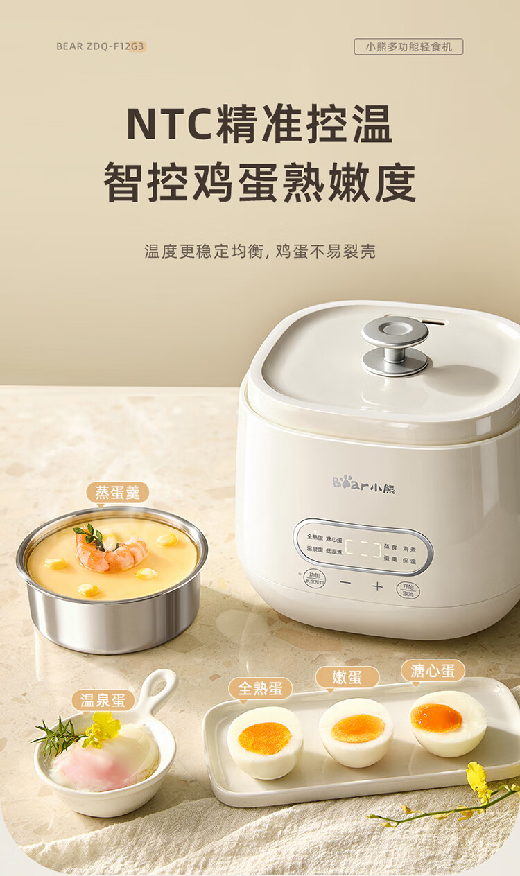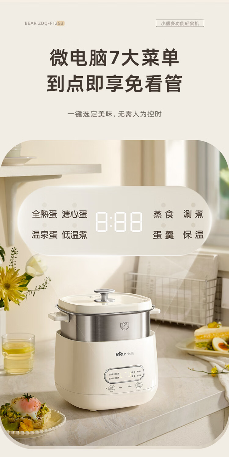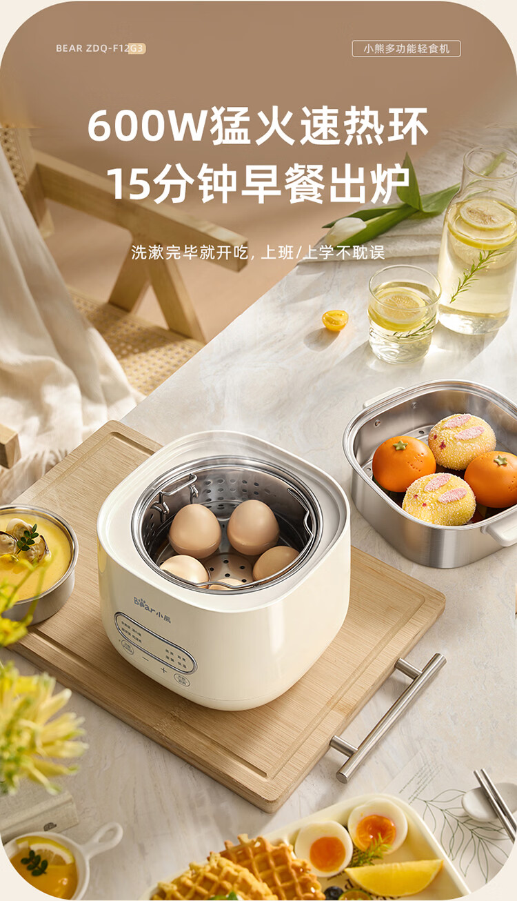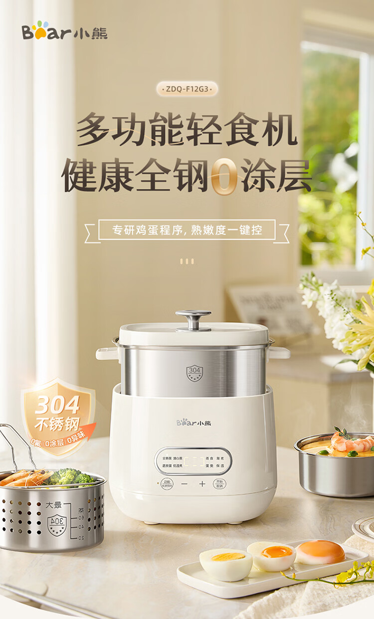 小熊(Bear)煮蛋器 蒸蛋器 自动断电早餐蒸煮一体机 定时预约蒸蛋神器小型一人用 0涂层不锈钢轻食机ZDQ-F12G3