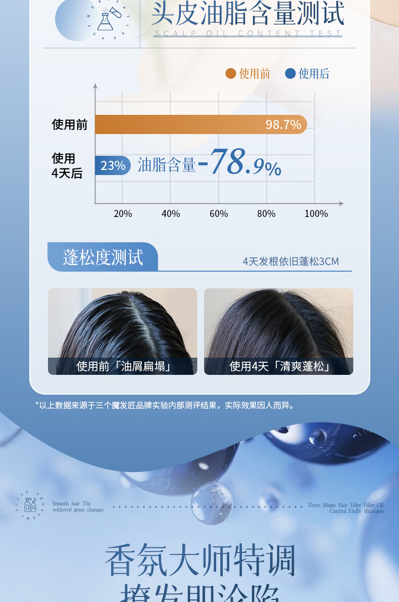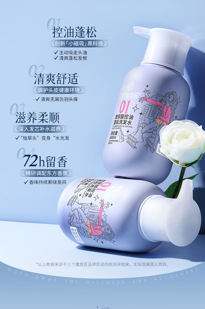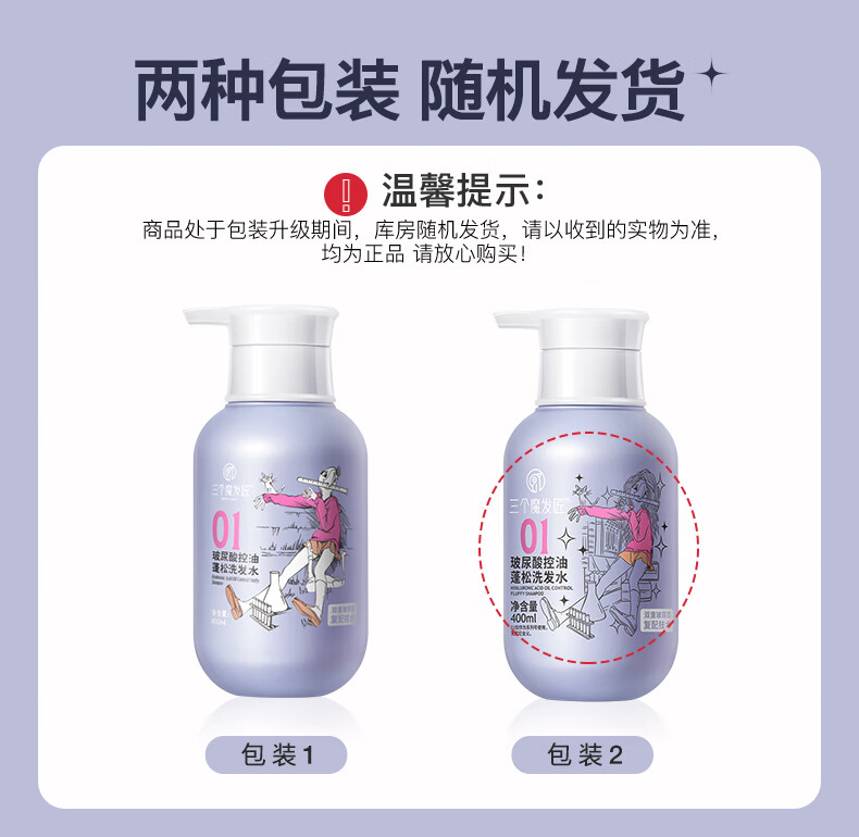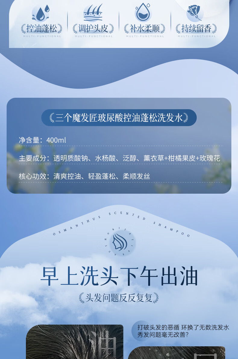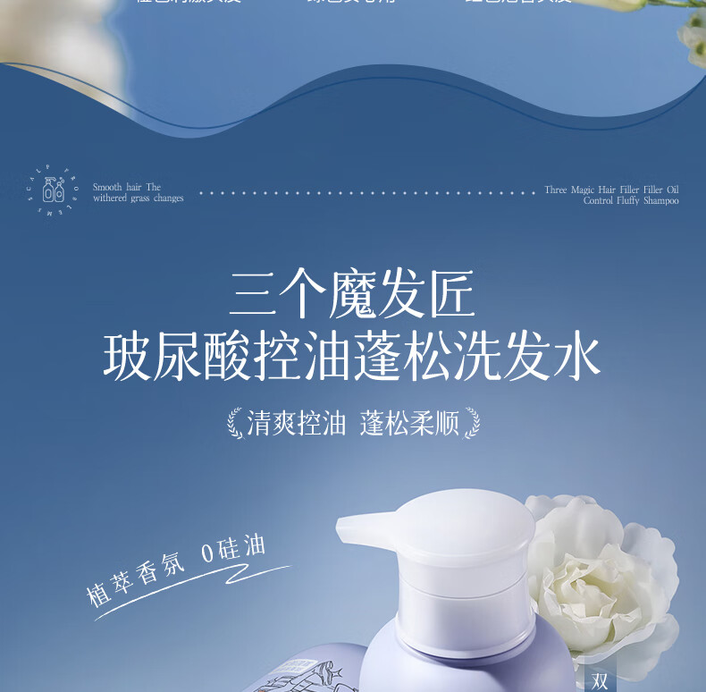 三个魔发匠玻尿酸控油蓬松洗发水 洗护套装头皮补水舒痒男女士氨基酸洗头膏 控油 400ml*1瓶 送补充装洗发水