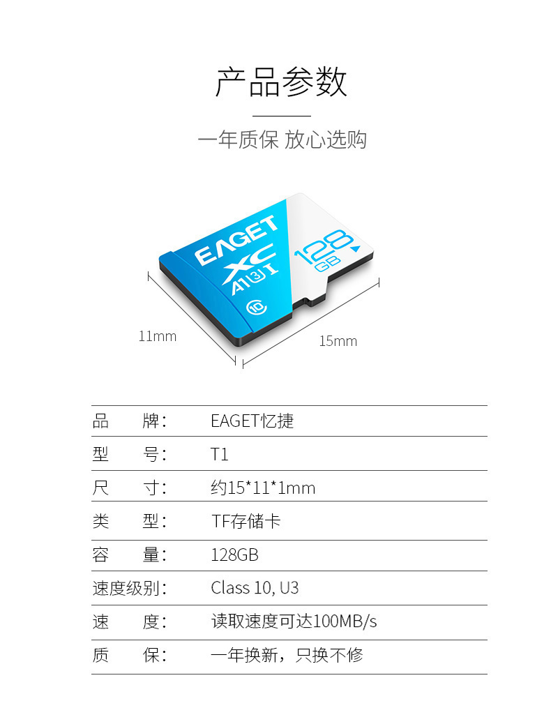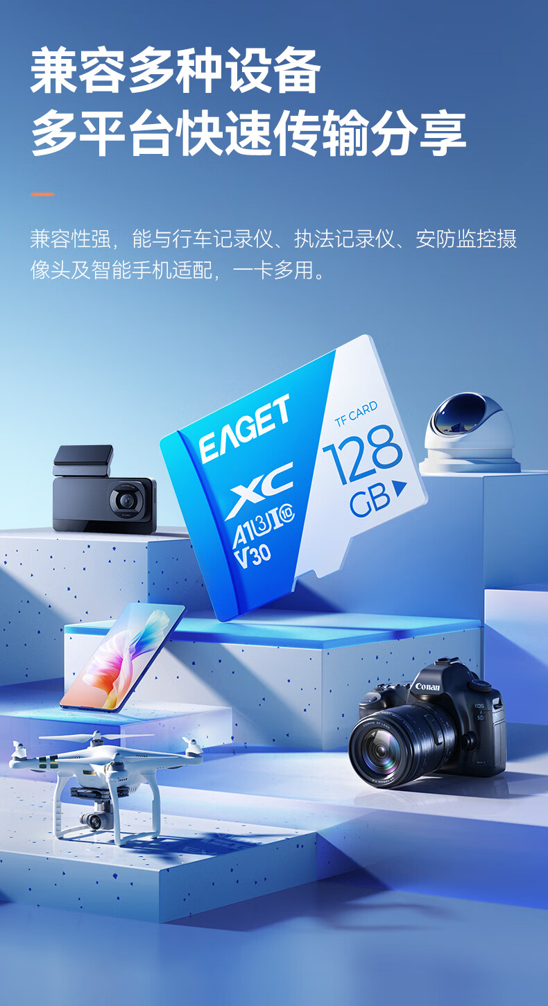 忆捷(EAGET)128GB TF(MicroSD)存储卡 A1 U3 V30 C10行车记录仪&安防监控专用内存卡 高速耐用