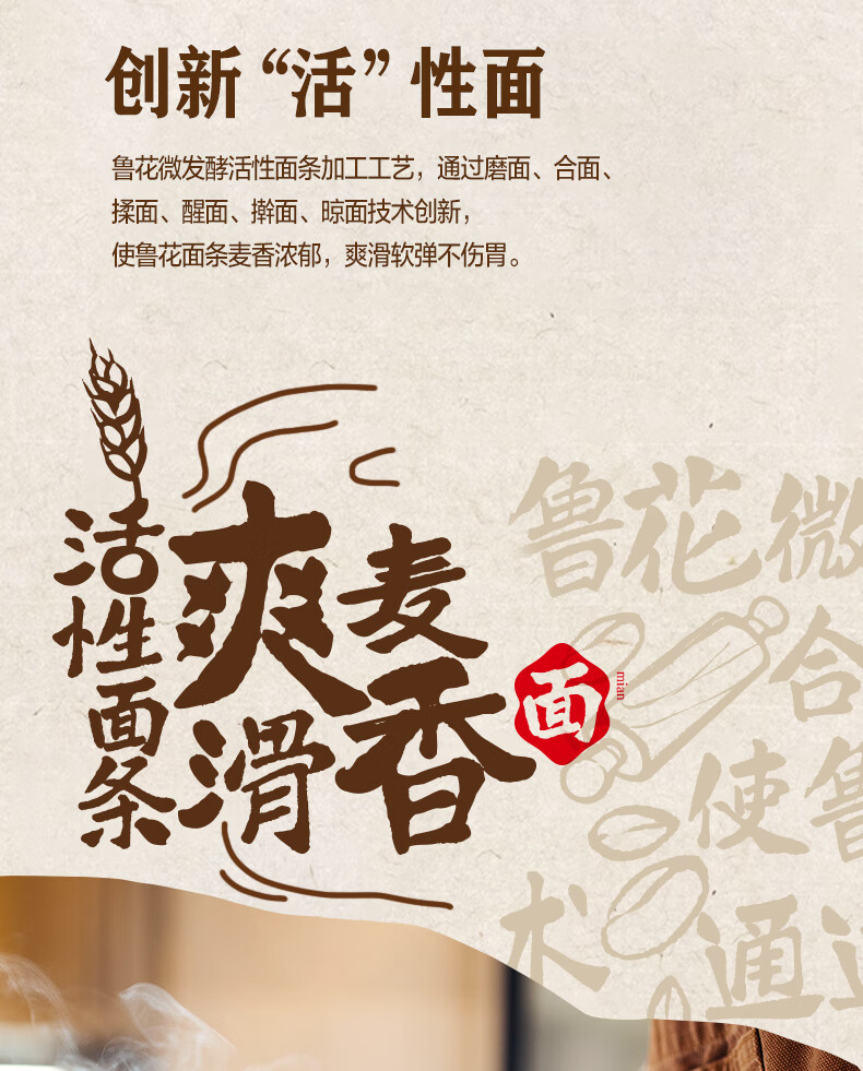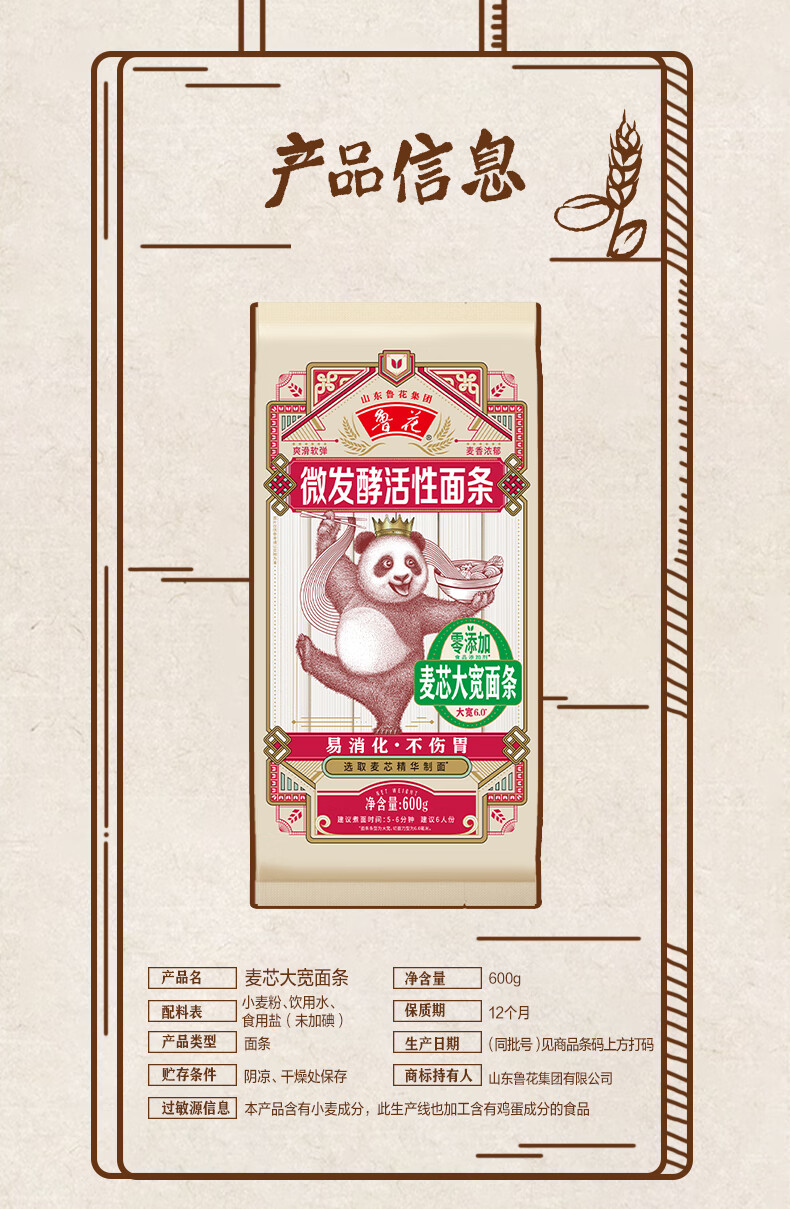 鲁花(熊猫)活性麦芯大宽面条600g 微发酵挂面 仿手工 劲道爽滑