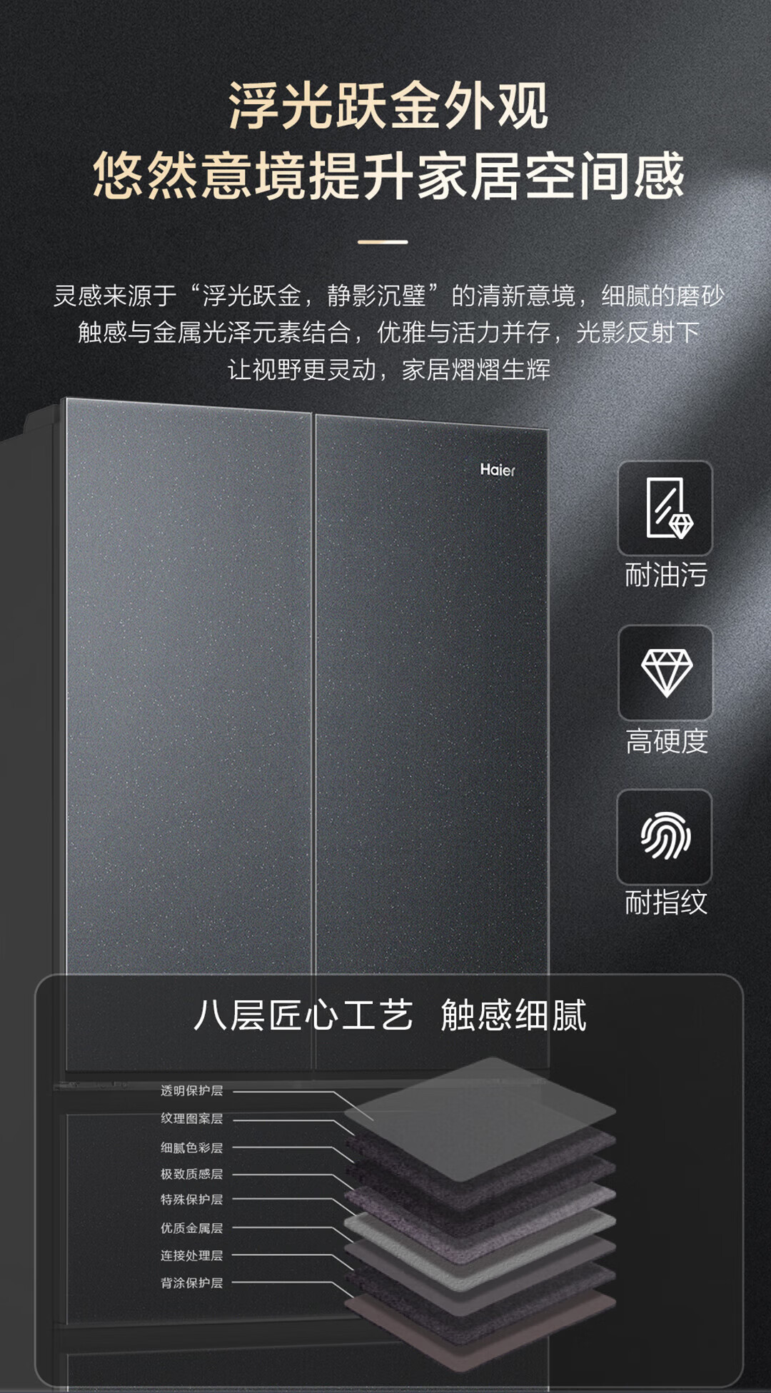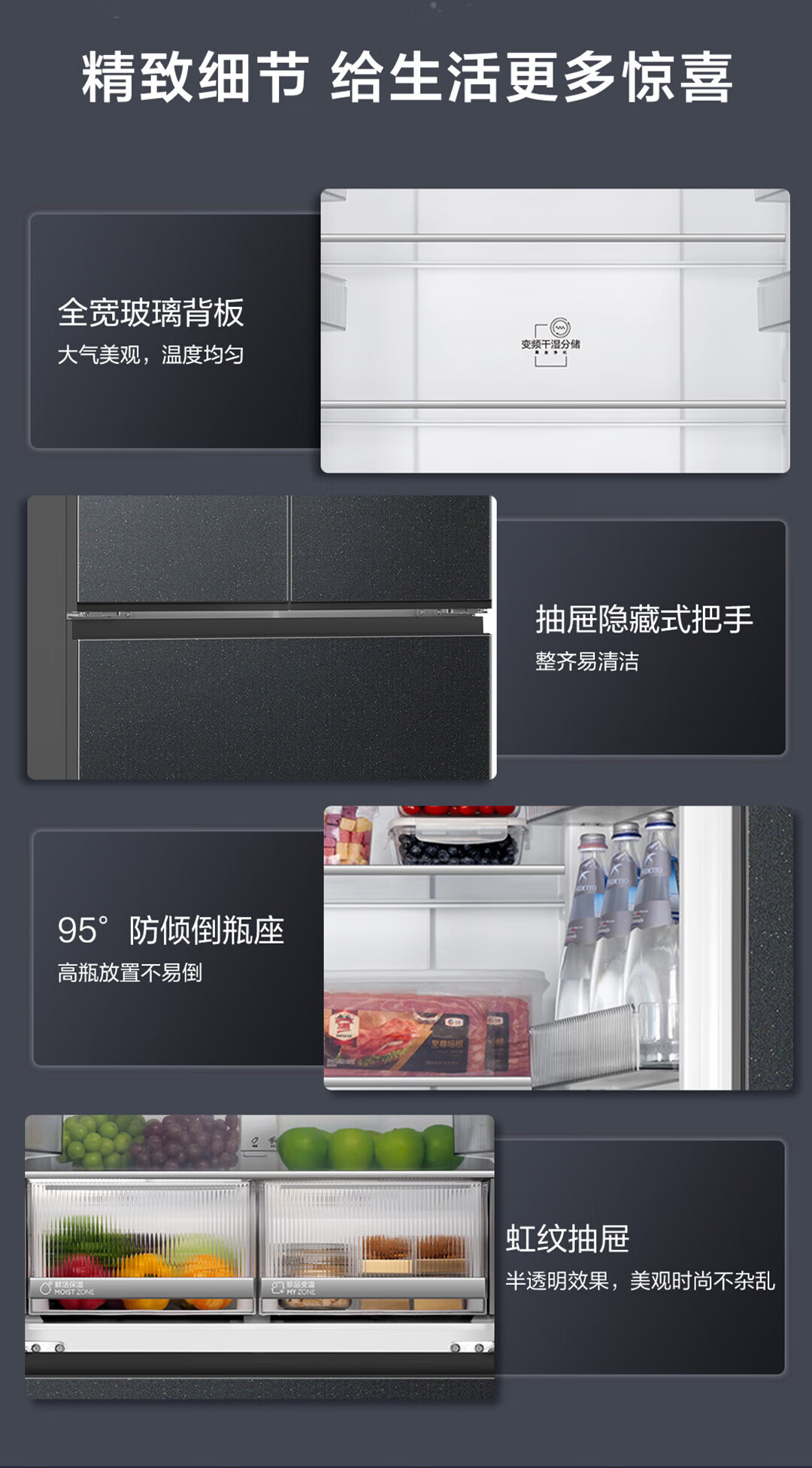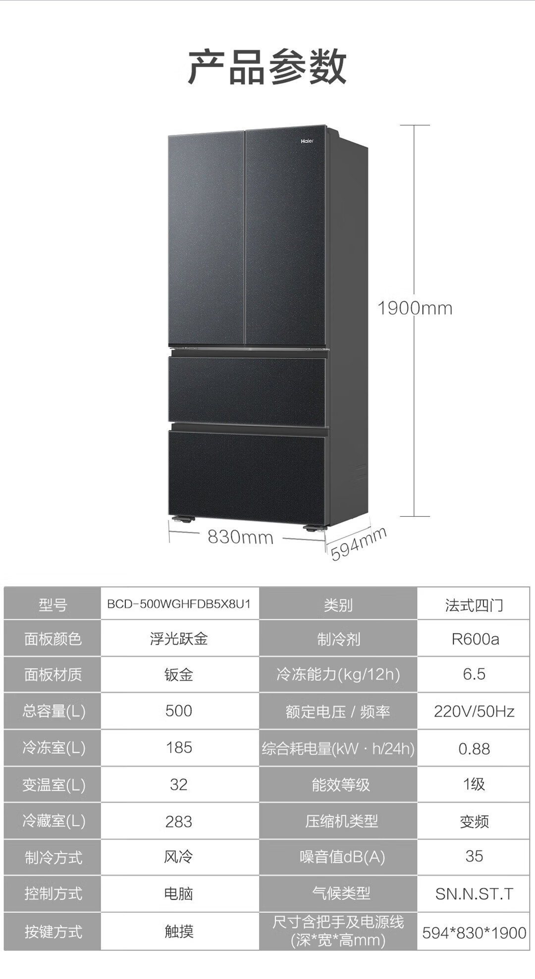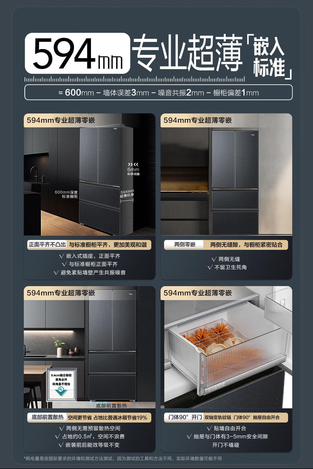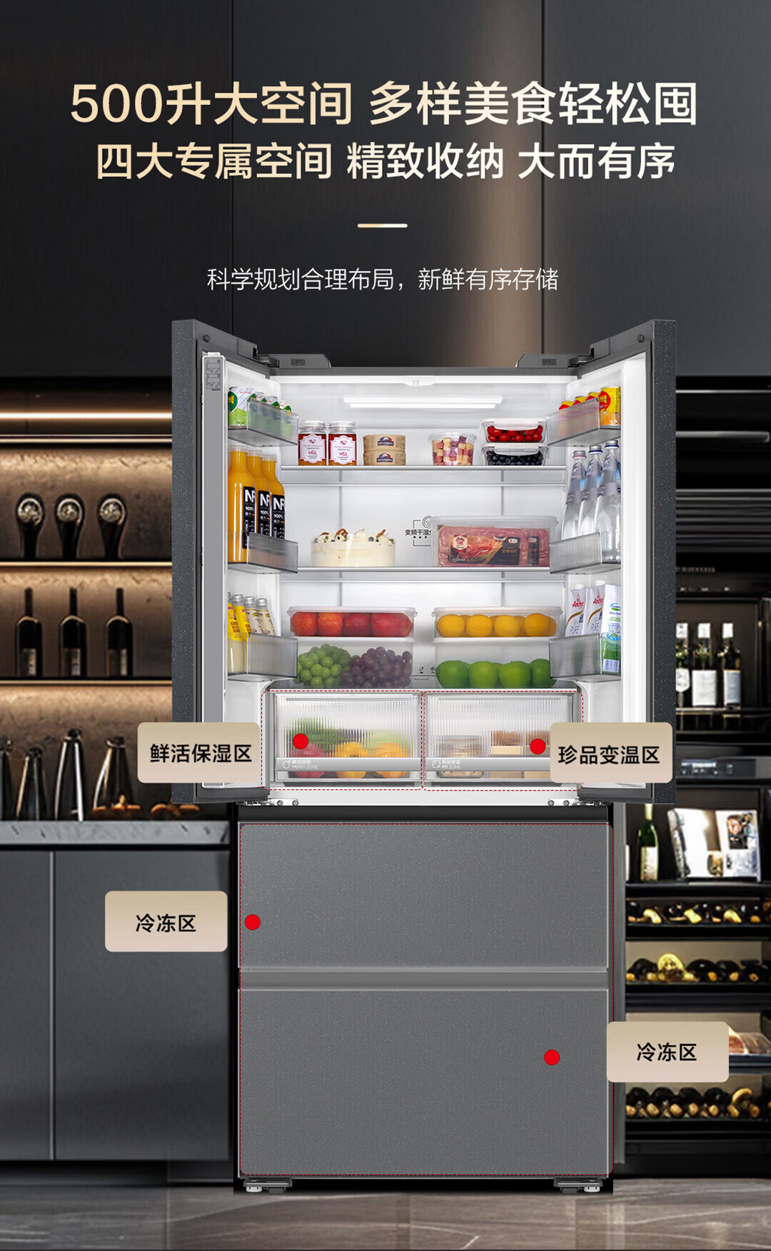 海尔(Haier)500升法式多门冰箱 594mm超薄零距离嵌入式 黑金净化干湿分储一级双变频四开门大容量 BCD-500WGHFDB5X8U1