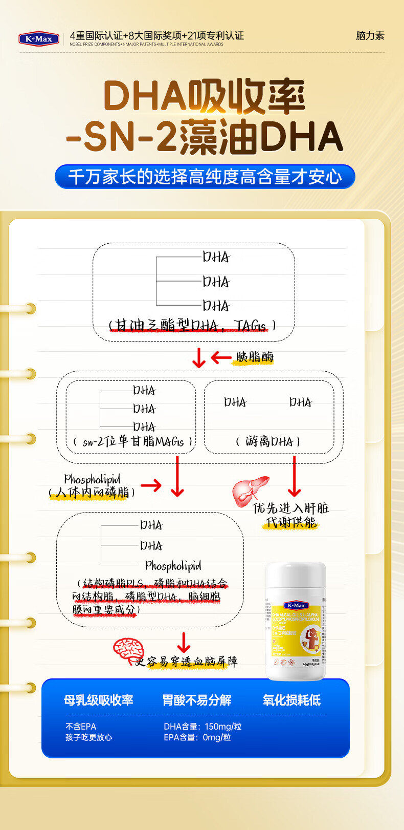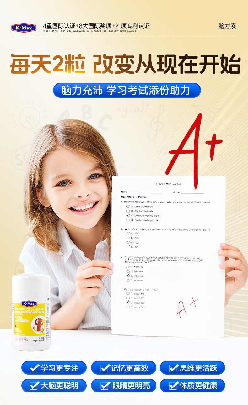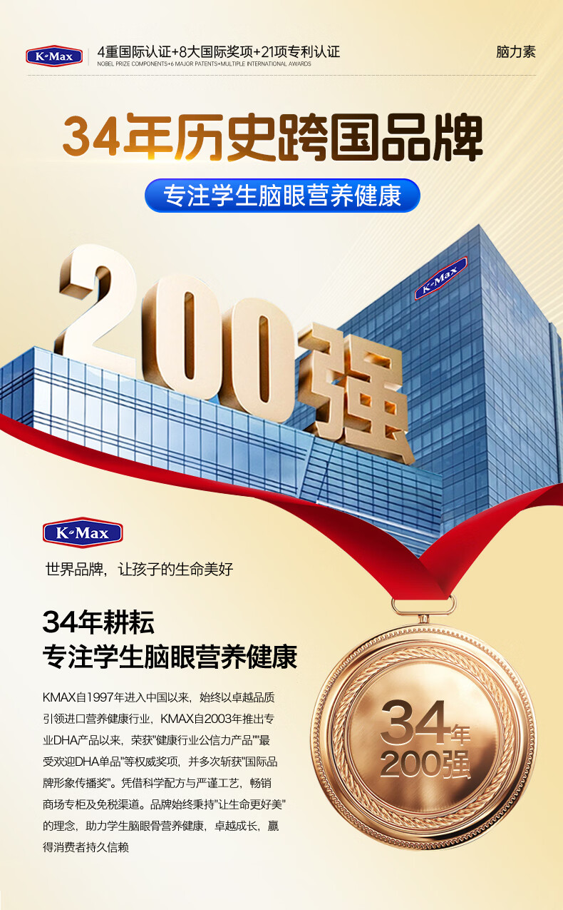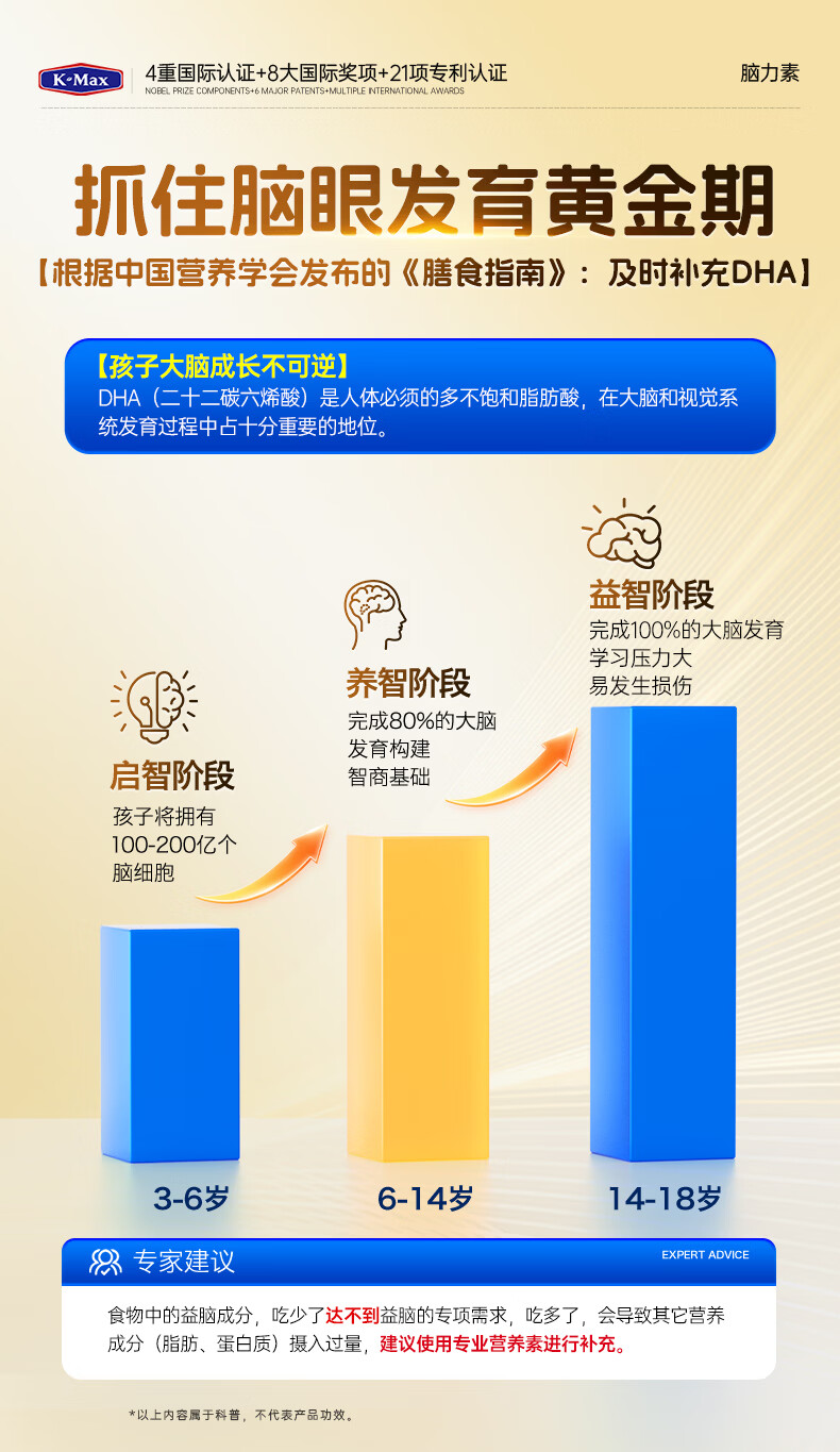 康麦斯(K-Max)【世界记忆大师推荐】学霸慧脑素dha学生青少年6-18岁藻油脑力素 周期装【买2送1/均价142】50粒*3瓶