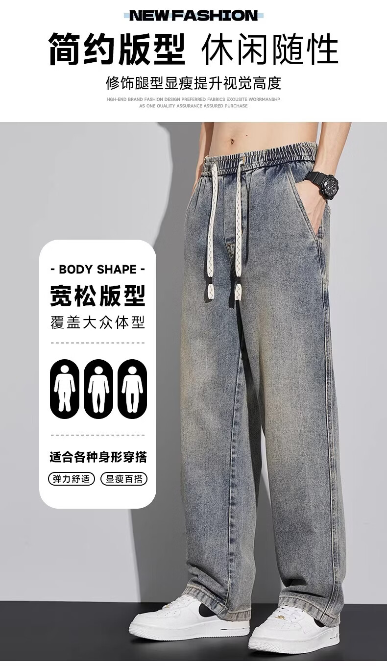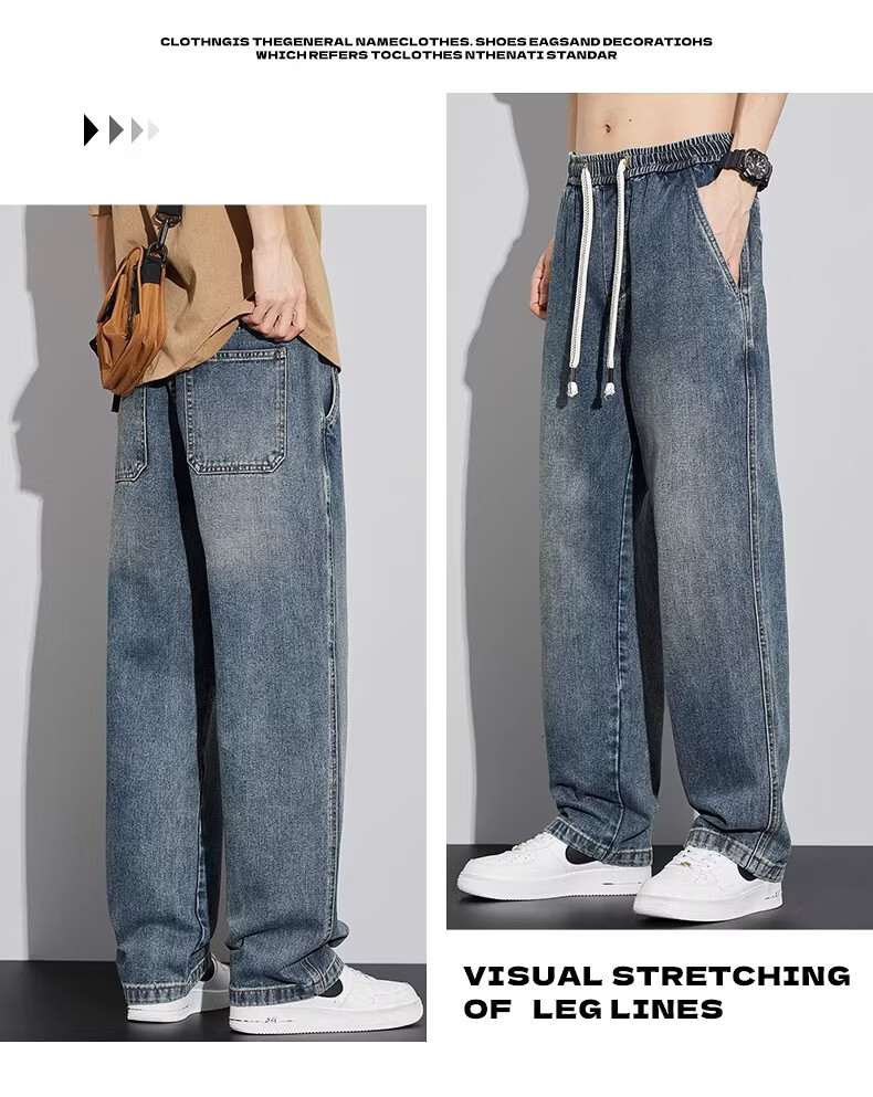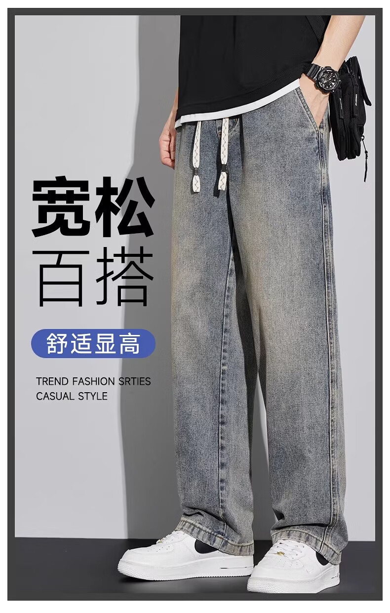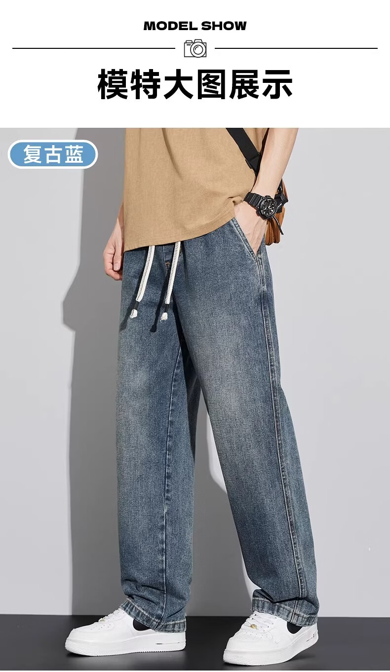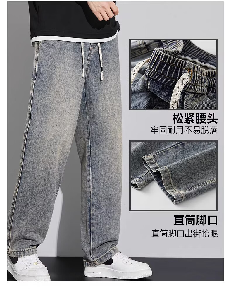 真维斯(Jeanswest)2026新款春季阔腿男士牛仔裤松紧腰直筒宽松潮流垂感休闲长裤子男 复古蓝 M