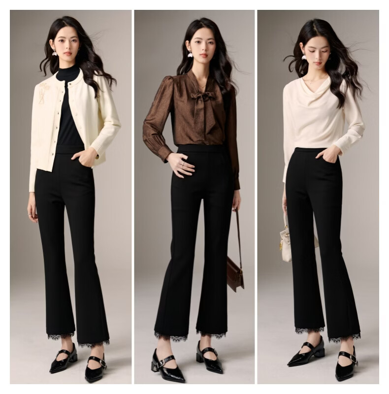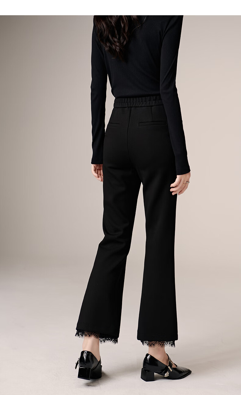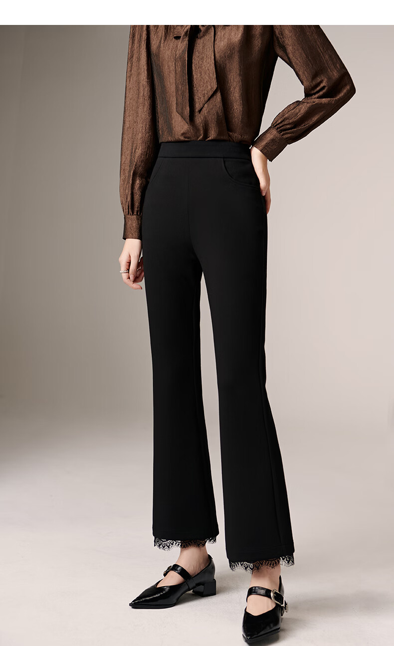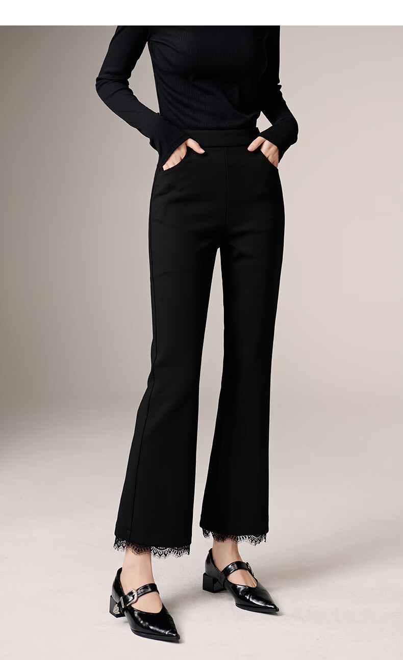 晚白【修饰腿型超显瘦】气质微喇裤2026春款高腰蕾丝边裤子时尚休闲裤 黑色 27