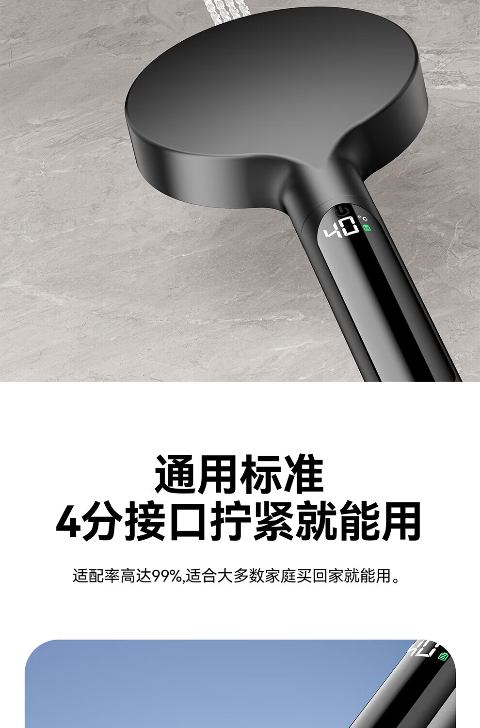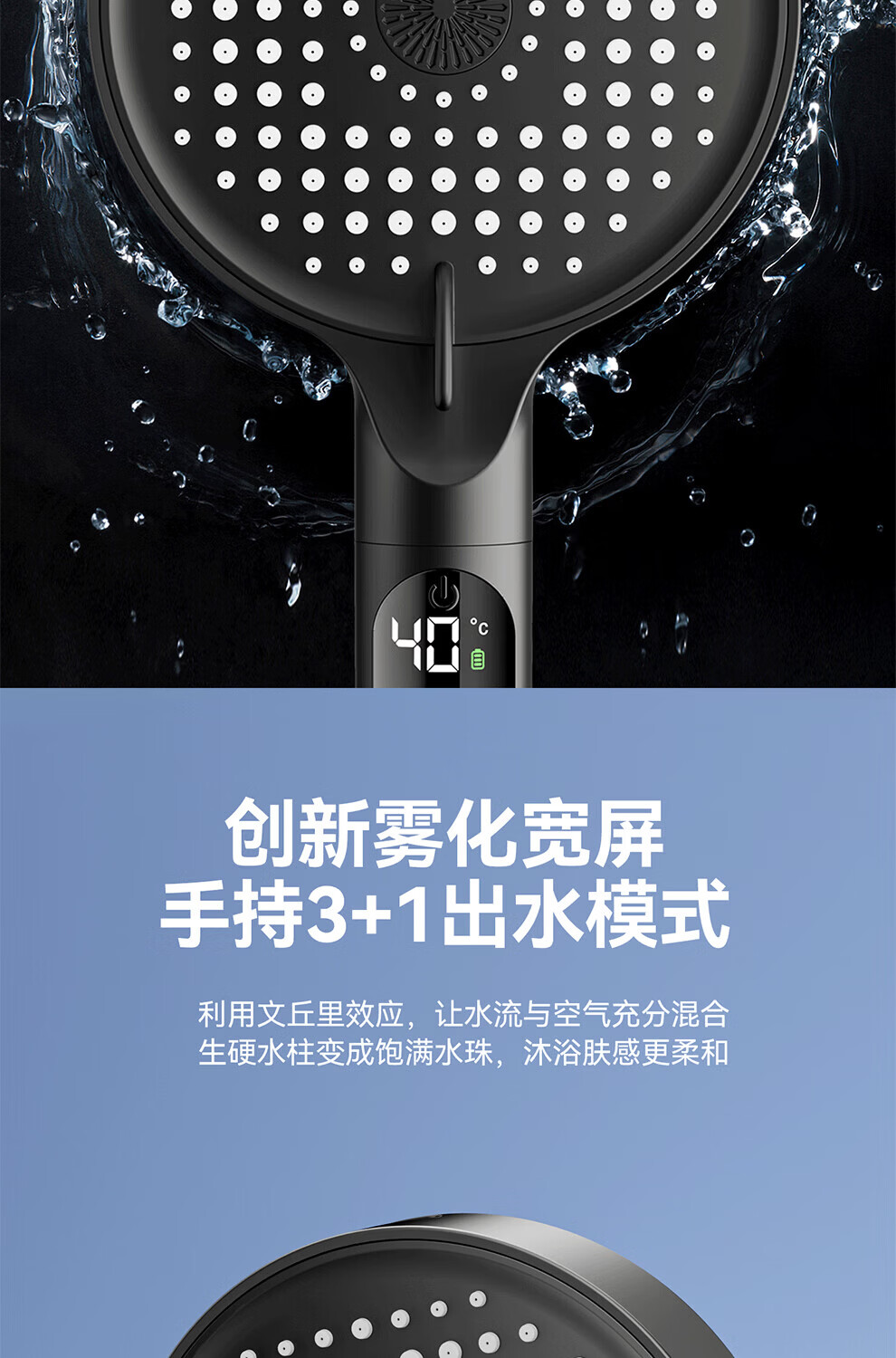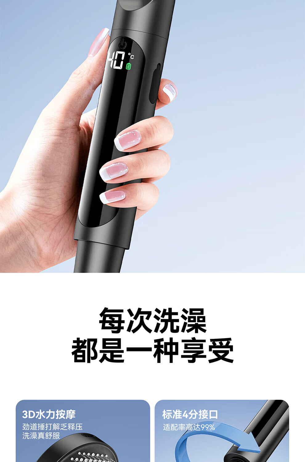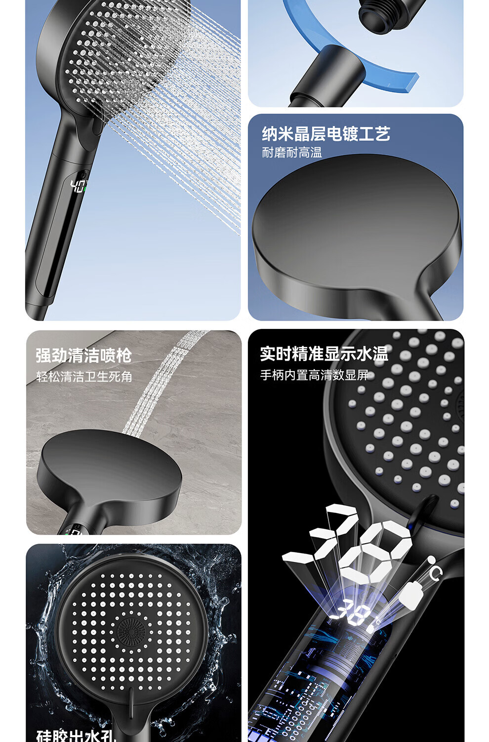 JOMOW增压花洒喷头数显家用多功能显示水温度数大面板淋浴手持喷头 【枪灰数显款】1.5米防爆管+免安装墙座
