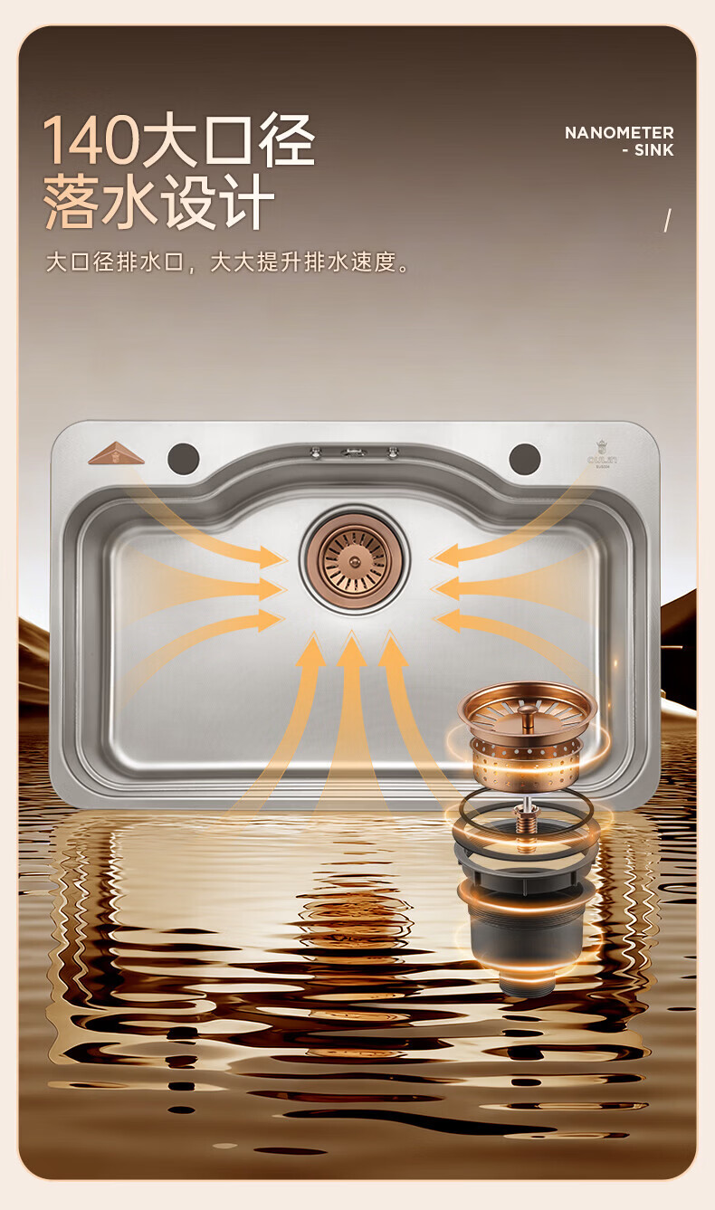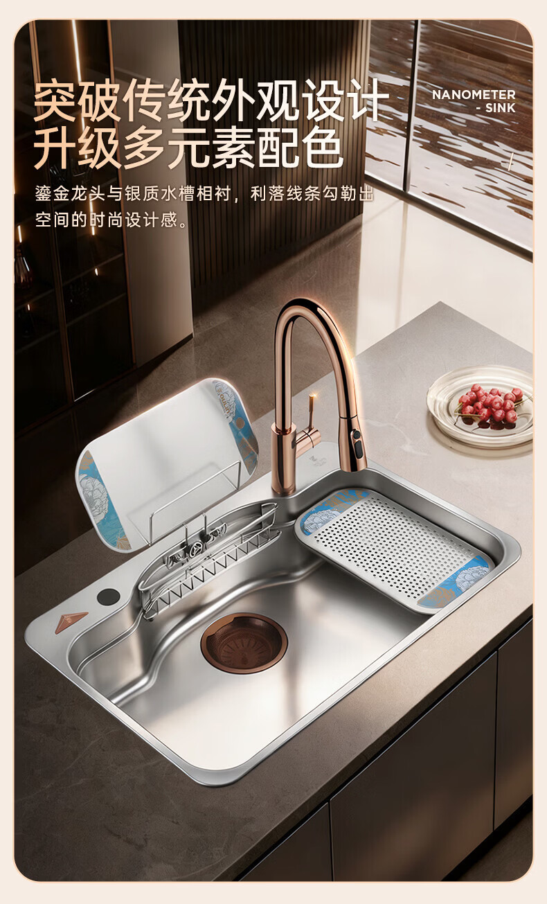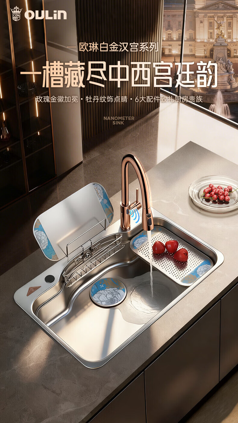 欧琳(OULIN)白金汉宫水槽304不锈钢厨房大单槽压纹耐刮洗碗池家用轻奢洗菜盆 鎏金轻奢日式收纳槽 外观780mm*500mm