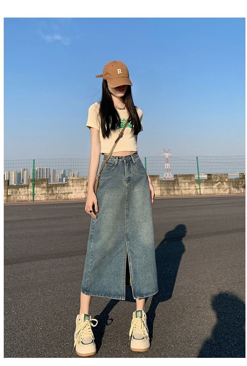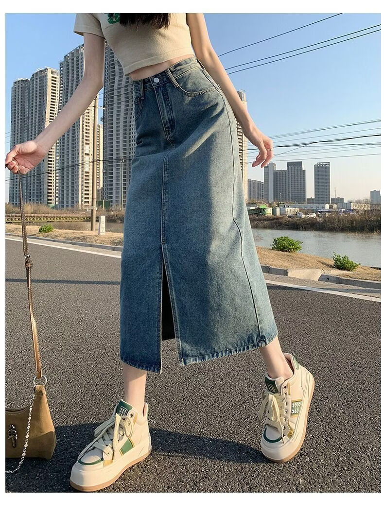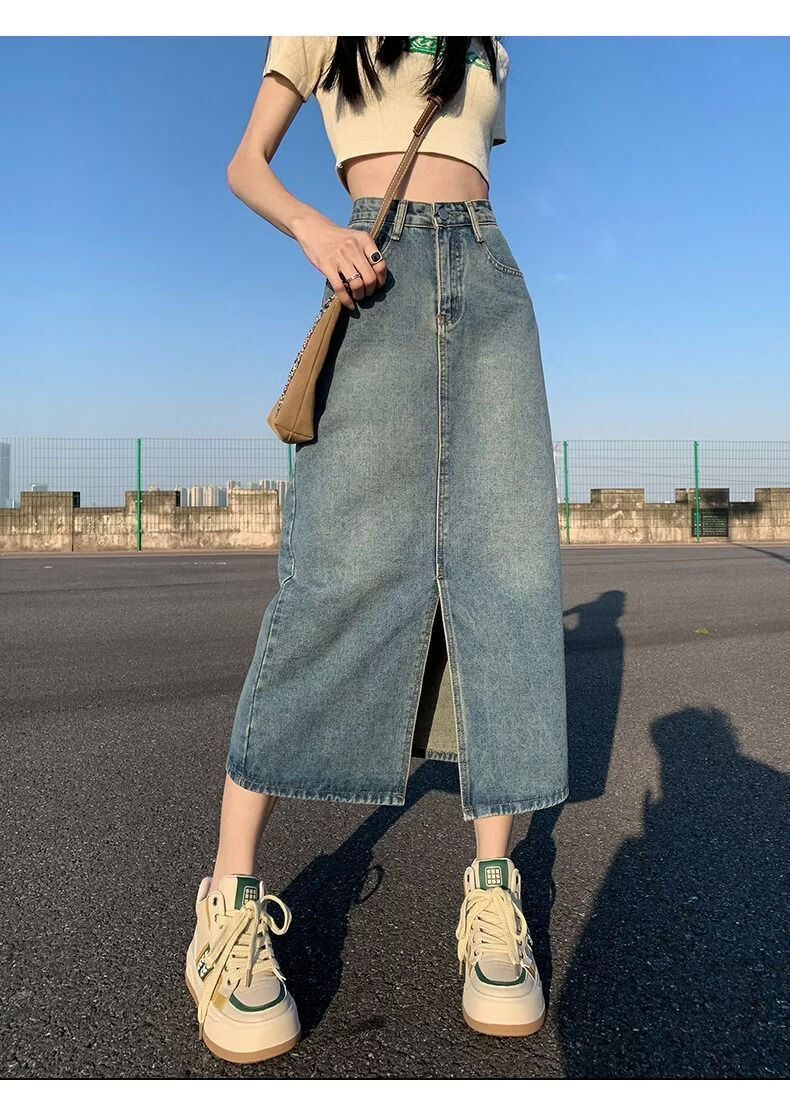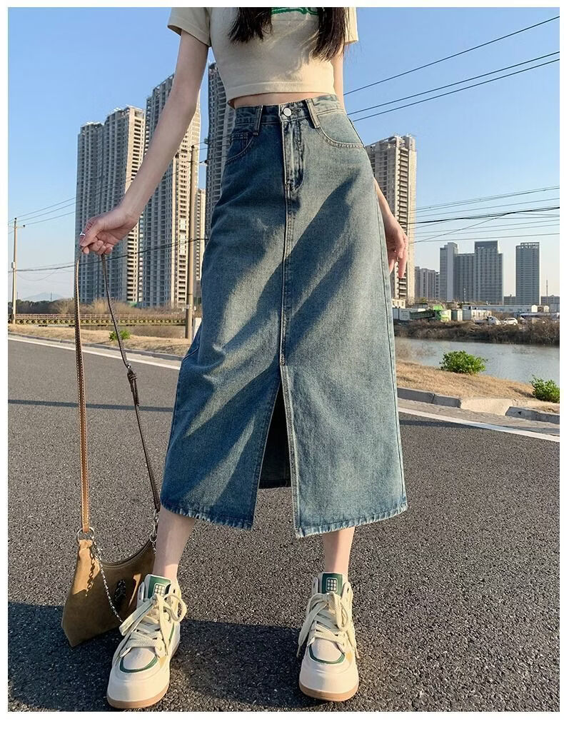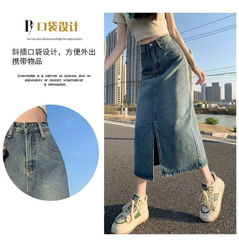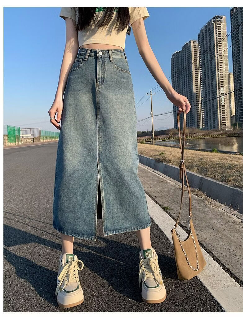 CronetKcnsy2026春秋款复古开叉牛仔半身裙女宽松显瘦高腰中长款百搭a字裙子 2-22复古蓝 L 推荐105-115斤