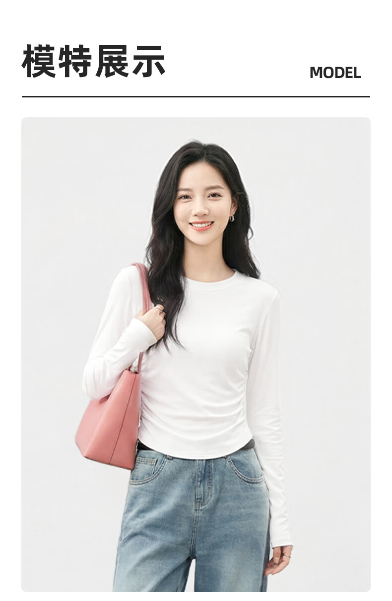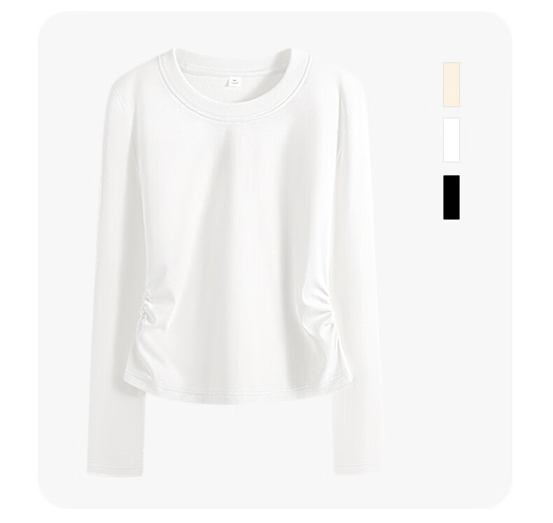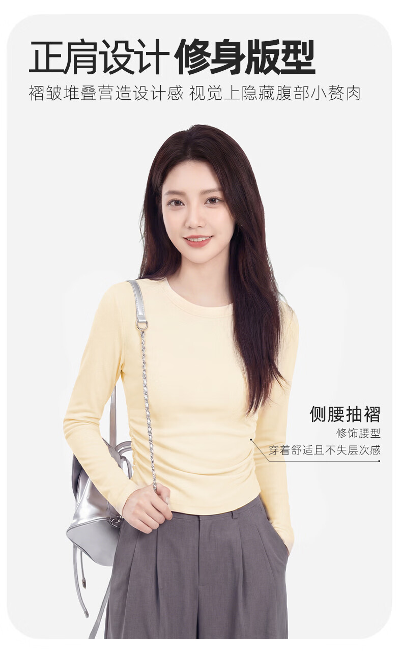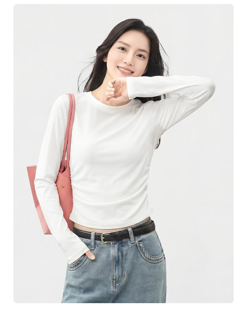 真维斯(Jeanswest)韩系圆领长袖t恤女款2026早春款洋气褶皱收腰体恤修身显瘦打底衫 杏色 彩色风格 S