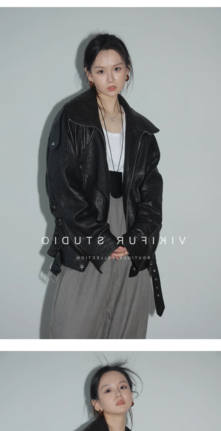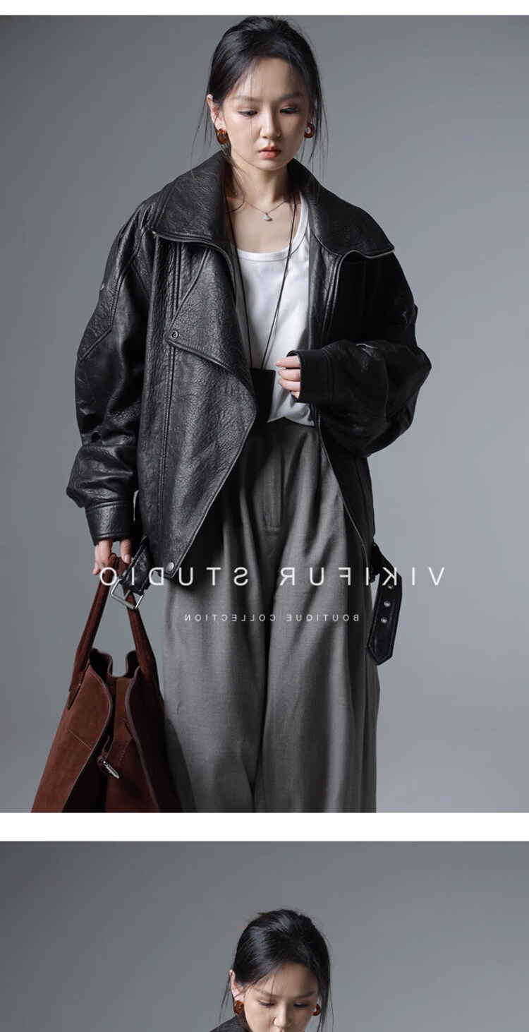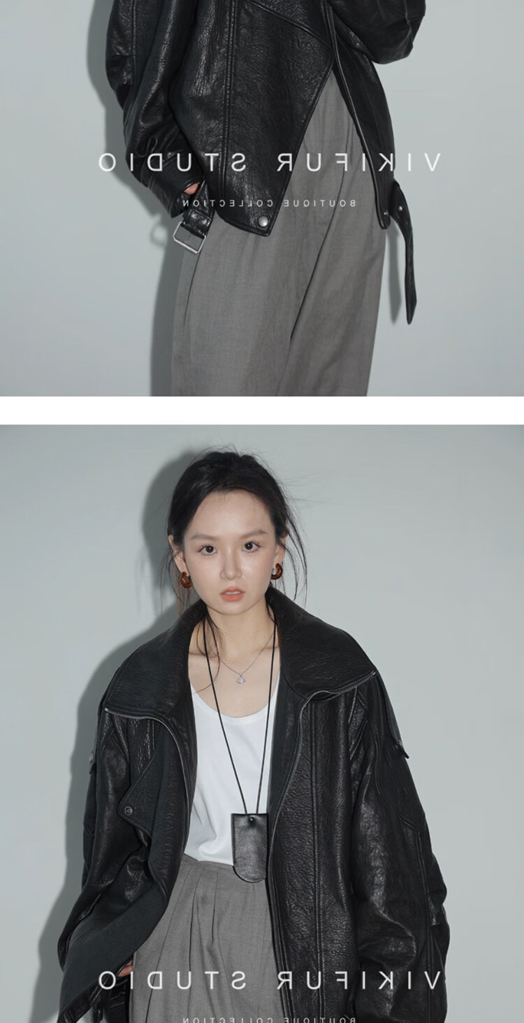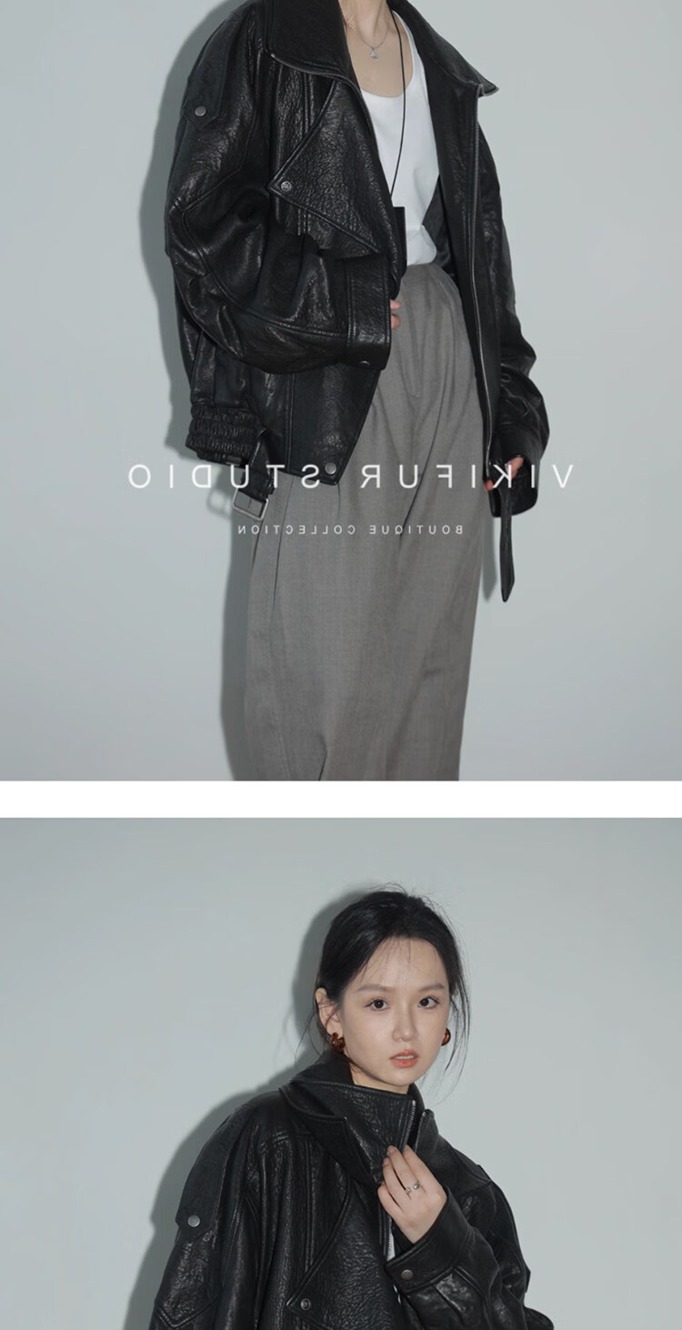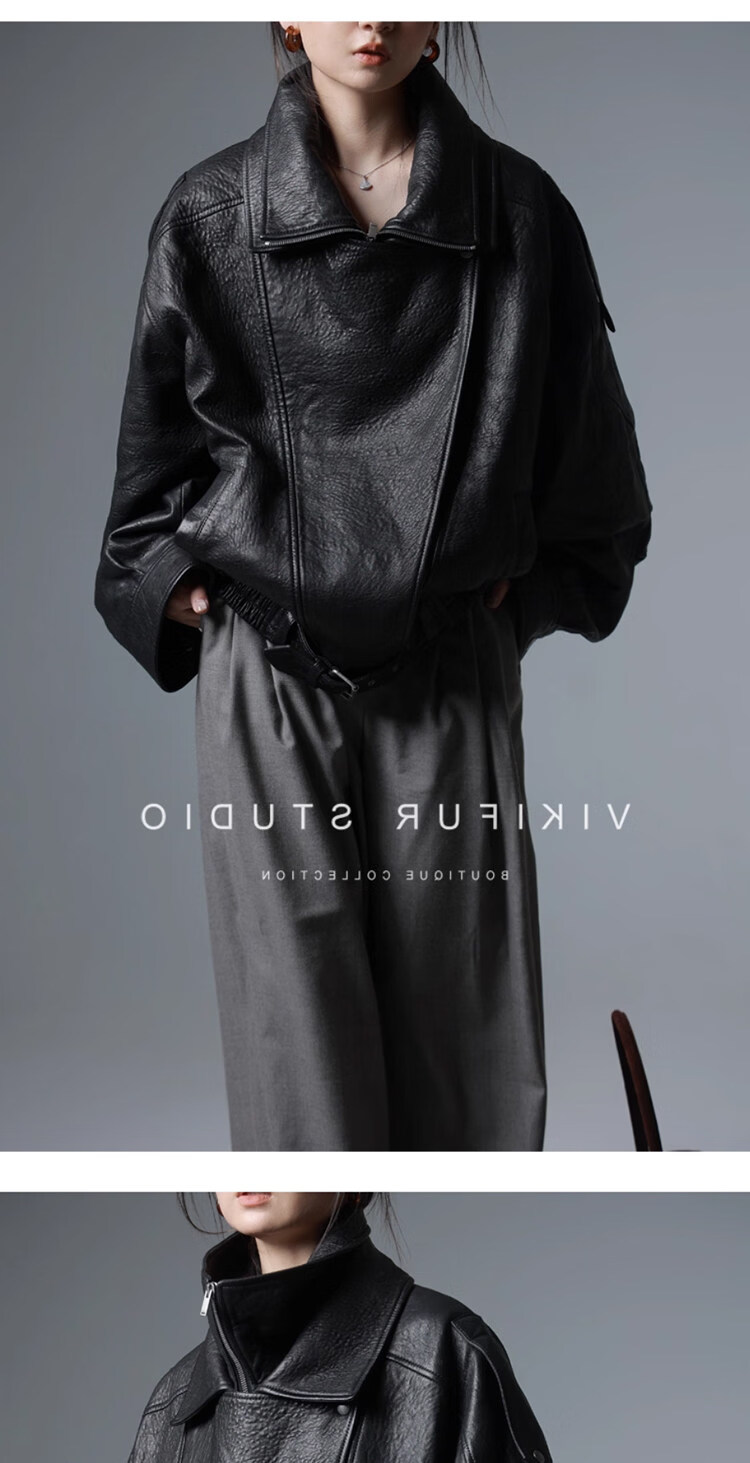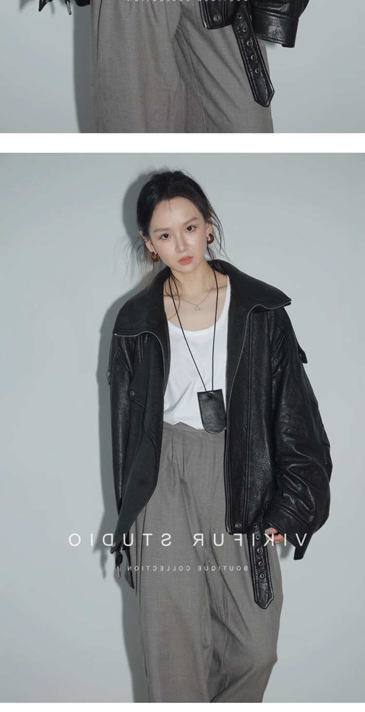 MODX25年秋季新款摩登羊羔泡皮重工双层领廓形真皮夹克女皮衣外套 经典黑 XS