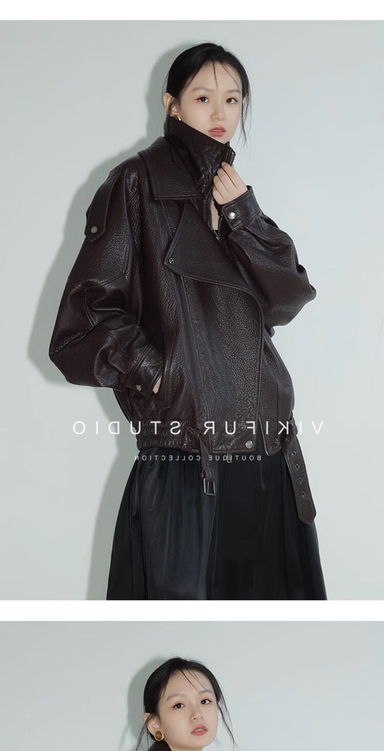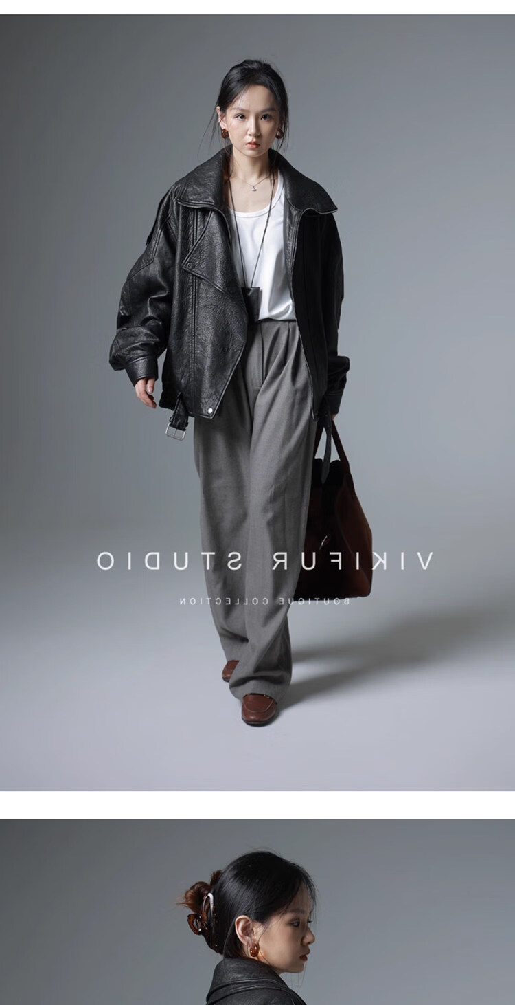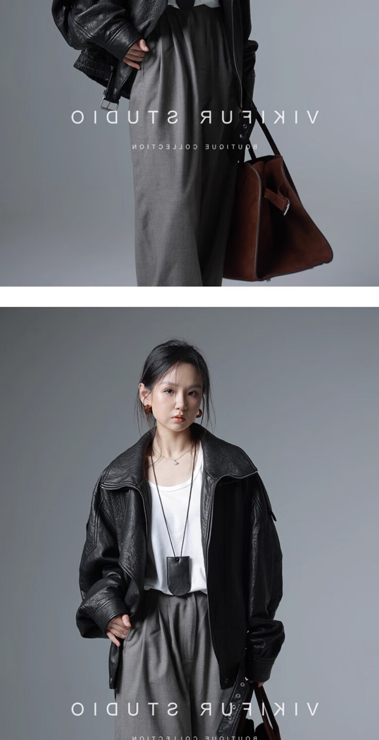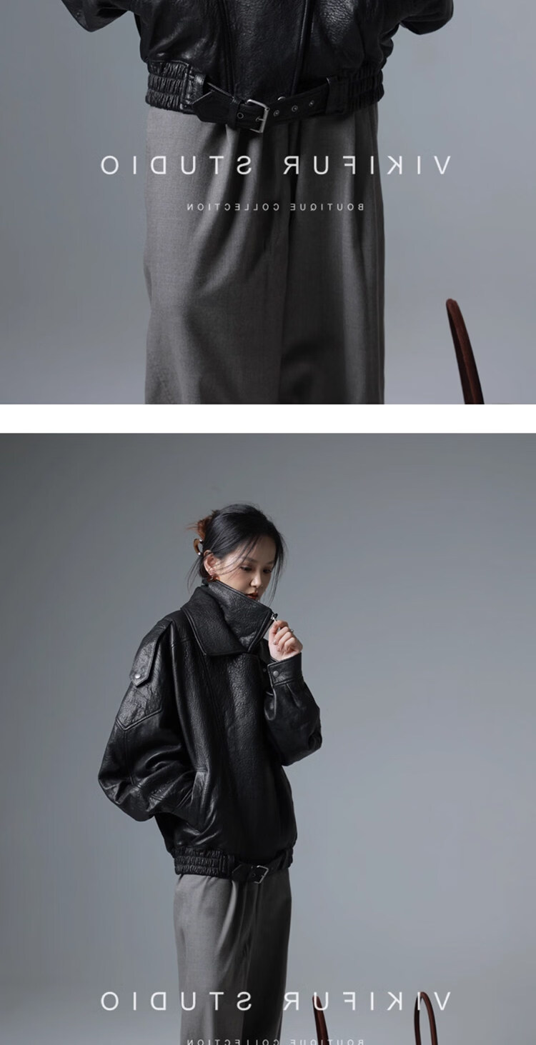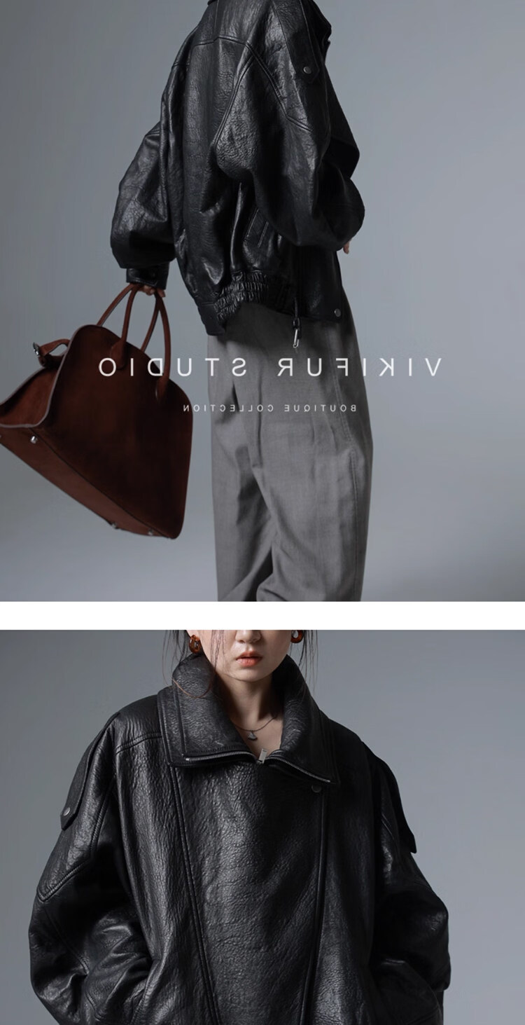 MODX25年秋季新款摩登羊羔泡皮重工双层领廓形真皮夹克女皮衣外套 经典黑 XS