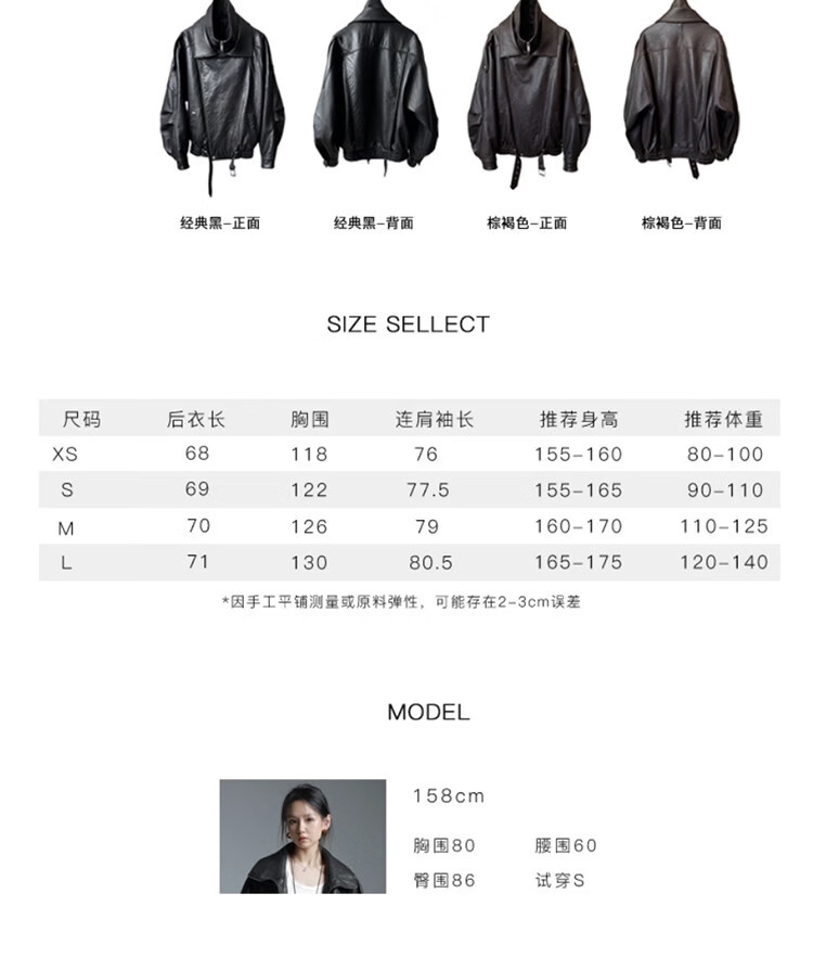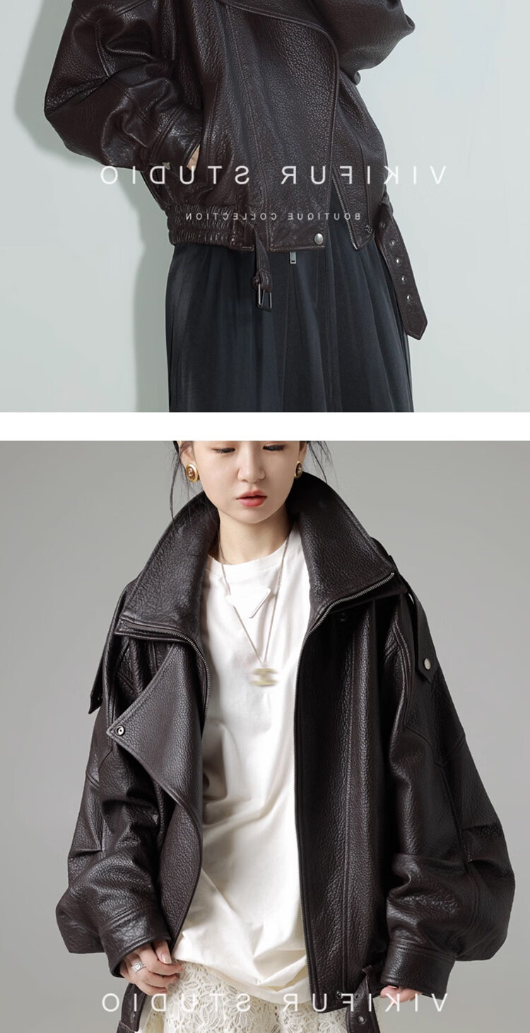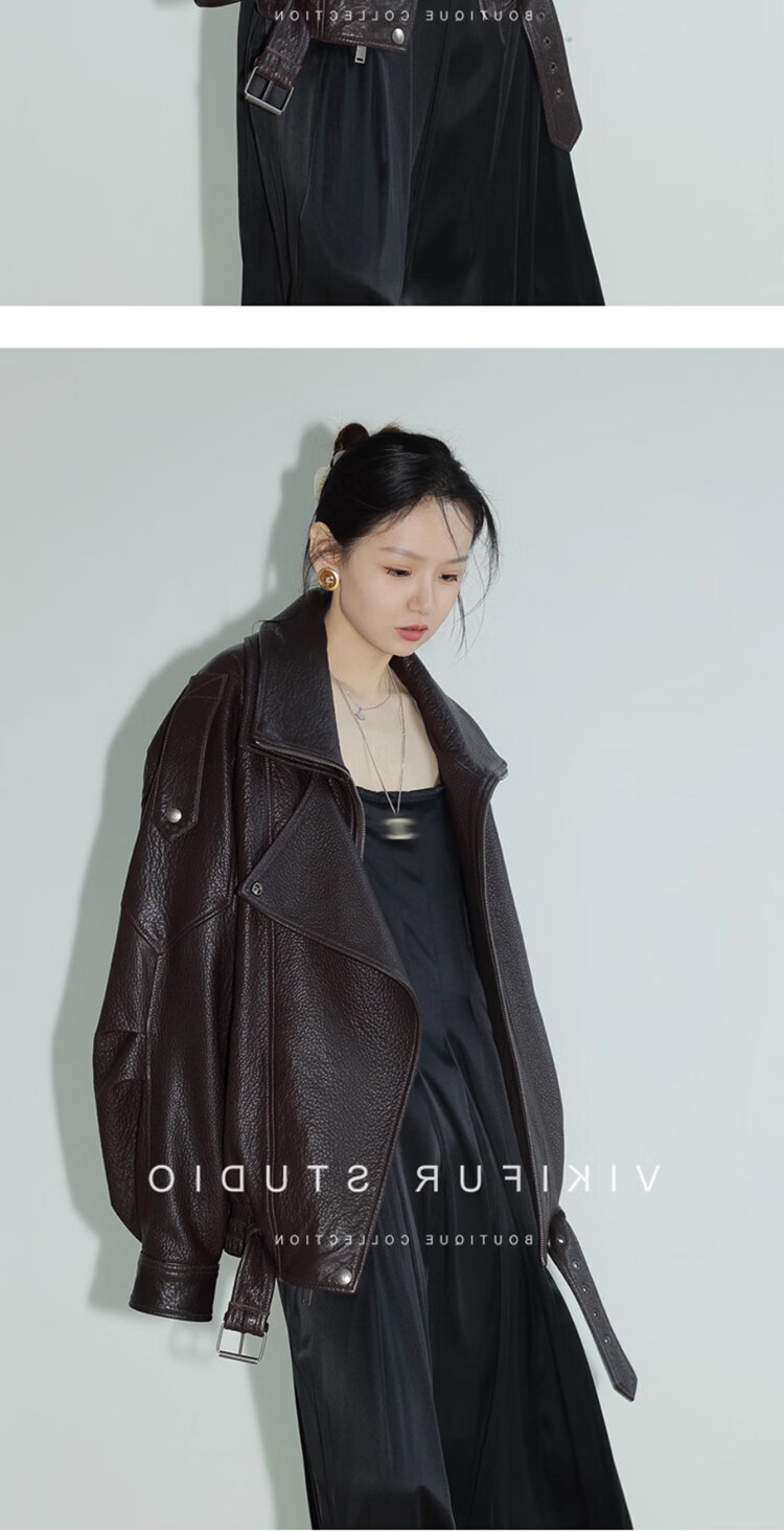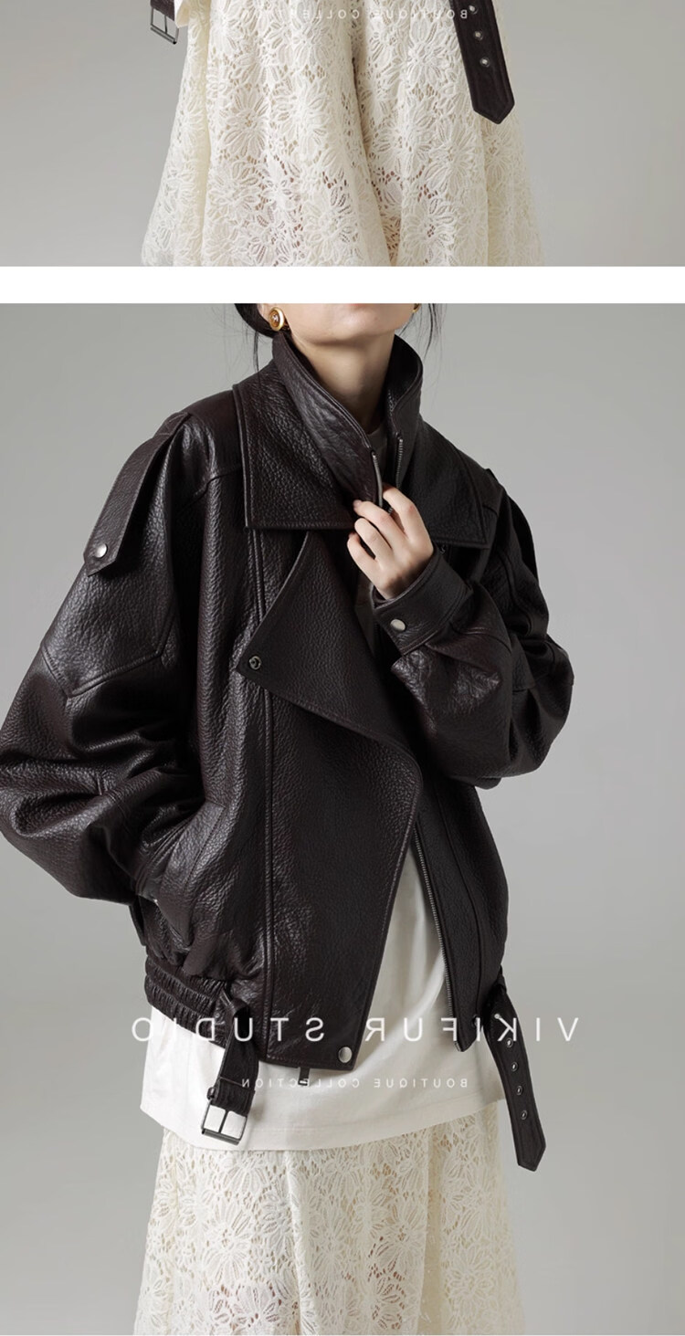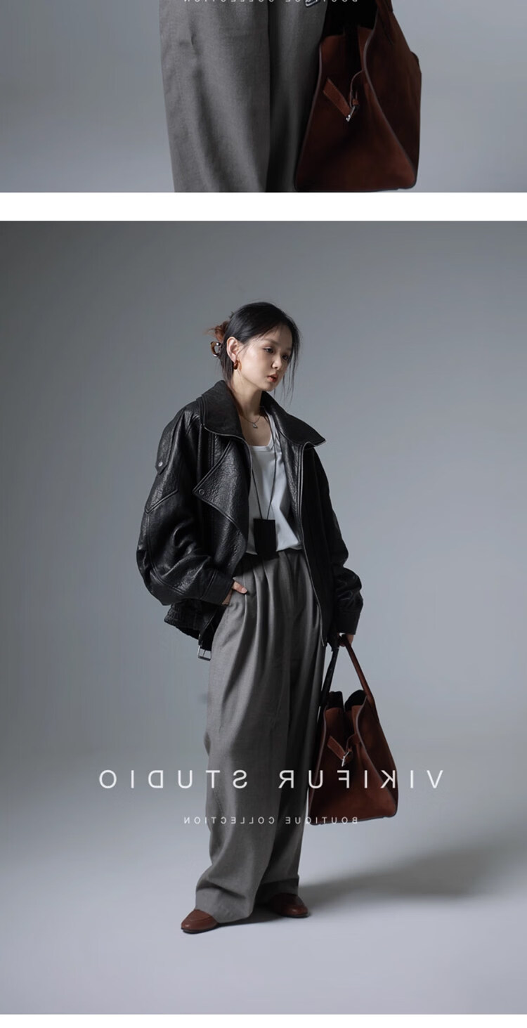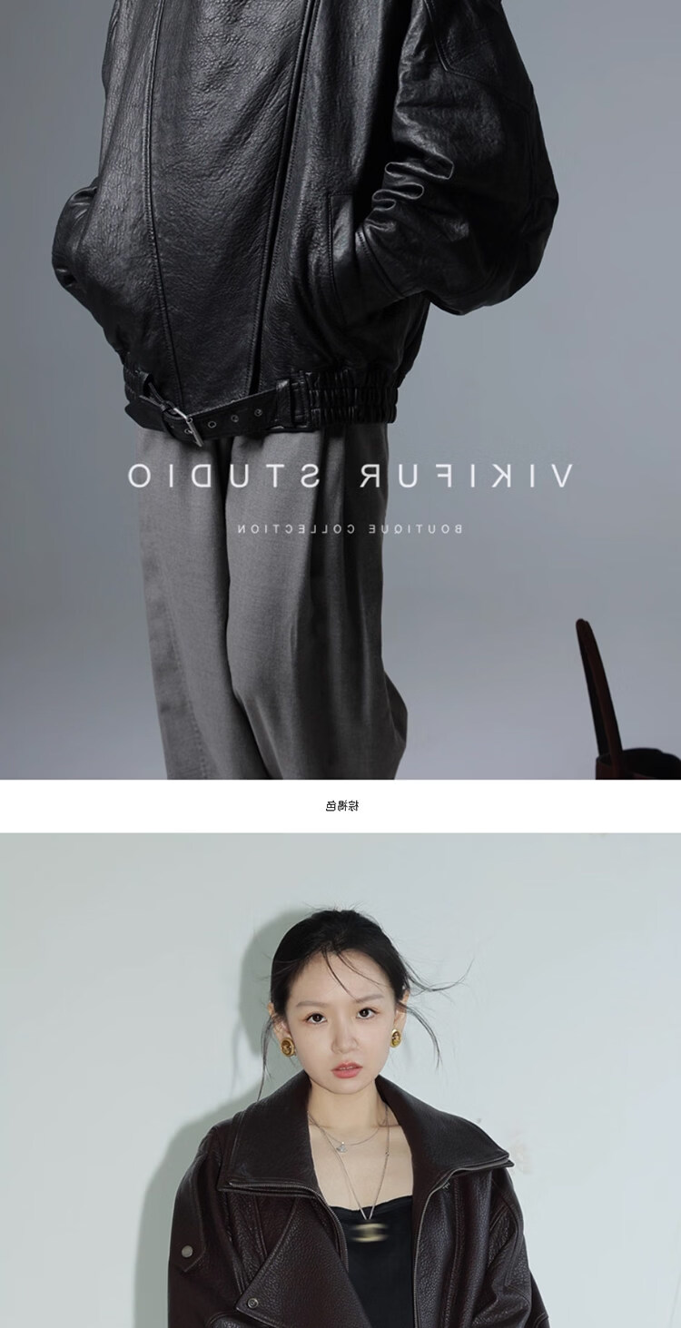 MODX25年秋季新款摩登羊羔泡皮重工双层领廓形真皮夹克女皮衣外套 经典黑 XS