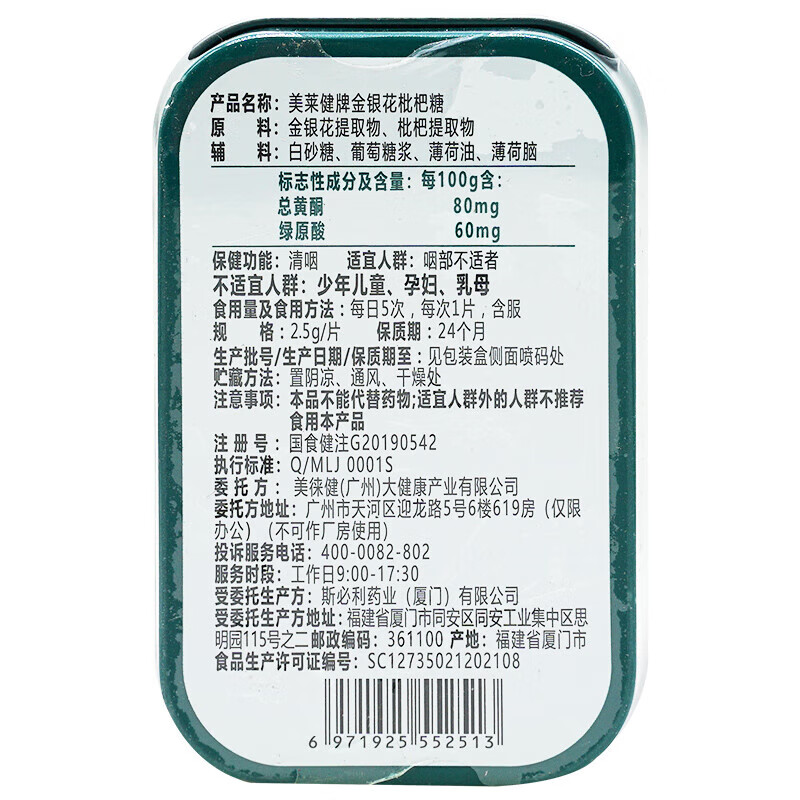 慢严舒柠美莱健牌薄荷糖成人男女士儿童铁盒装舒灵 金银花枇杷糖*1盒