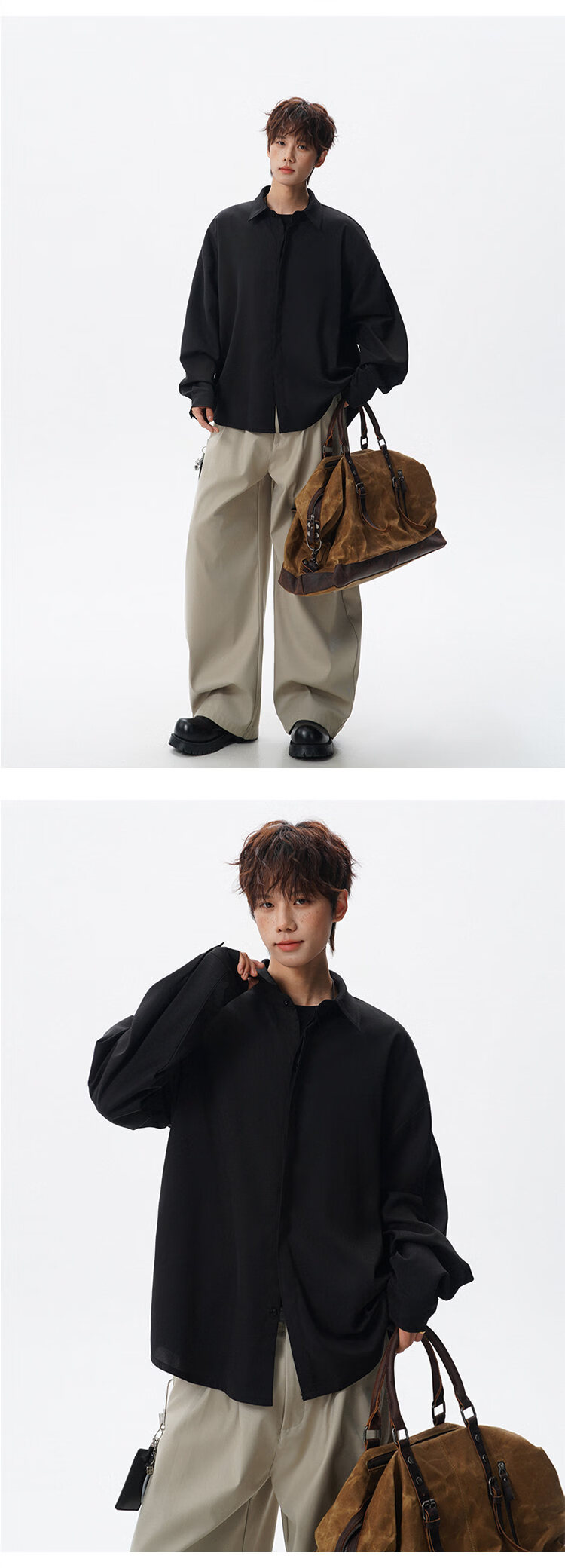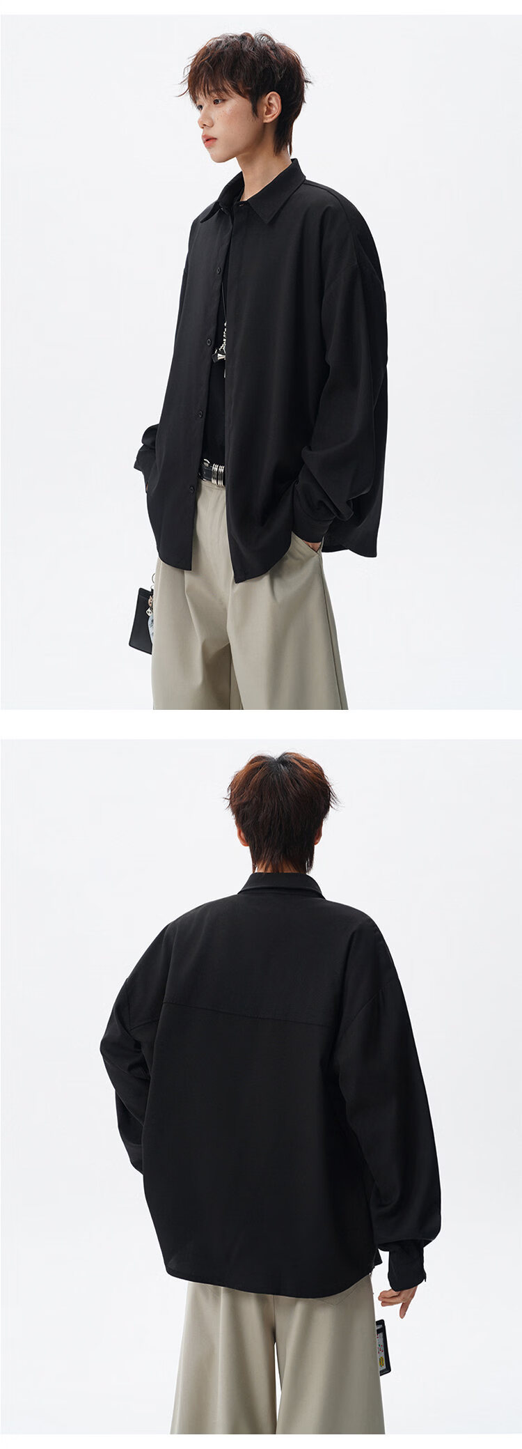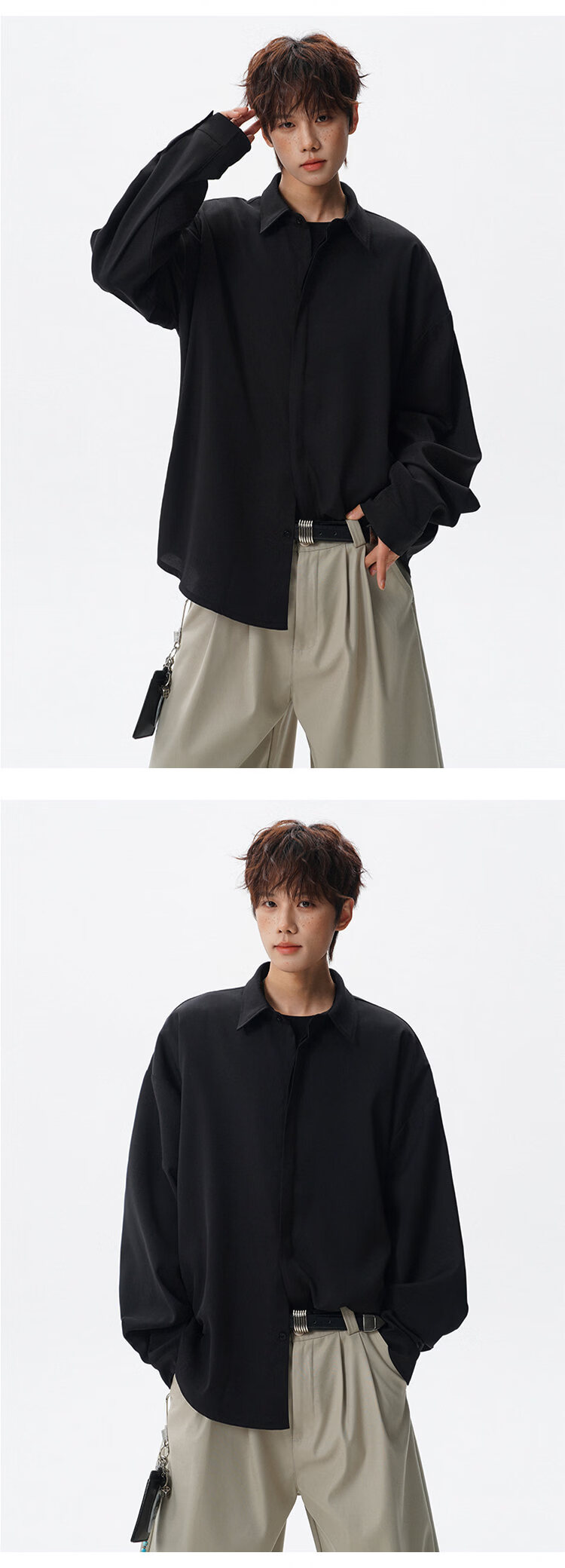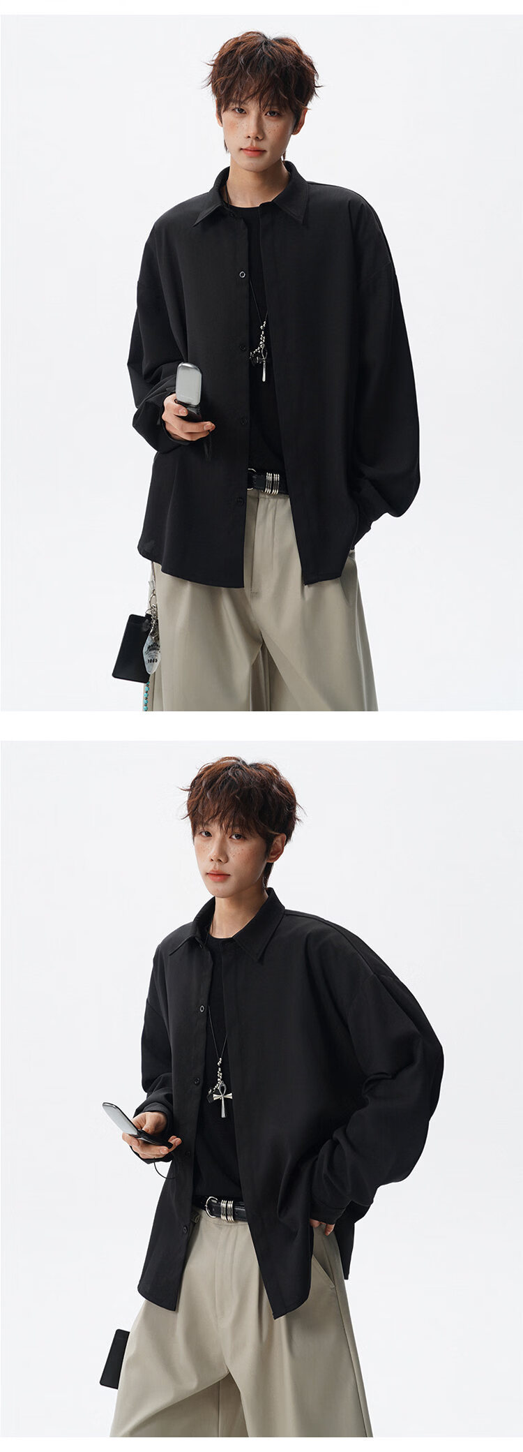 NEW OR MODE韩版垂感冰丝长袖衬衫男士夏季新款美式潮流痞帅宽松凉感衬衣外套 黑色【高品质】 M 【建议90-110斤】