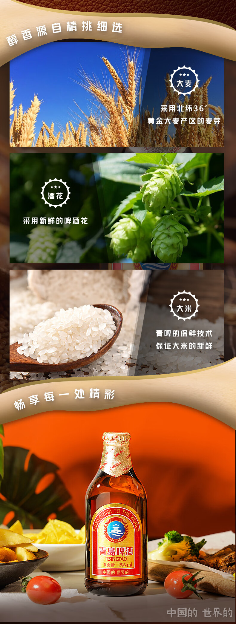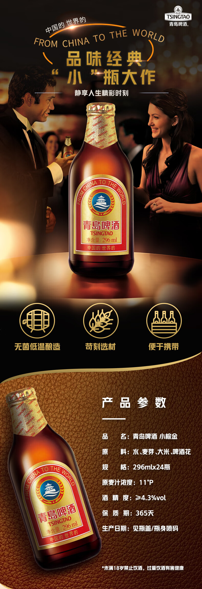 青岛啤酒(TsingTao)金质小棕金经典啤酒原麦汁浓度11°P便携出游整箱装 296mL 24瓶