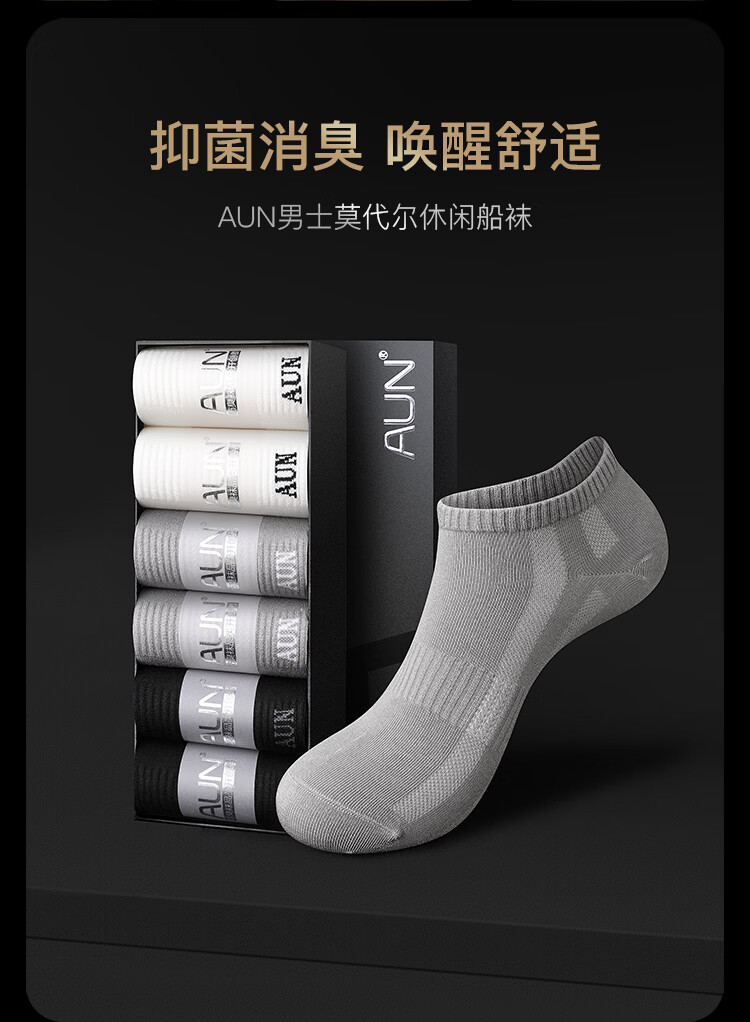 AUN袜子男士短袜莫代尔夏季薄款抗菌防臭吸汗透气低帮运动船袜 (混色)2黑2白2灰 均码