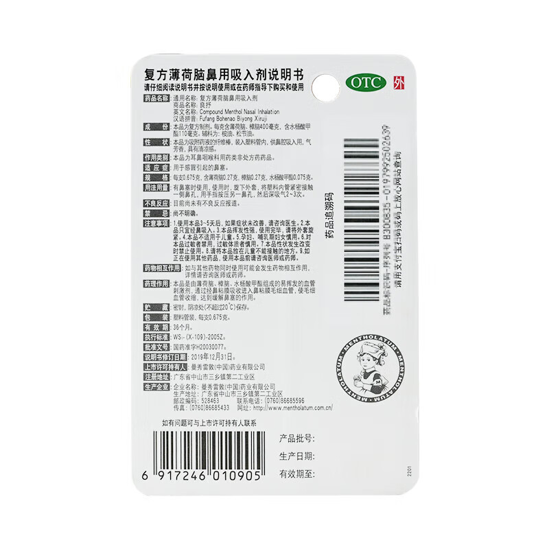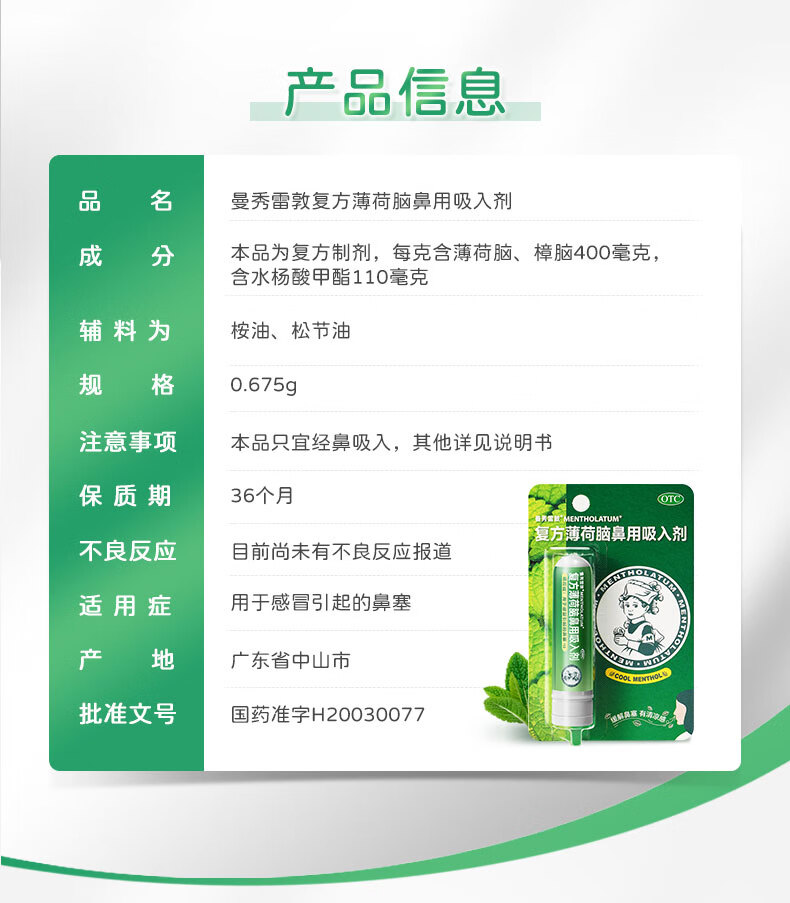 曼秀雷敦 复方薄荷脑鼻用吸入剂 0.675g 鼻通 通鼻神器 鼻吸 缓解感冒鼻塞 季节性过敏性鼻炎 晕车防困