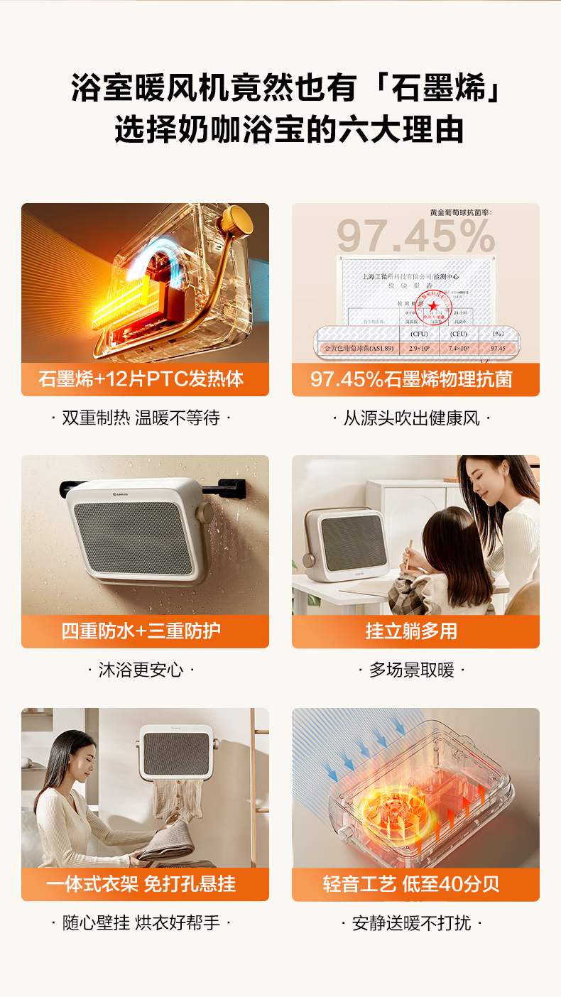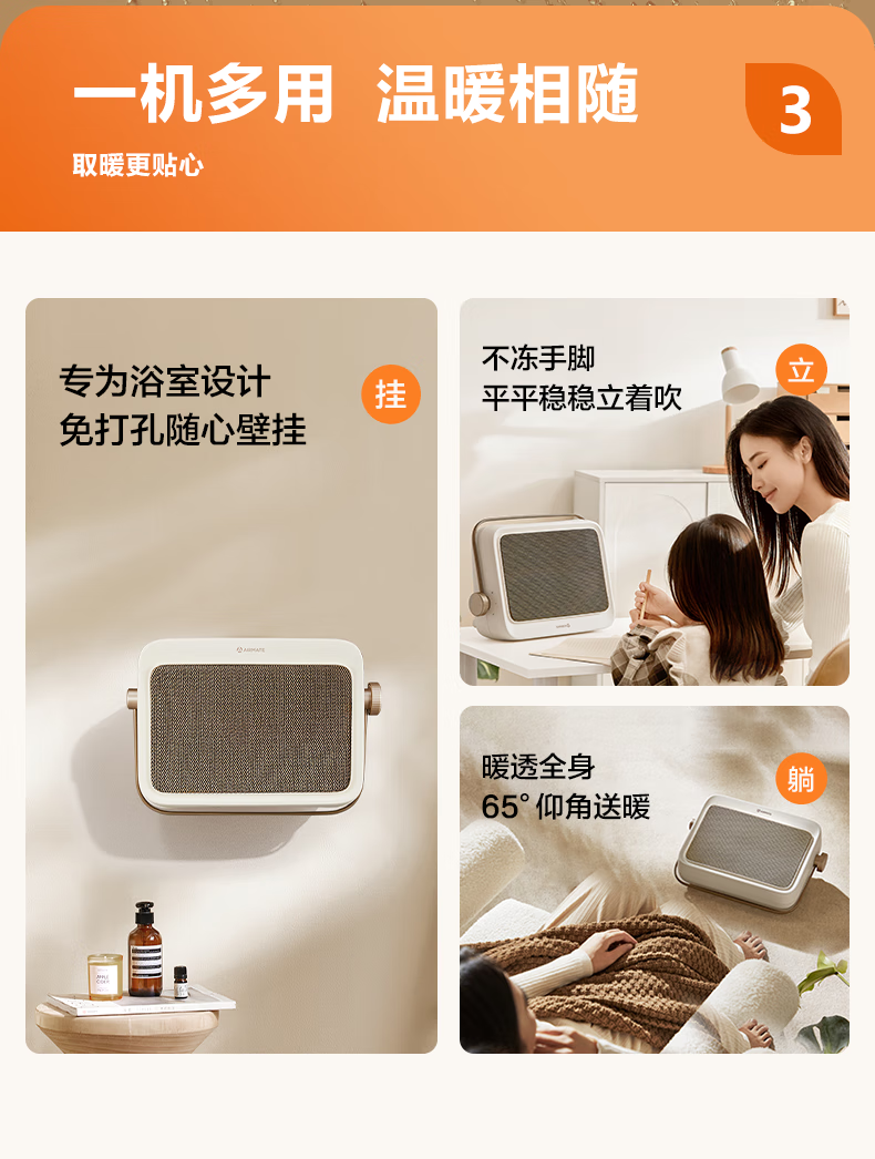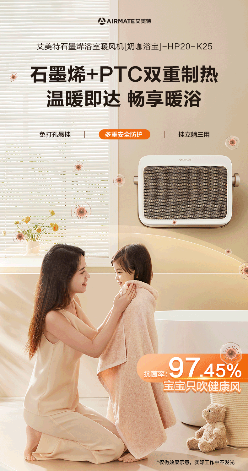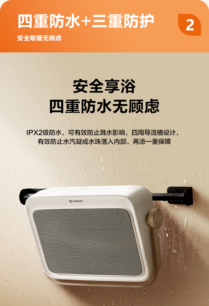 艾美特(AIRMATE)暖风机浴室浴霸石墨烯取暖器家用卧室壁挂式电暖器居浴两用防水节能免安装挂立式加热器热风机 【石墨烯+陶瓷双重制热】浴室专用