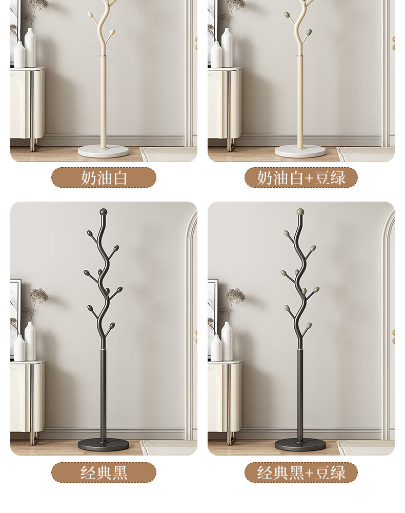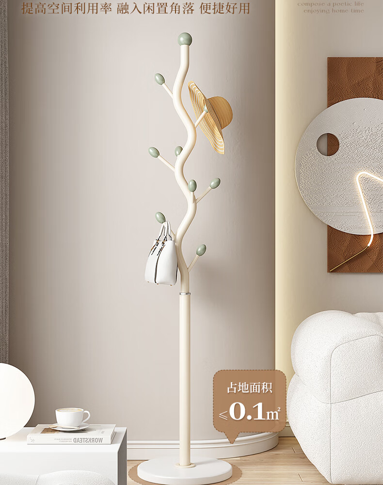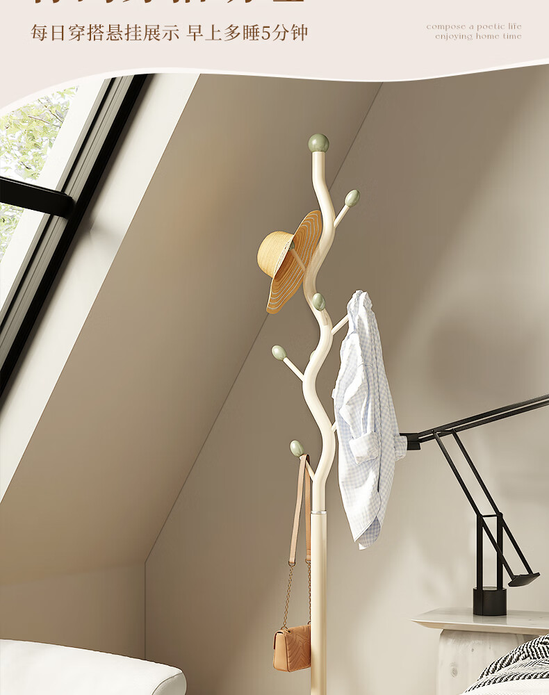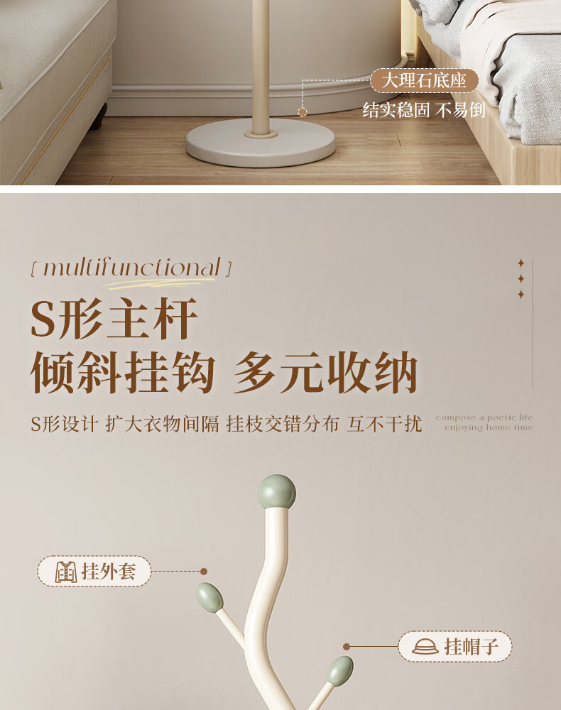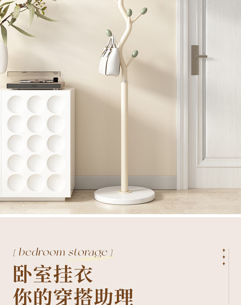 苏沐瞳奶油风网红衣帽架落地卧室挂衣架简约家用立式衣架室内衣服收纳架 奶油白支架+豆绿色挂钩-白色岩板