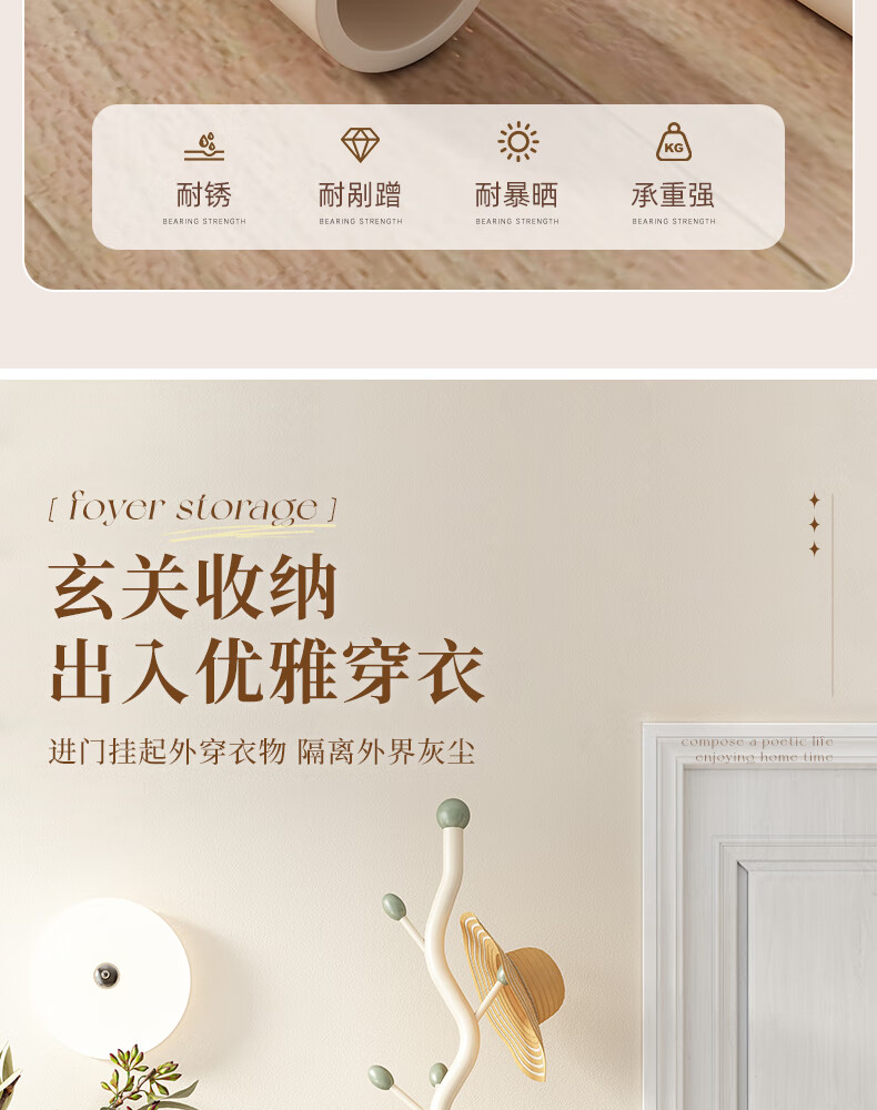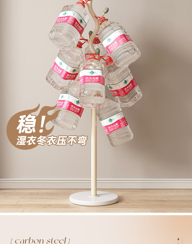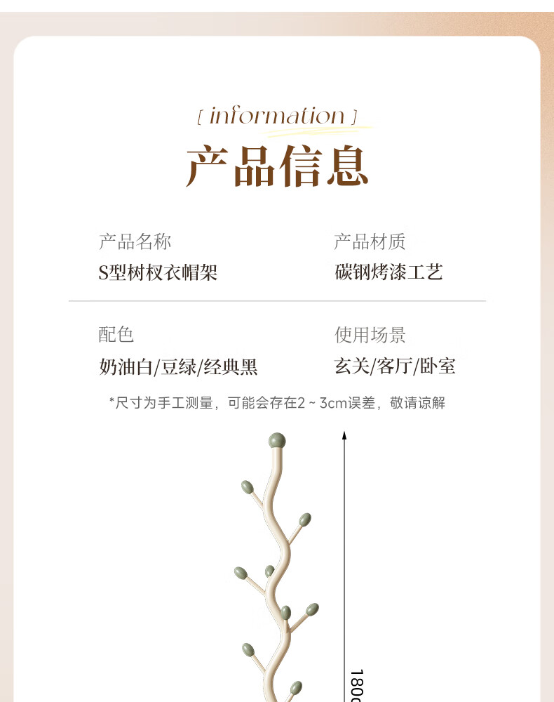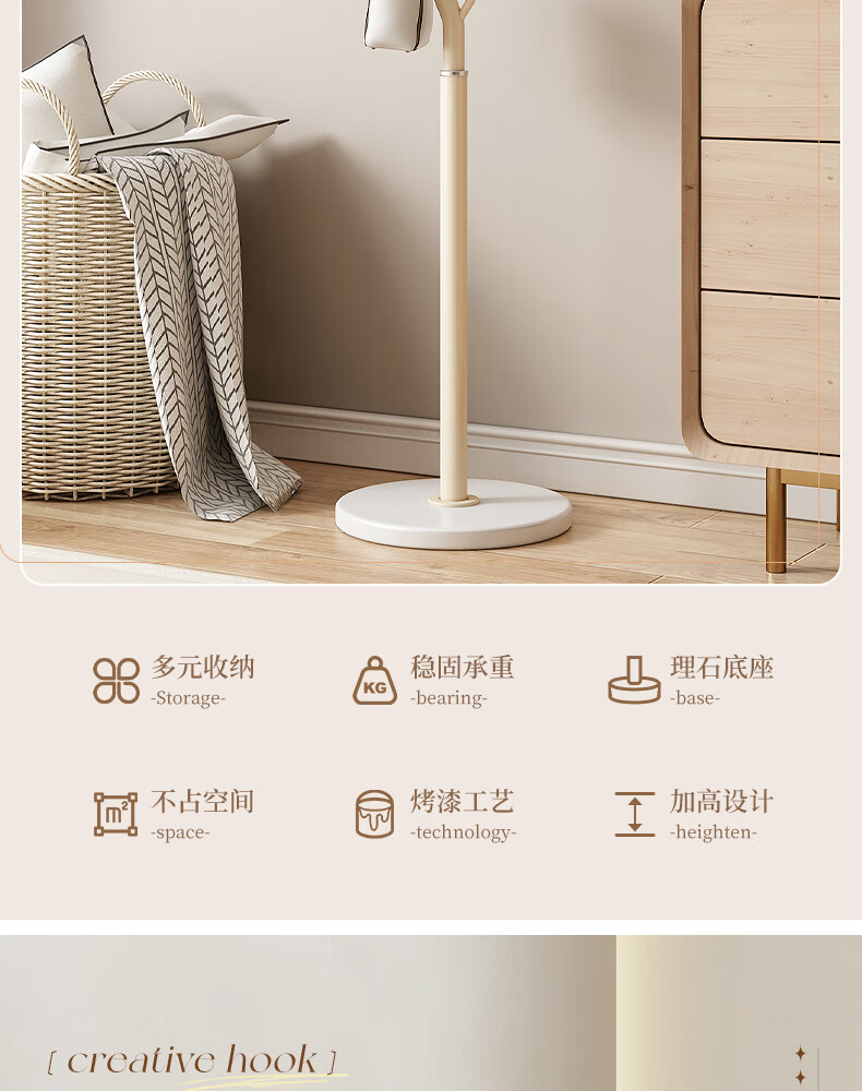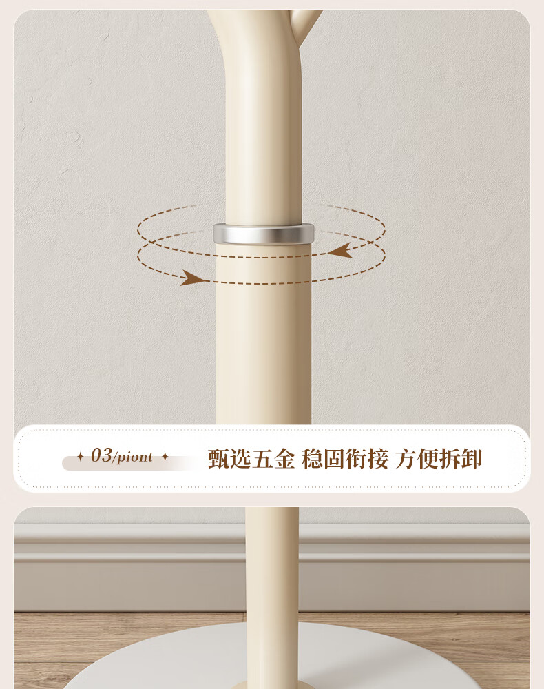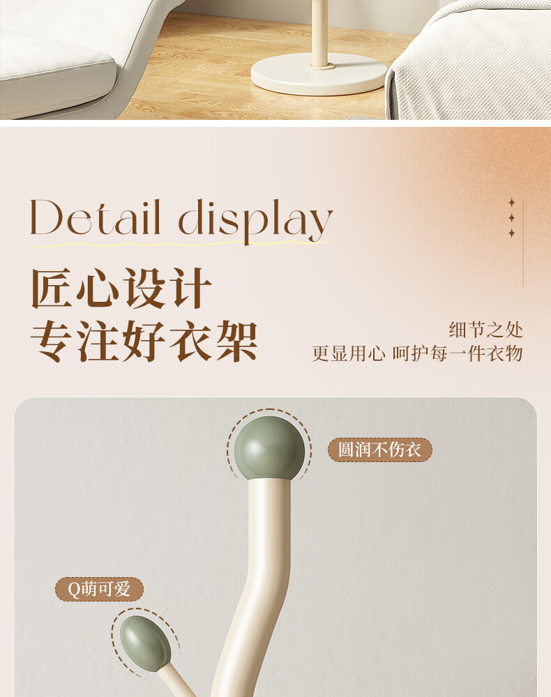 苏沐瞳奶油风网红衣帽架落地卧室挂衣架简约家用立式衣架室内衣服收纳架 奶油白支架+豆绿色挂钩-白色岩板