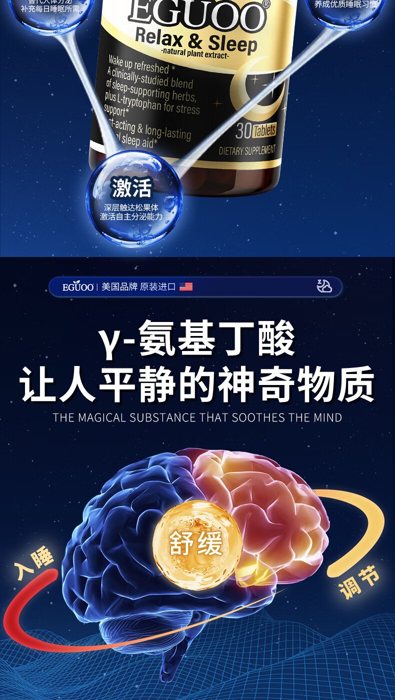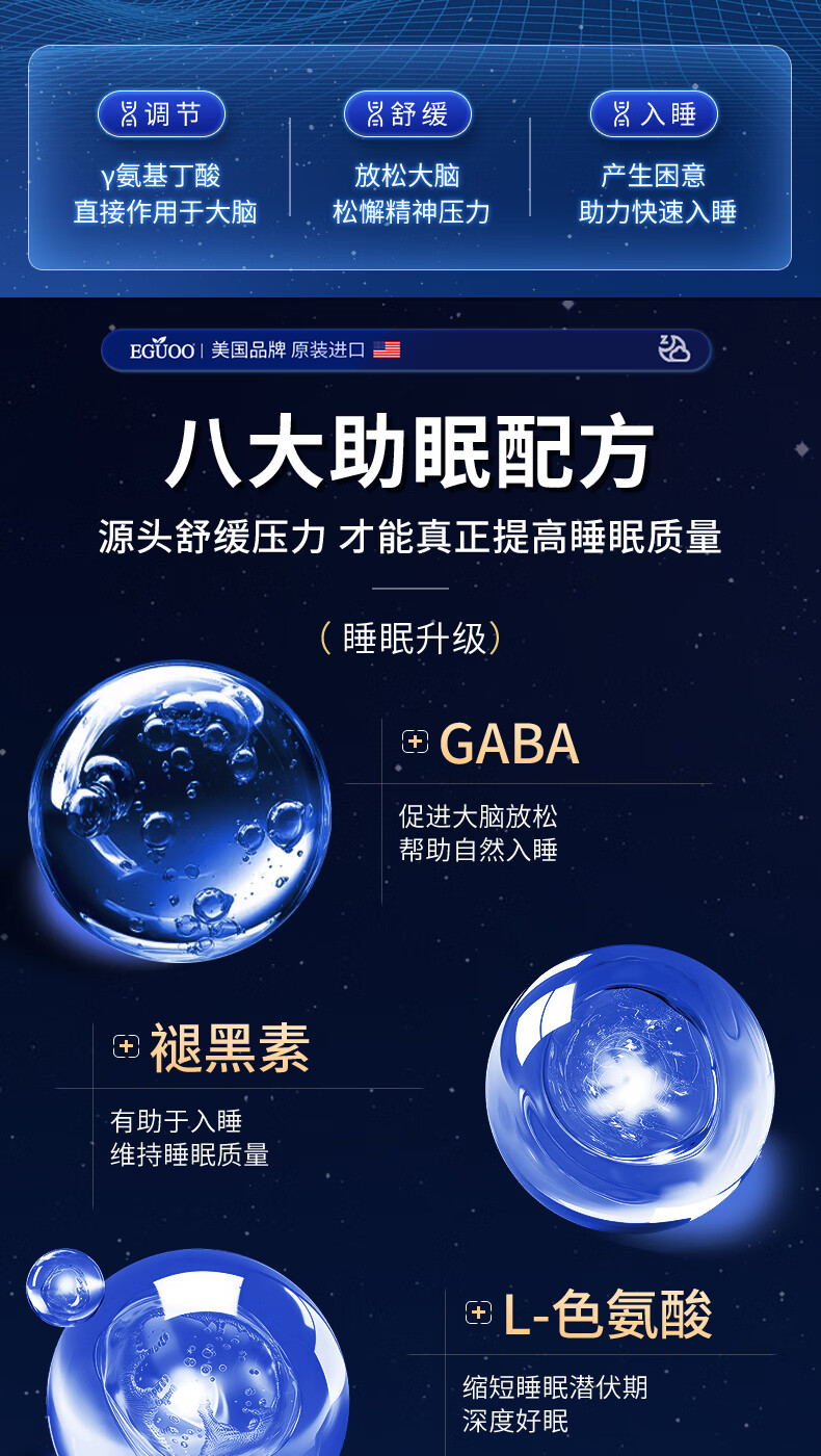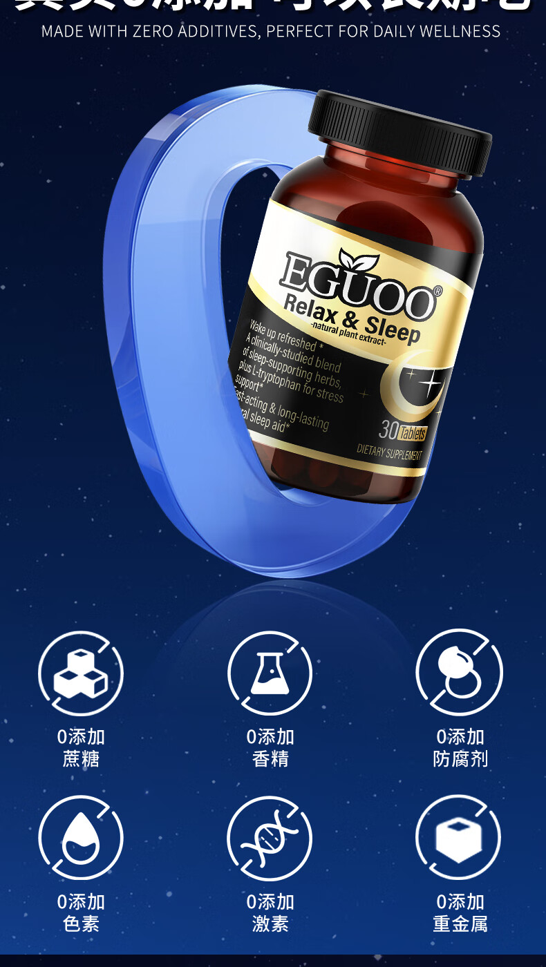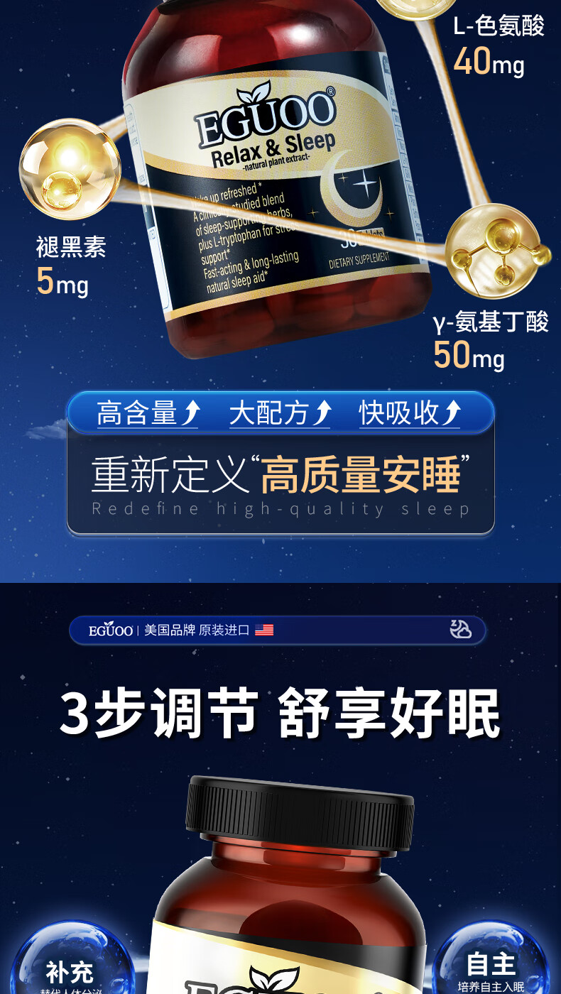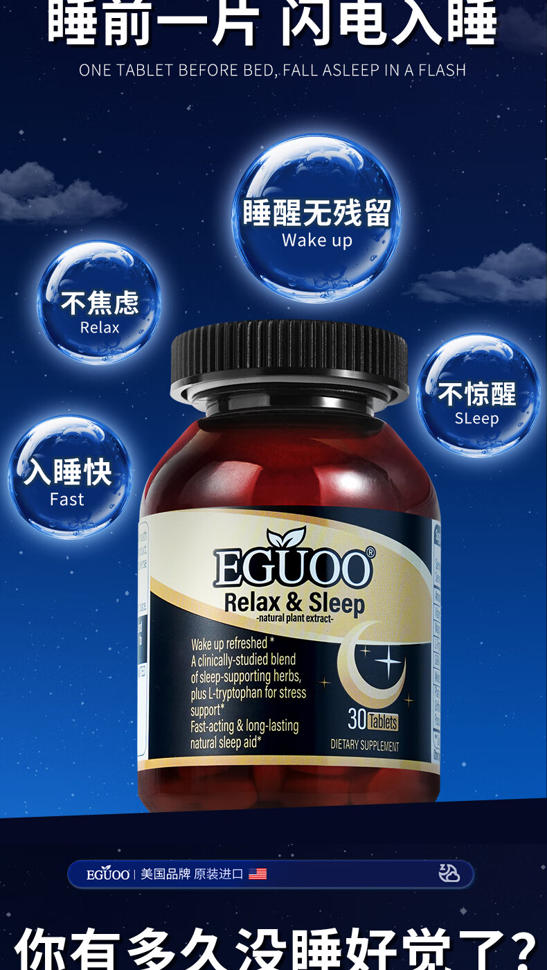 EGUOO进口睡眠片褪黑素维生素睡眠失眠成人助眠植物萃取缓解焦虑1瓶装