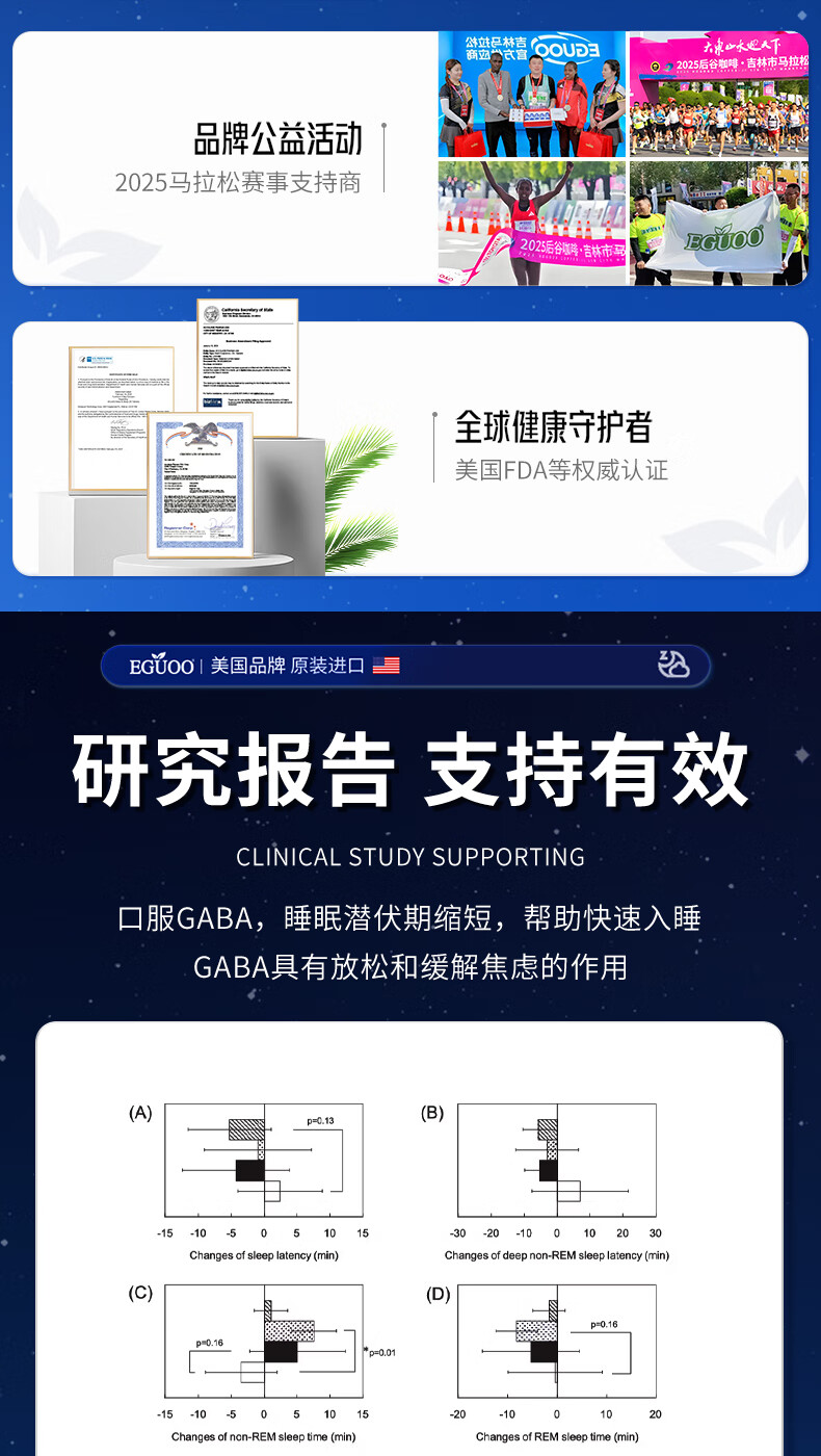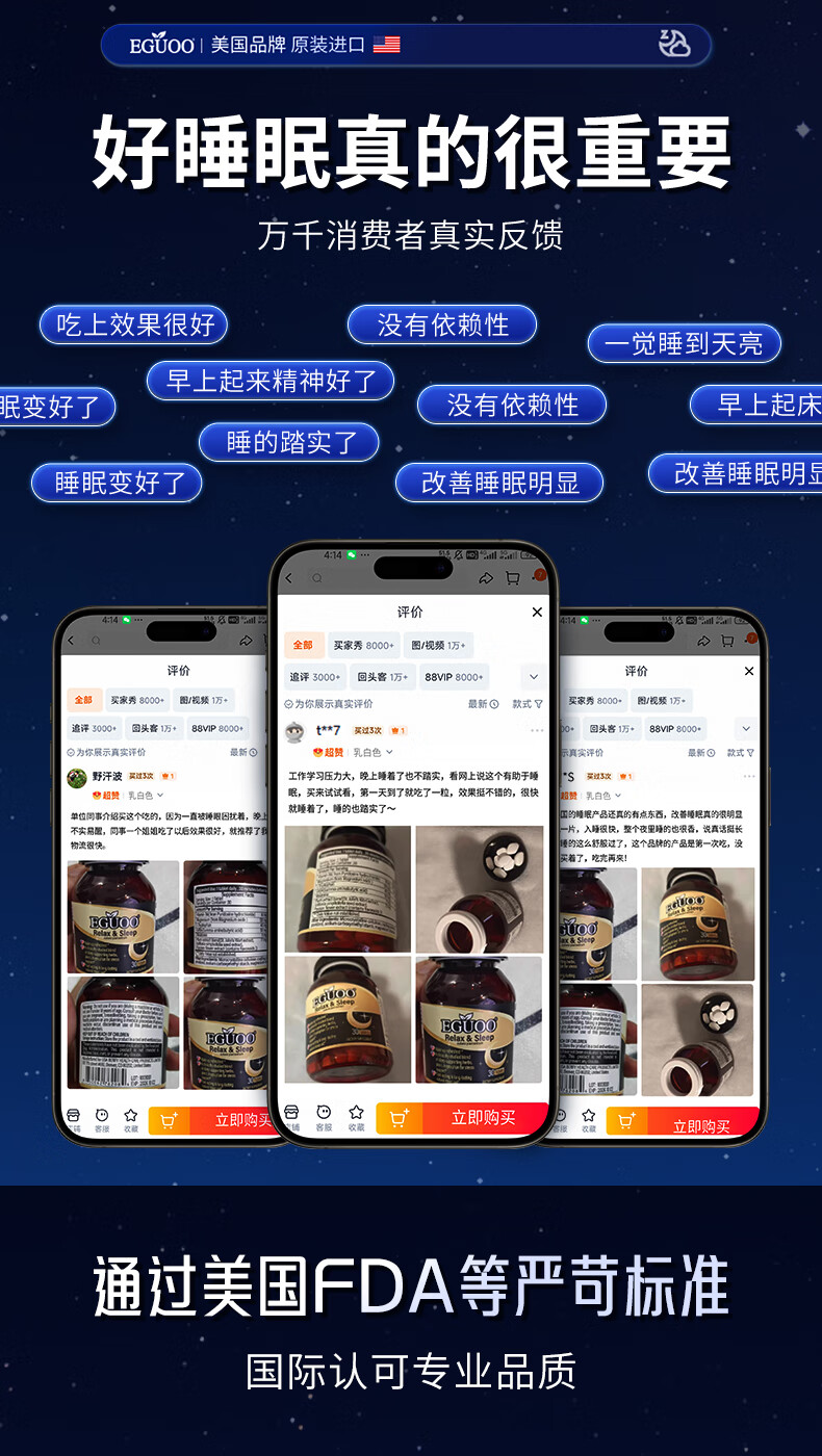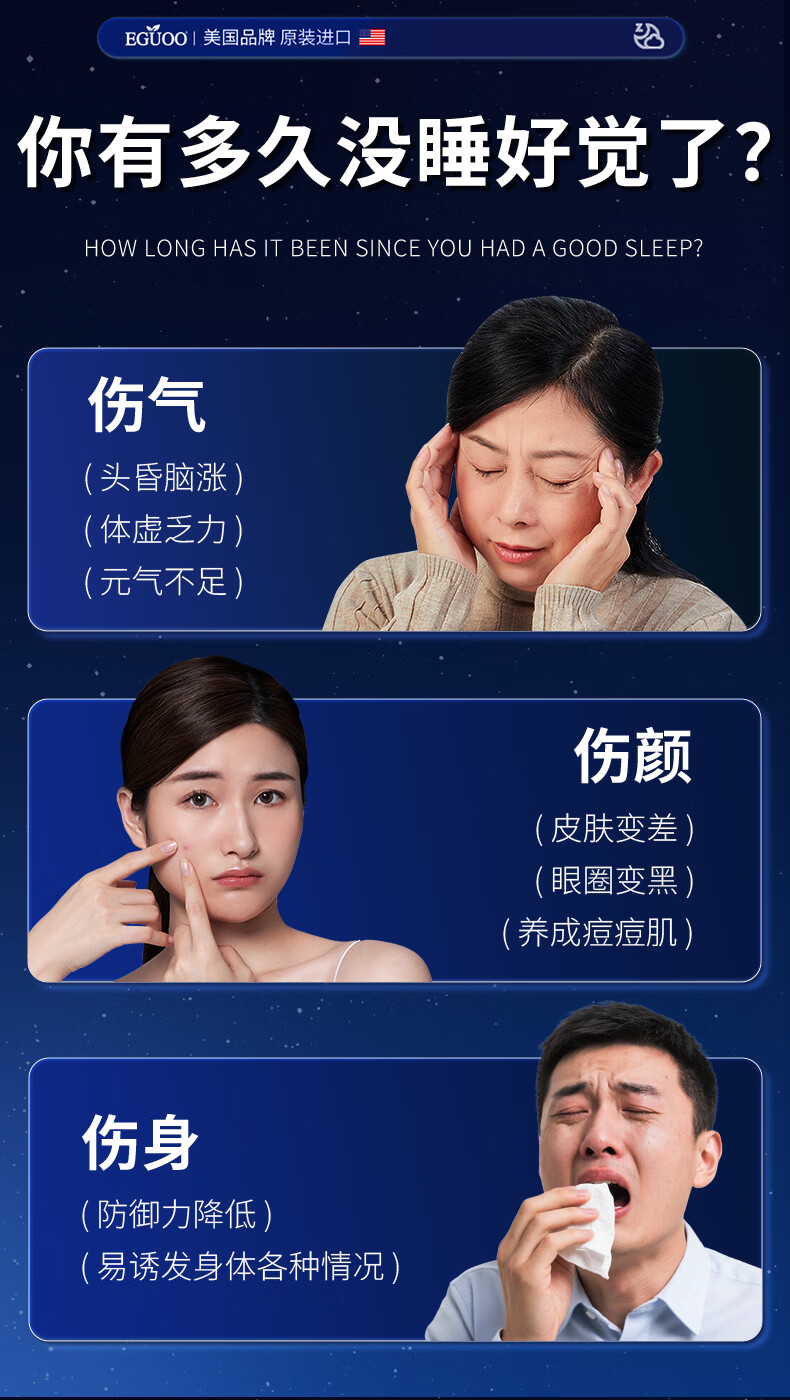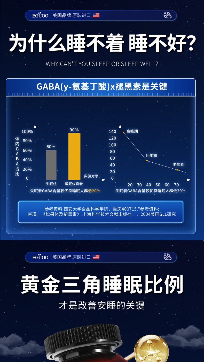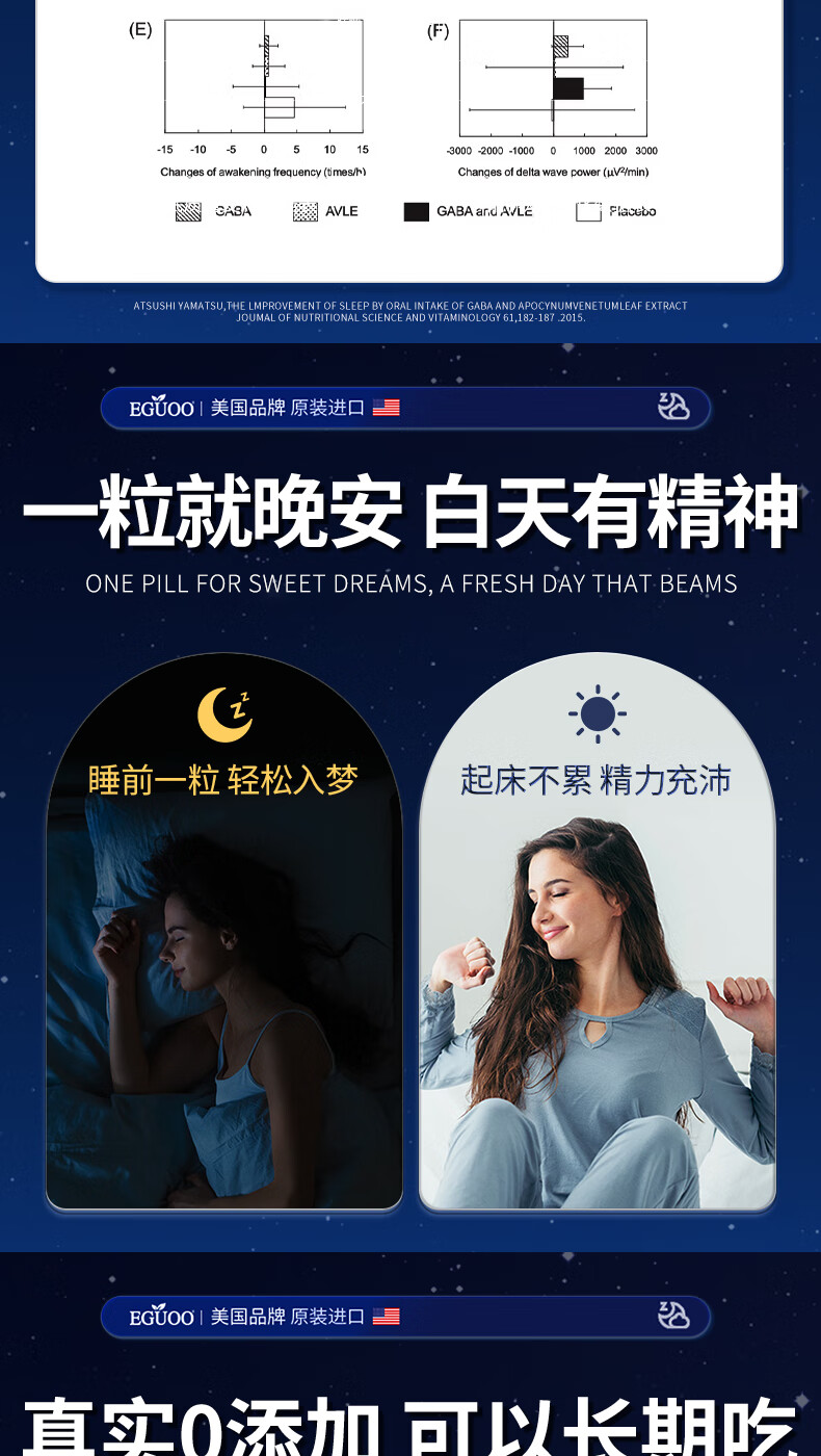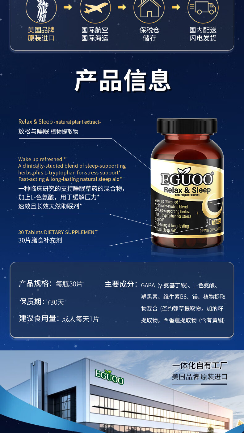EGUOO进口睡眠片褪黑素维生素睡眠失眠成人助眠植物萃取缓解焦虑1瓶装