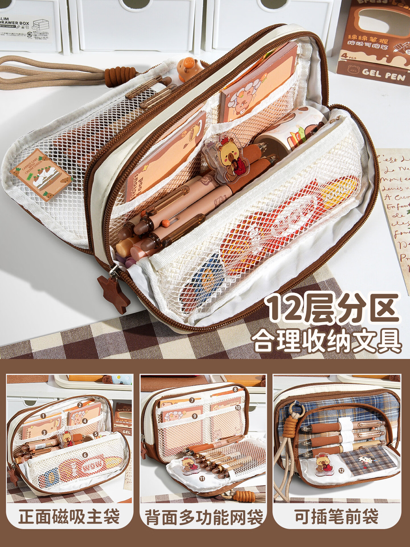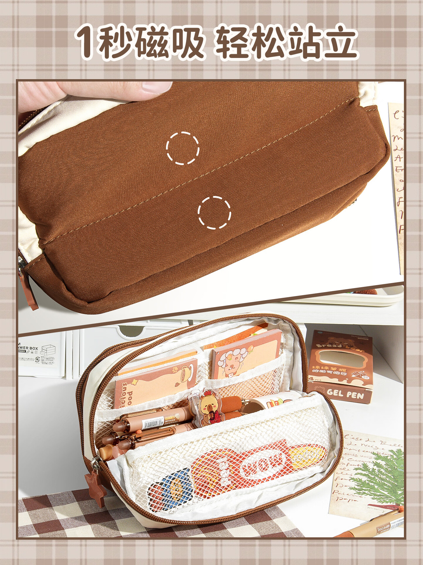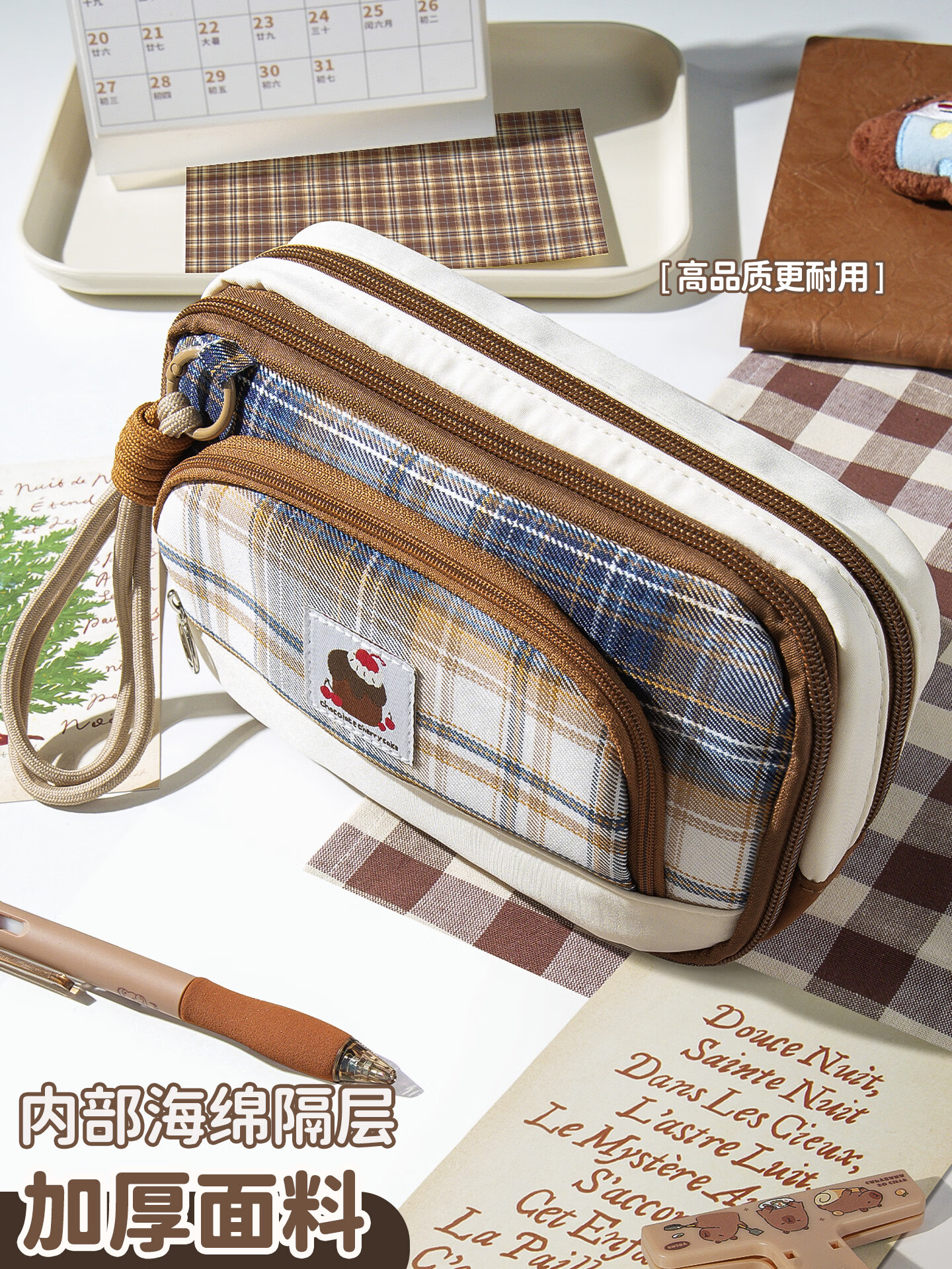 语季格纹加厚笔袋2026新款女生高颜值ins风男孩大容量超火多层文具袋小众不撞款学霸磁吸便携立式笔袋 【格纹蛋糕】多层磁吸可立