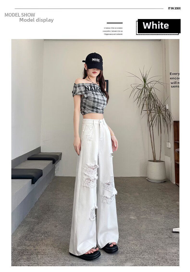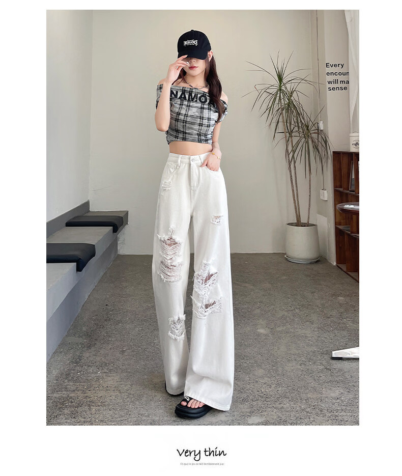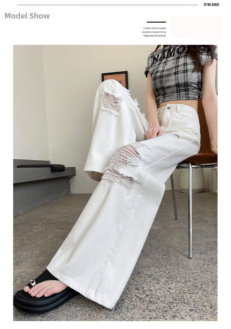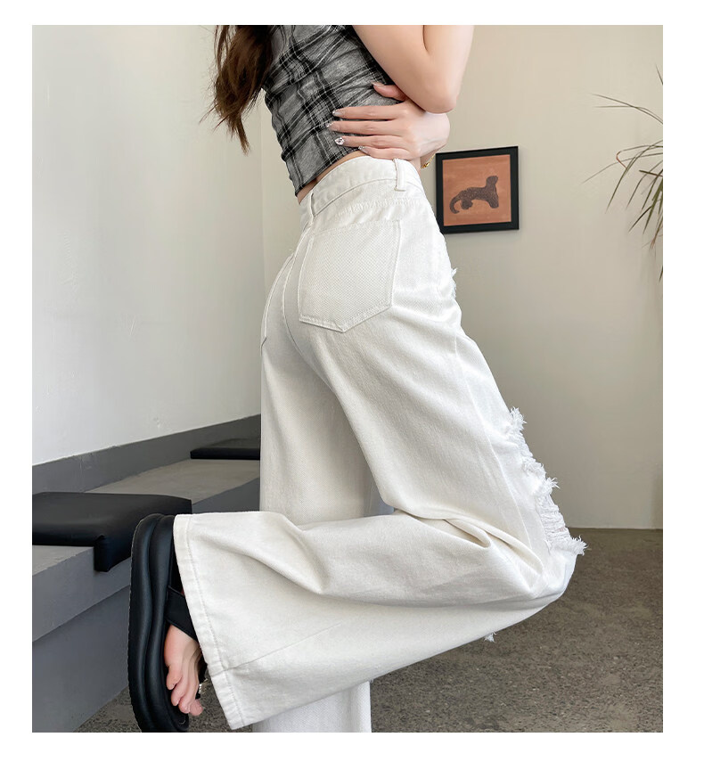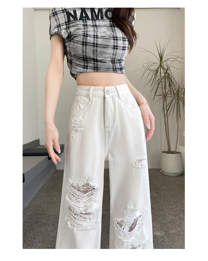 MODX2026夏季女性蕾丝破洞牛仔裤高腰纤细宽松流行的白色阔腿裤 白色【长裤】 XS